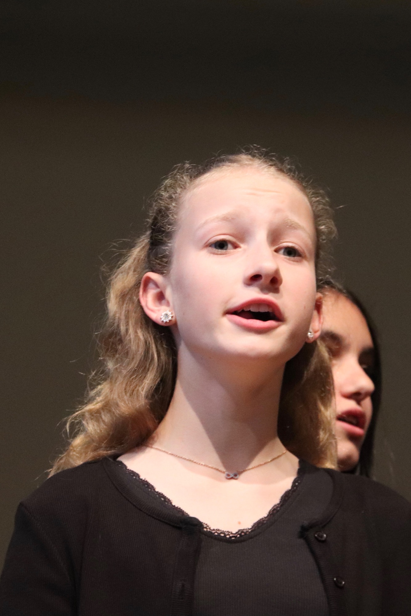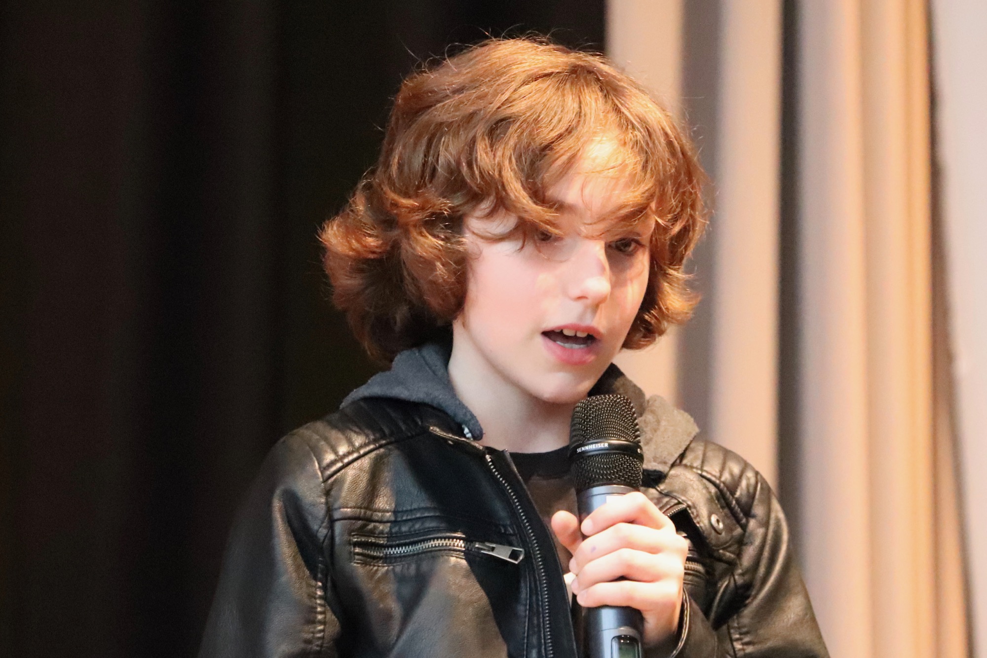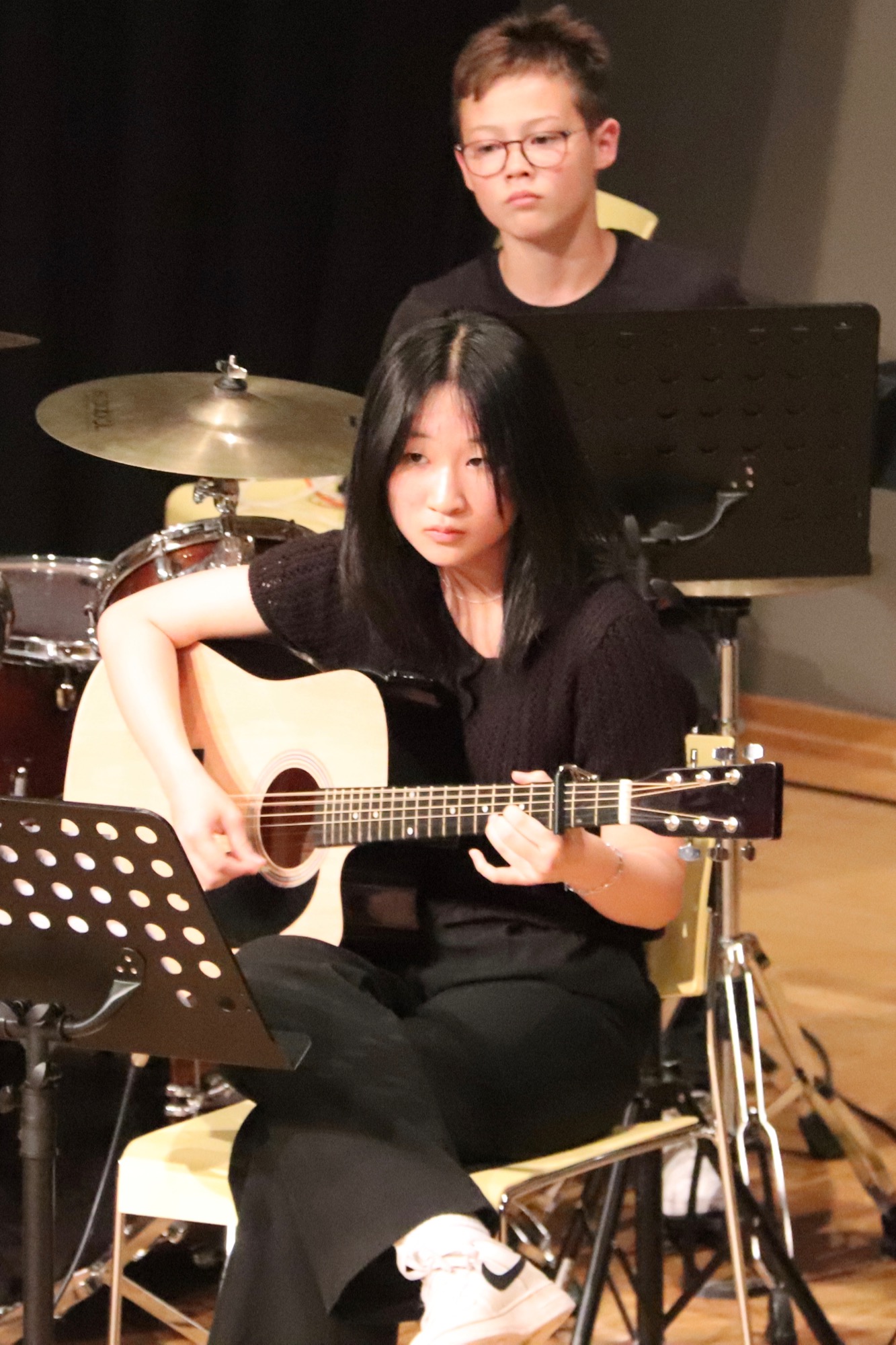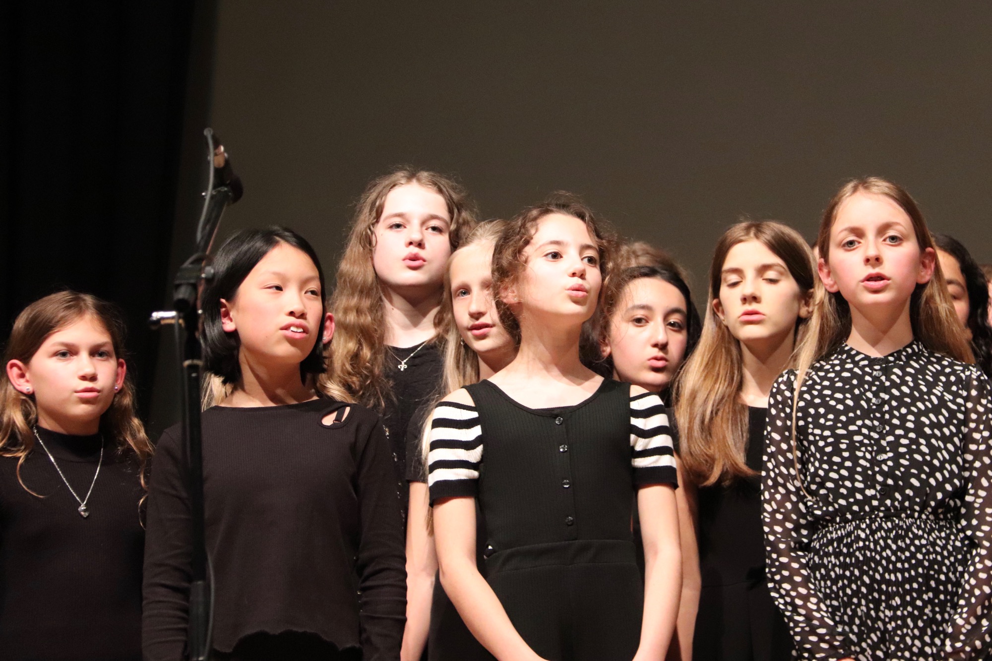 Die Gesangsgruppe der Klasse 5 brachte den Saal mit „Lemon Tree“ der deutschen Band Fools Garden zum Mitwippen, stimmte anschließend das Volkslied „Die Gedanken sind frei“ an und überraschte dann mit passender Kostümierung bei der Interpretation des Prinzen-Hits „Alles nur geklaut“, bei dem sogar massenweise Geldscheine durch die Luft flogen. Geleitet wurde die Gesangsgruppe von Frau Büttner, am Flügel begleitete Lucio Ramírez del Prado Vetter (Q2) – ebenso wie bei der Gesangsgruppe der Klasse 6. Die fortgeschrittenen Gesangstalente brachten „Für immer Frühling“ von Soffie, „Imagine“ von John Lennon und den Evergreen „California Dreamin’“ von The Mamas and the Papas zum Vortrag. Und die Mamas, Papas, Freunde, Großeltern und Lehrkräfte waren begeistert, was sie mit einem donnernden Applaus zum Ausdruck brachten.