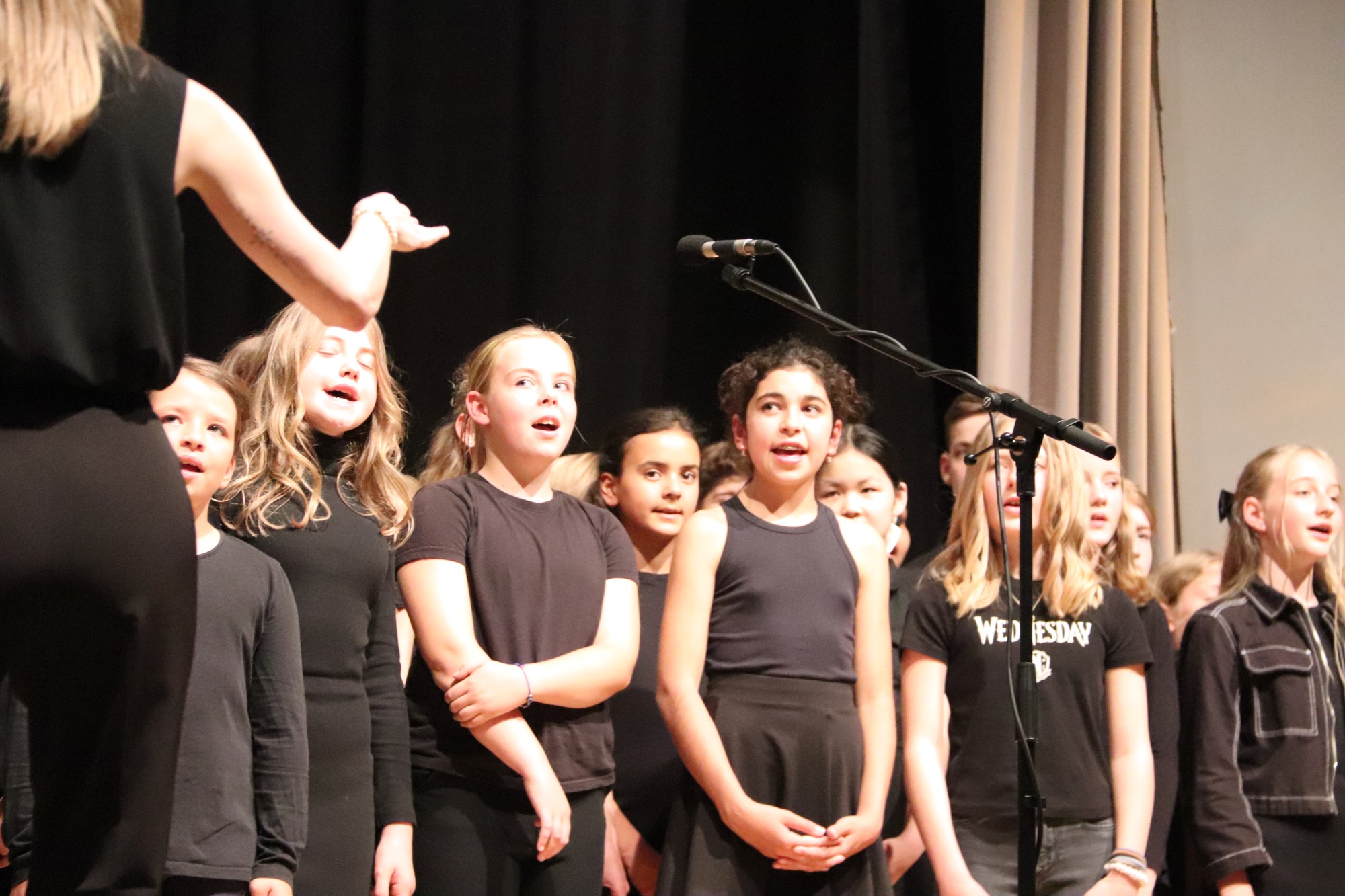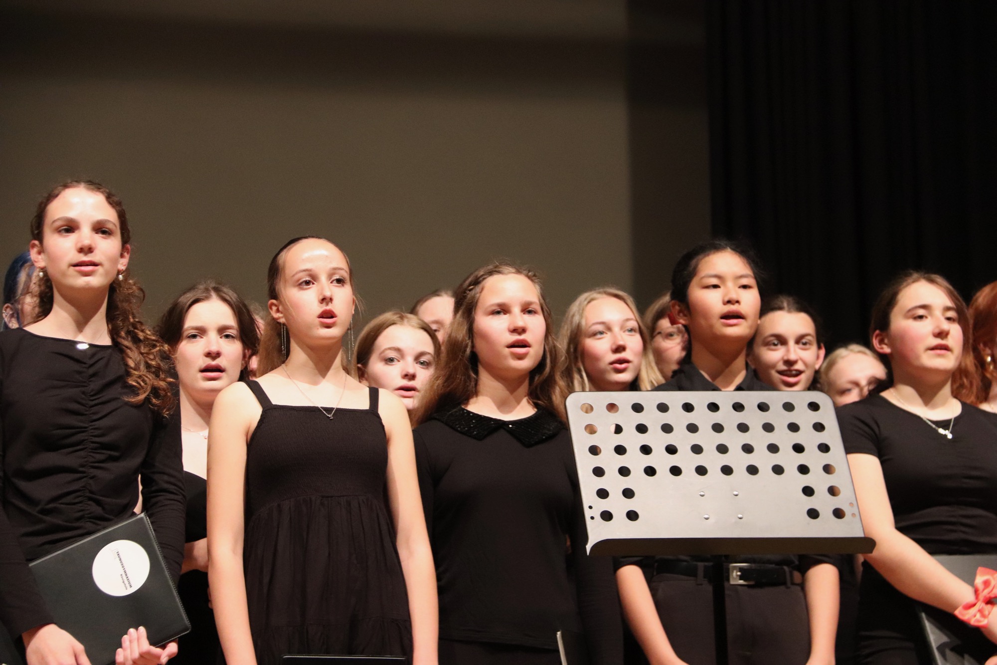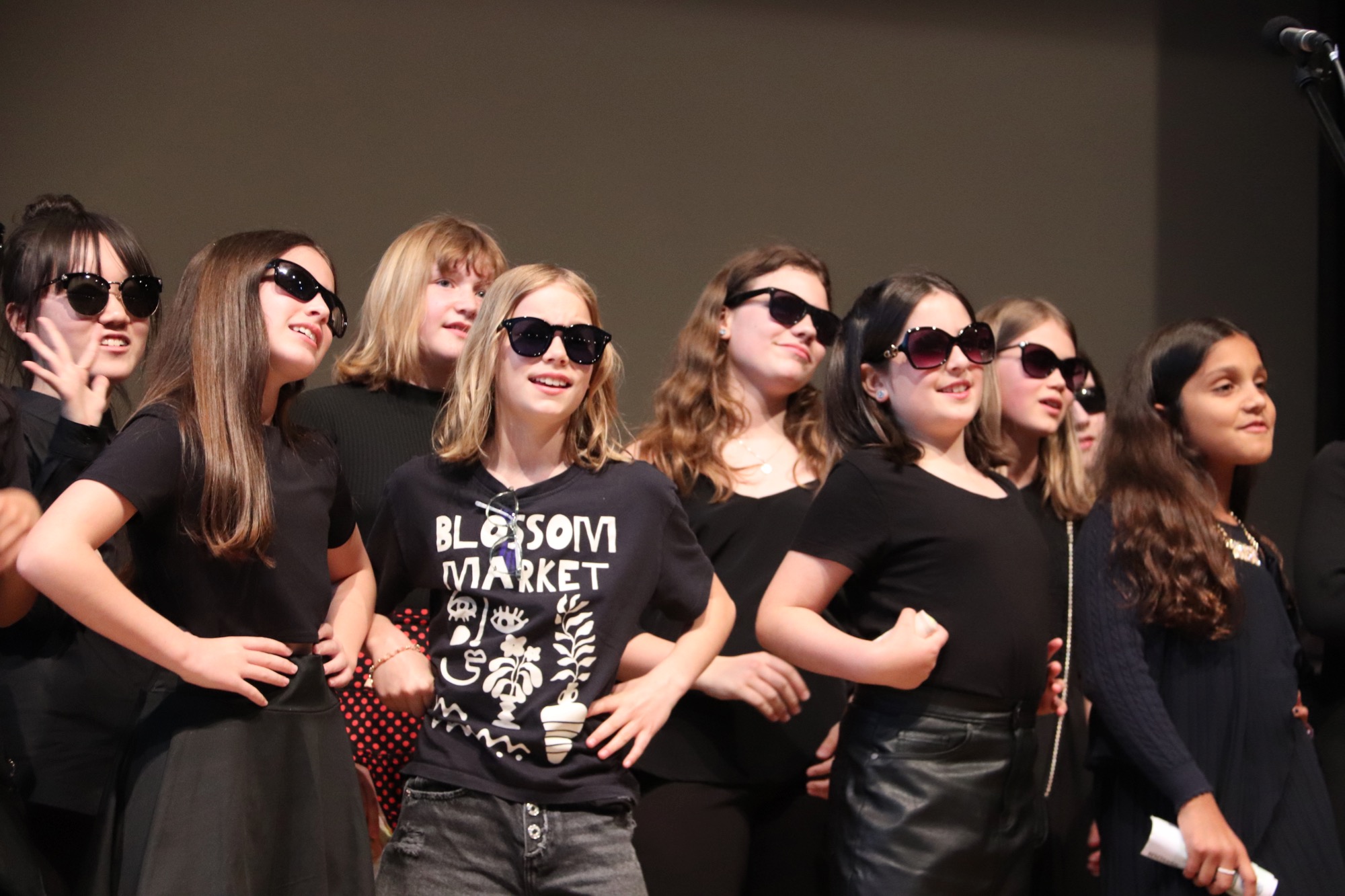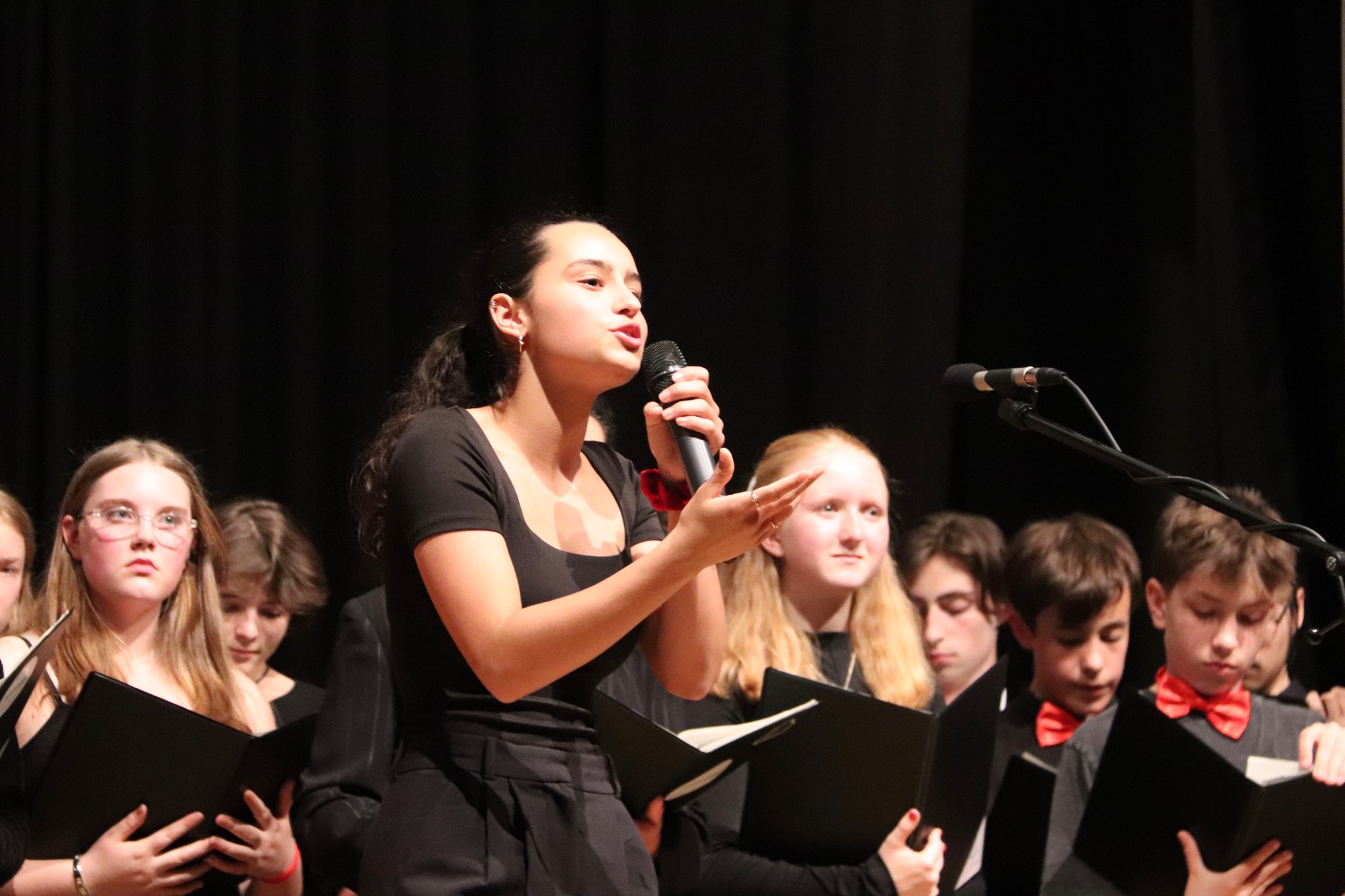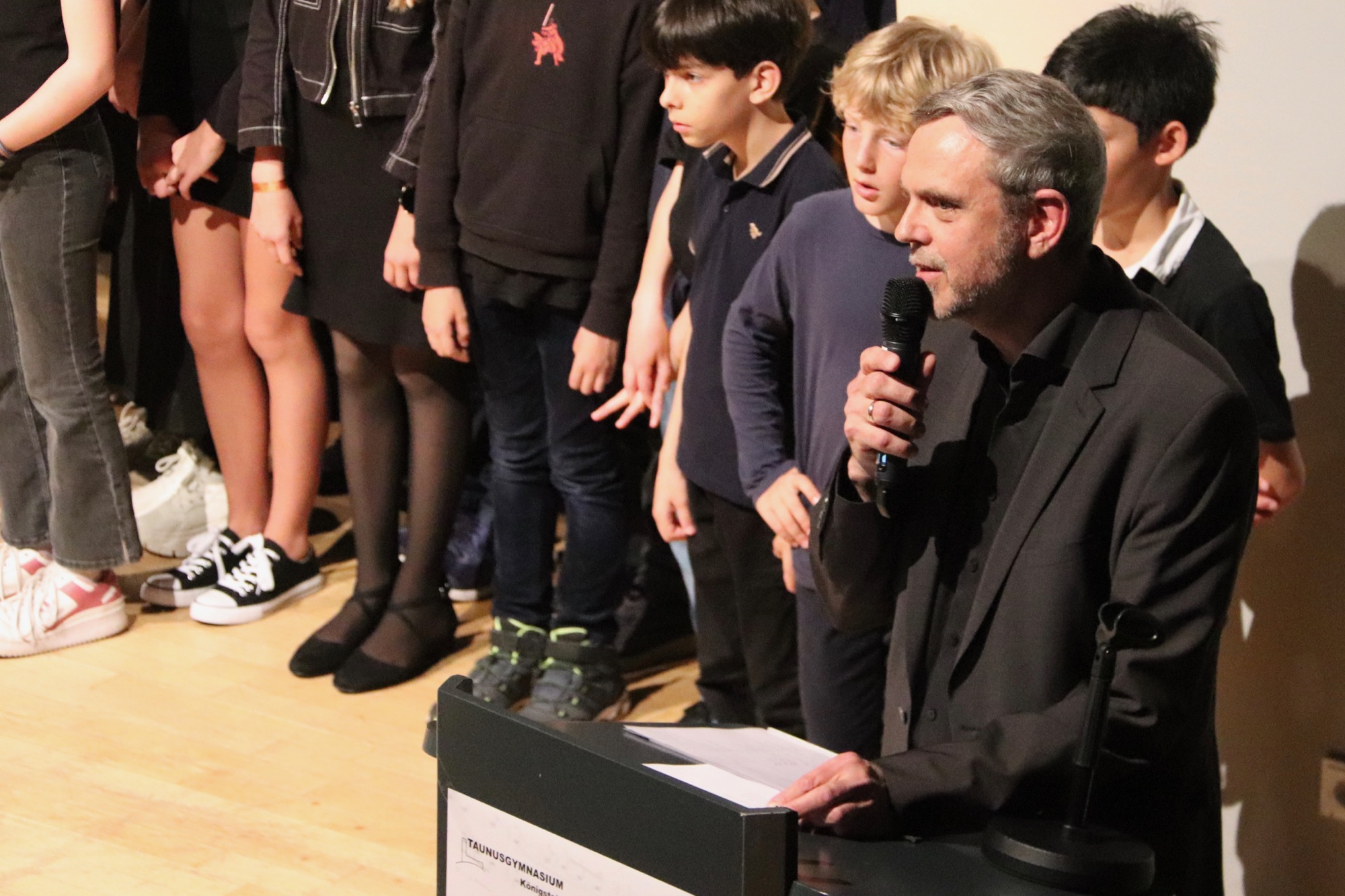 Der Chor der höchsten Jahrgangsstufen, „Taunus Tunes“, nahm nun unter Leitung von Herrn Franke die Bühne ein und ließ vier hochkarätig umgesetzte mehrstimmige Songs verlauten: den Traditional „Halleluja, Salvation and Glory“, den Bob-Marley-Song „One Love“ mit der Solistin Phawarie Emi Kanithasen (9f), den Song „A Million Dreams“ aus dem Film „The Greatest Showman“ mit der Solistin Soraya Wingenter (8f) sowie „Go the Distance“ von Alan Menken. Dabei wurden wunderbare Klangwelten entfesselt, die von der Schulband und dem Show-Ensemble noch wirkungsvoll unterstrichen wurden.