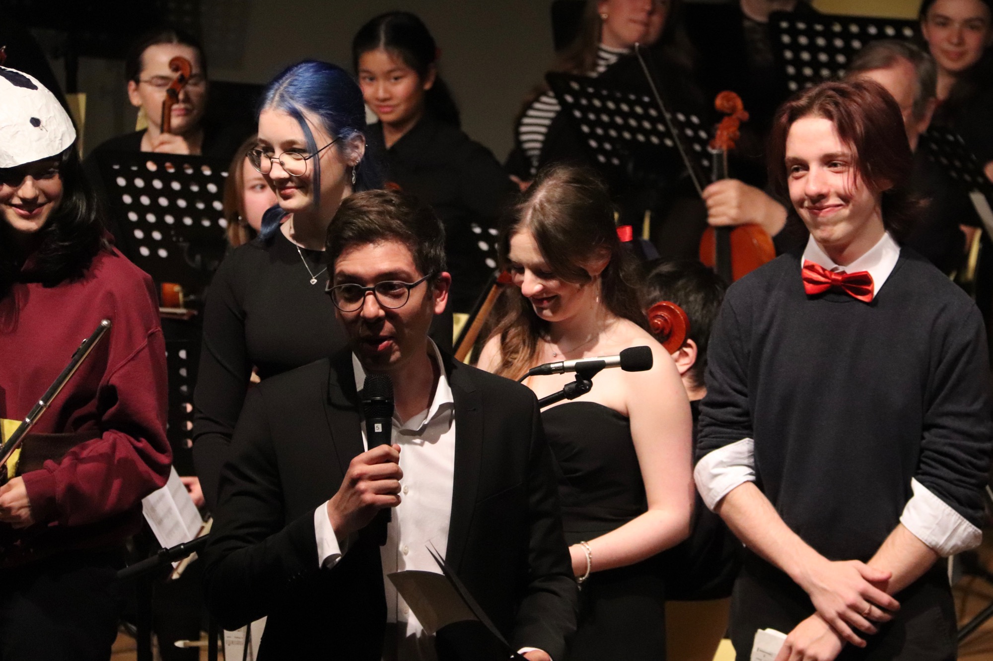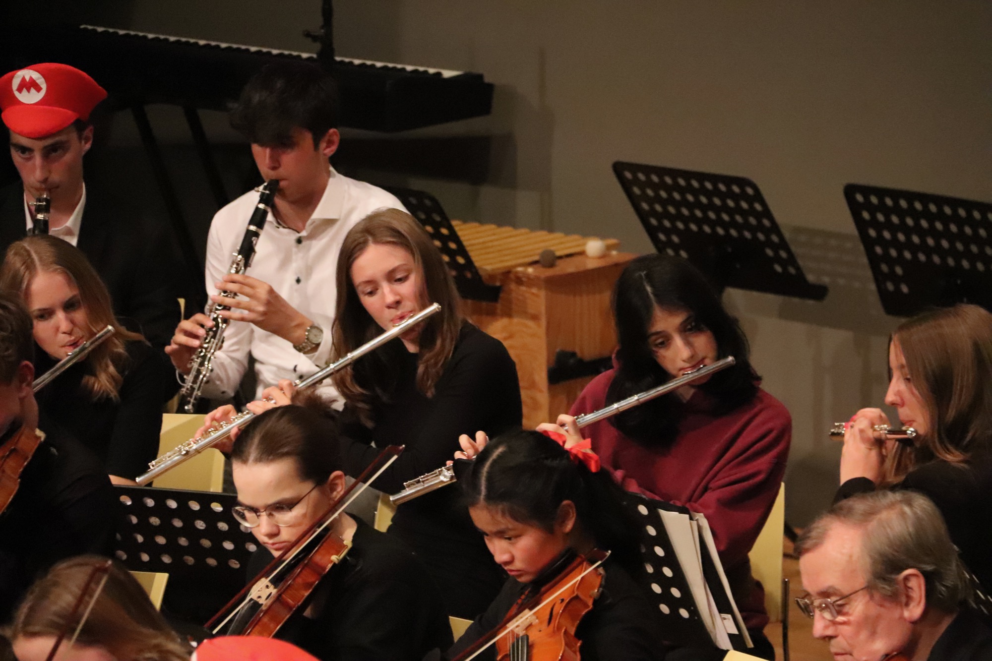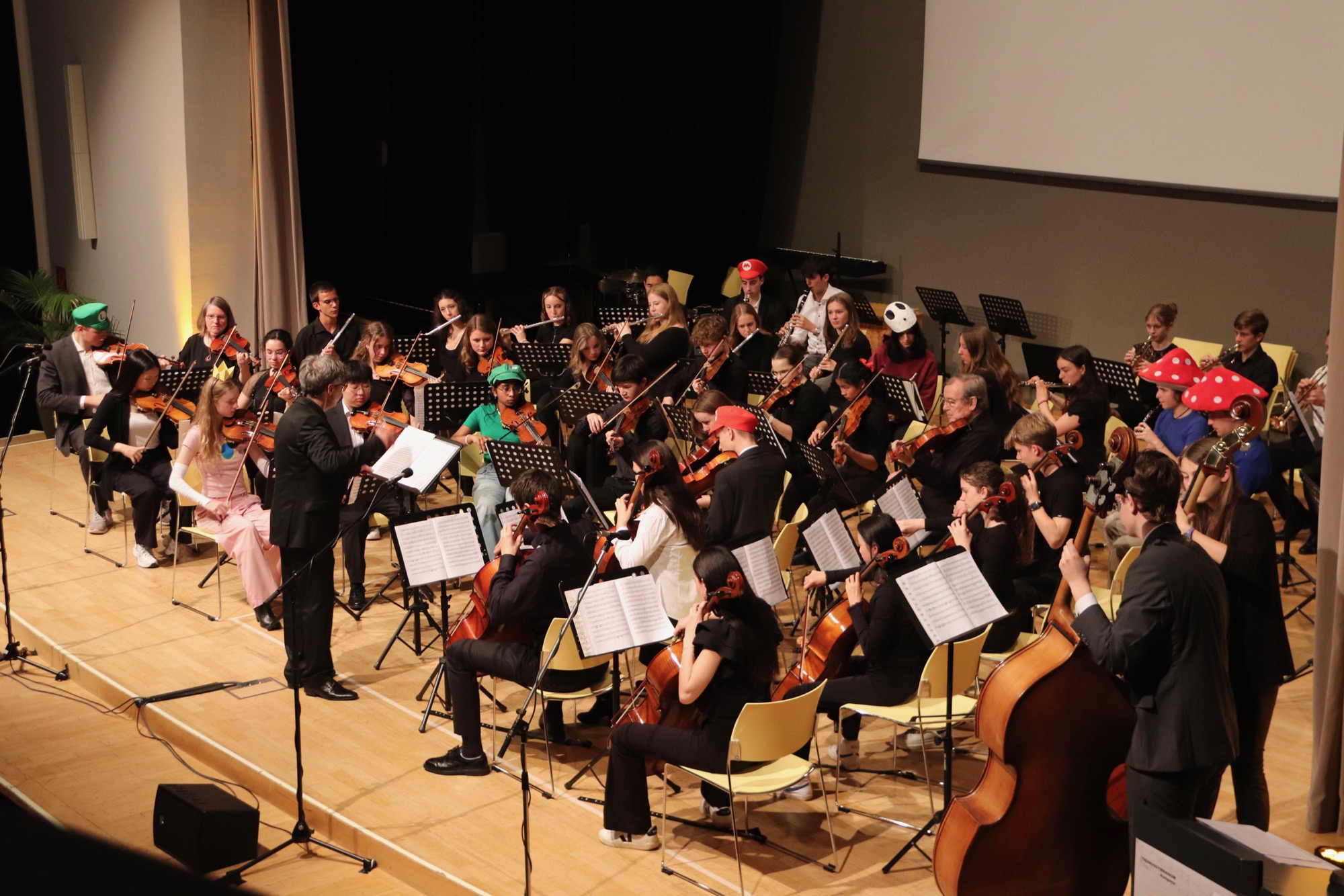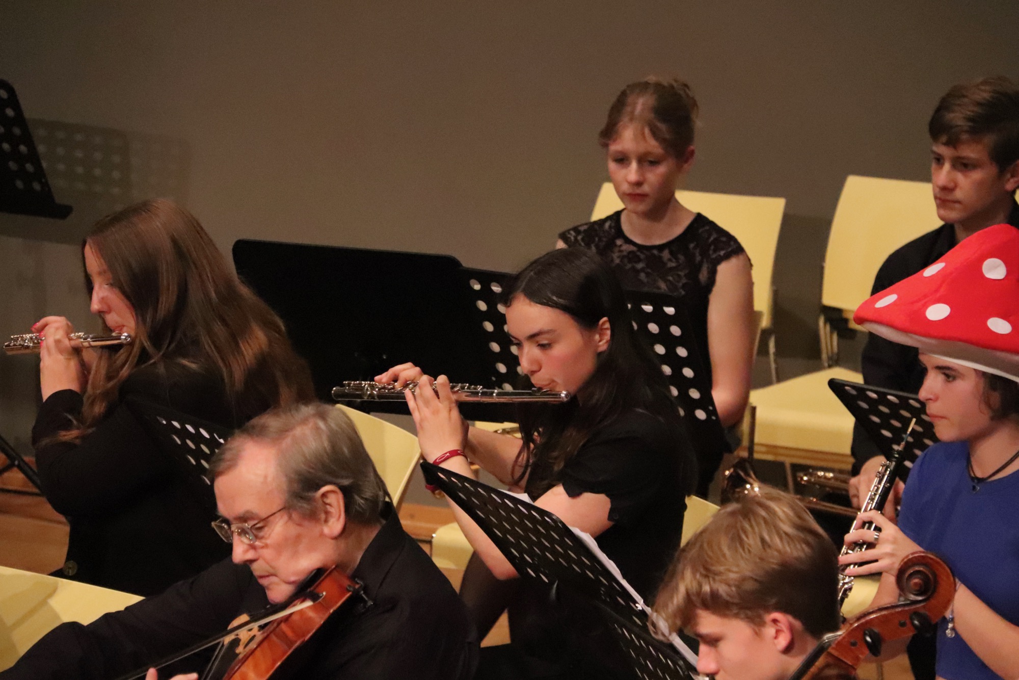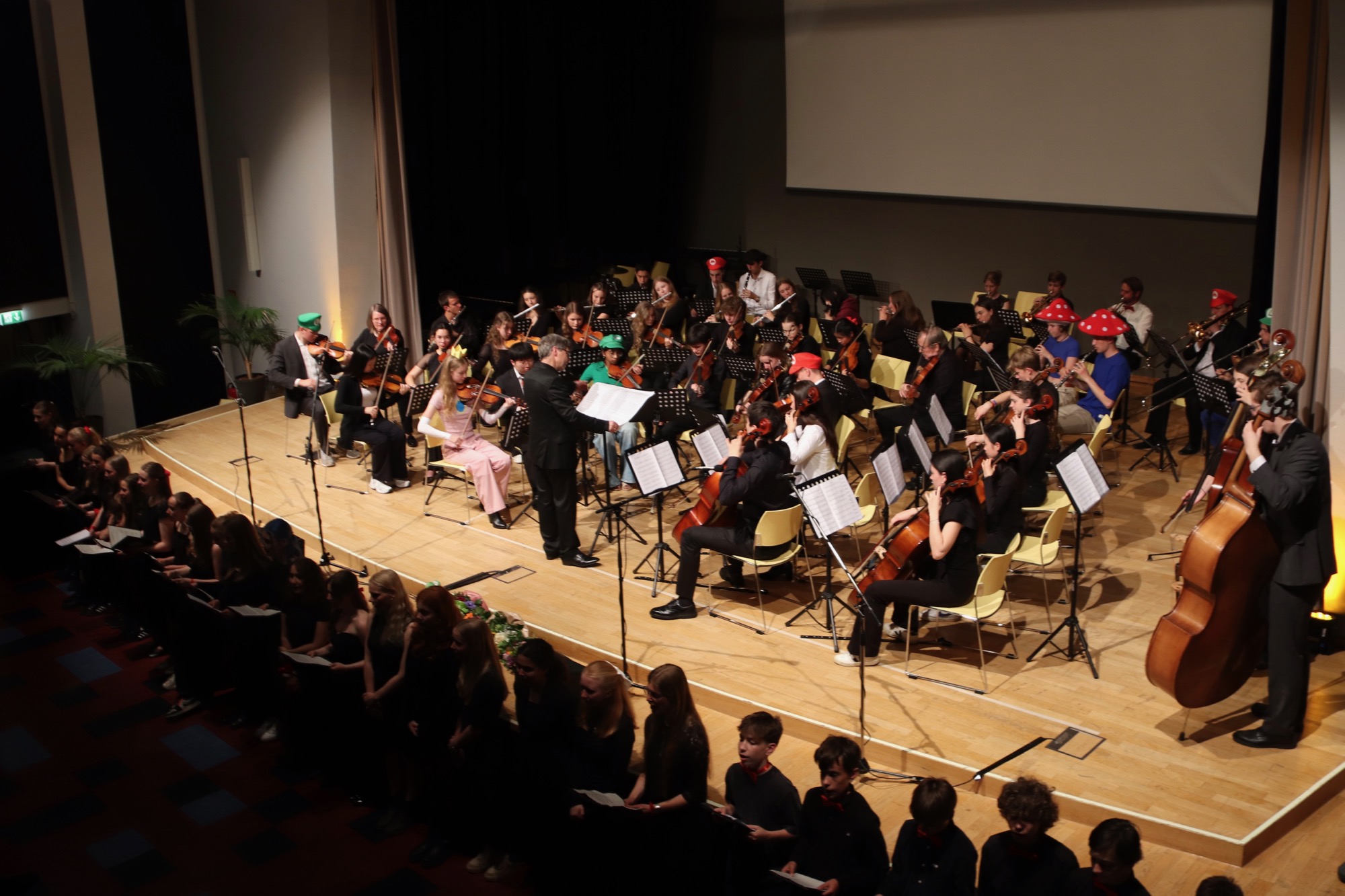Der zweite Abend wurde von den Orchestern und Chören der höheren Jahrgangsstufen gestaltet. Den Anfang machte das Kleine Orchester unter Leitung von Frau Unterlerchner, das drei Stücke aus „Le Petit Carnaval des Animaux“ von Camille Saint-Saëns und drei Stücke aus „Aladdin“ von Alan Menken spielte und damit das Publikum in seinen Bann zog.