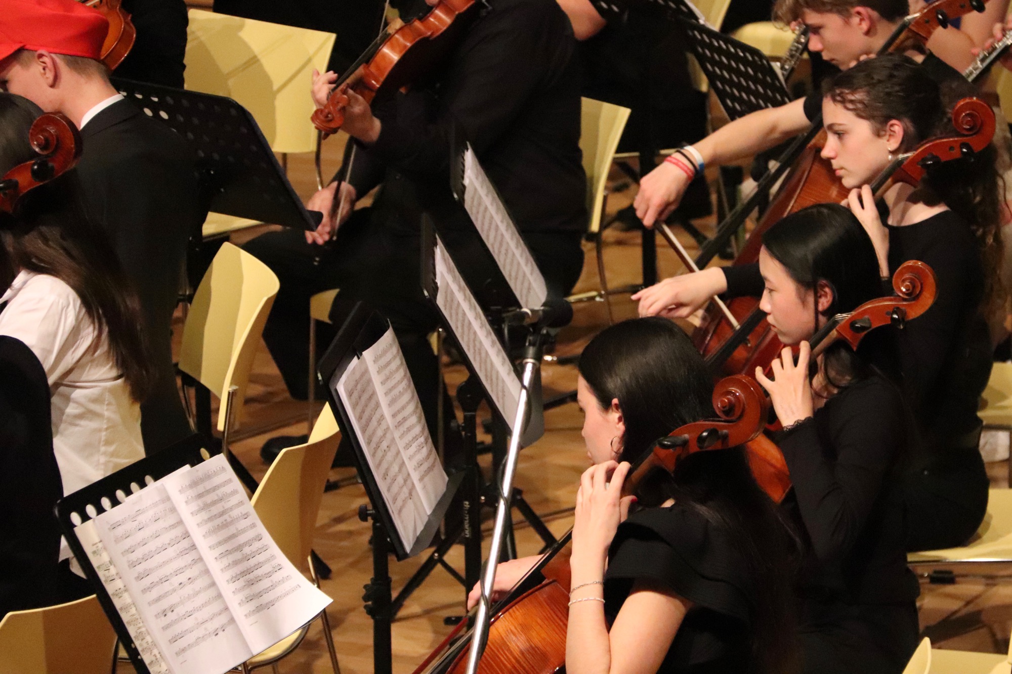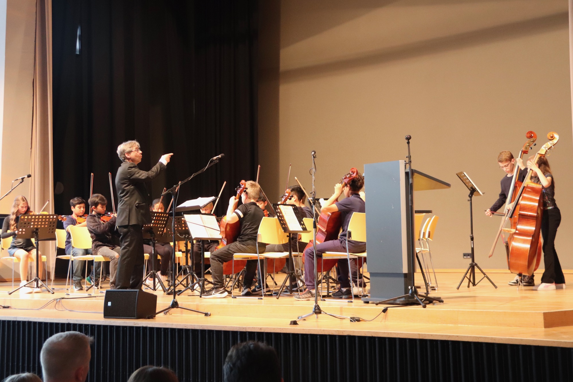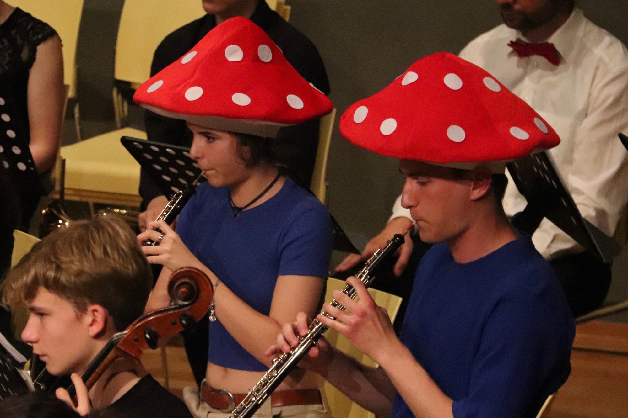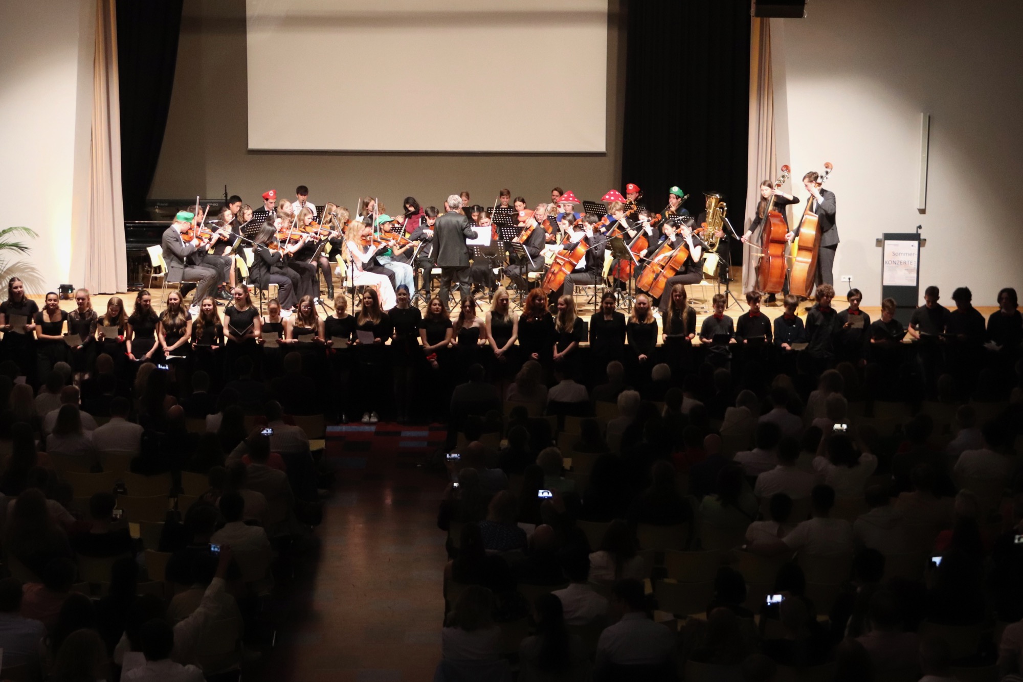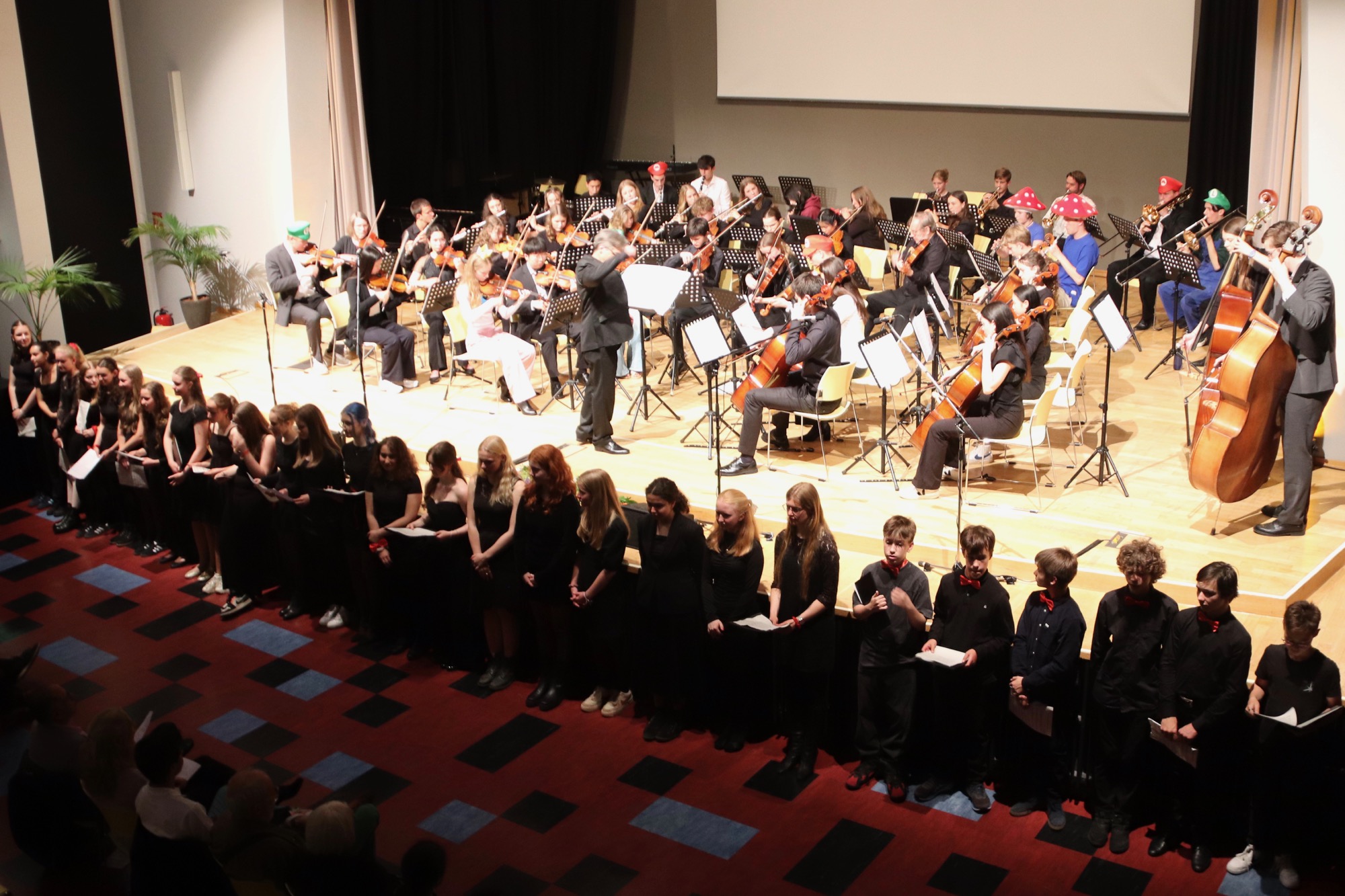 Der zweite Abend wurde von den Orchestern und Chören der höheren Jahrgangsstufen gestaltet. Den Anfang machte das Kleine Orchester unter Leitung von Frau Unterlerchner, das drei Stücke aus „Le Petit Carnaval des Animaux“ von Camille Saint-Saëns und drei Stücke aus „Aladdin“ von Alan Menken spielte und damit das Publikum in seinen Bann zog.
