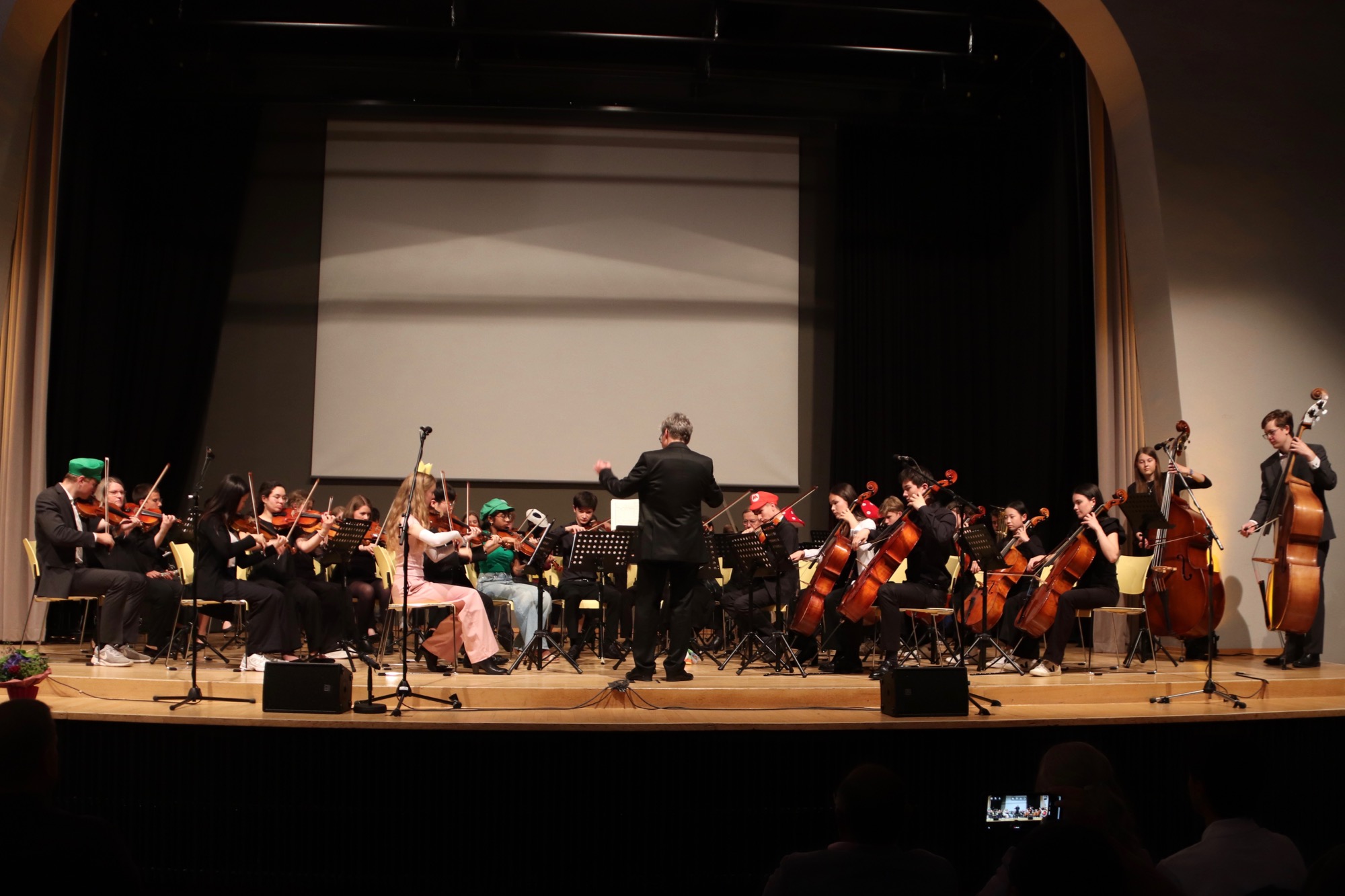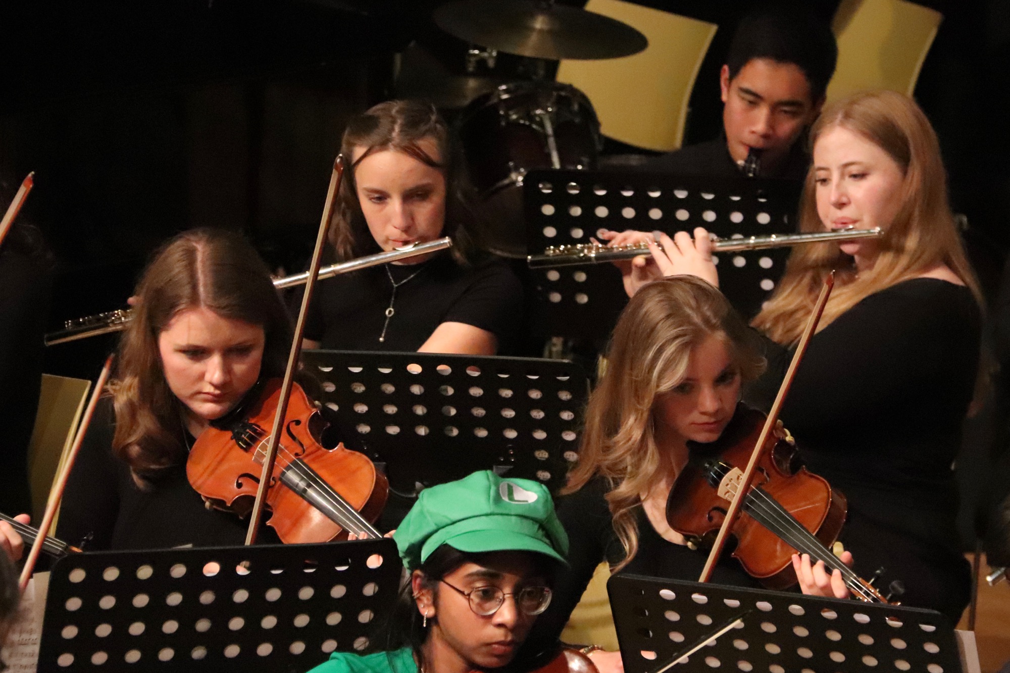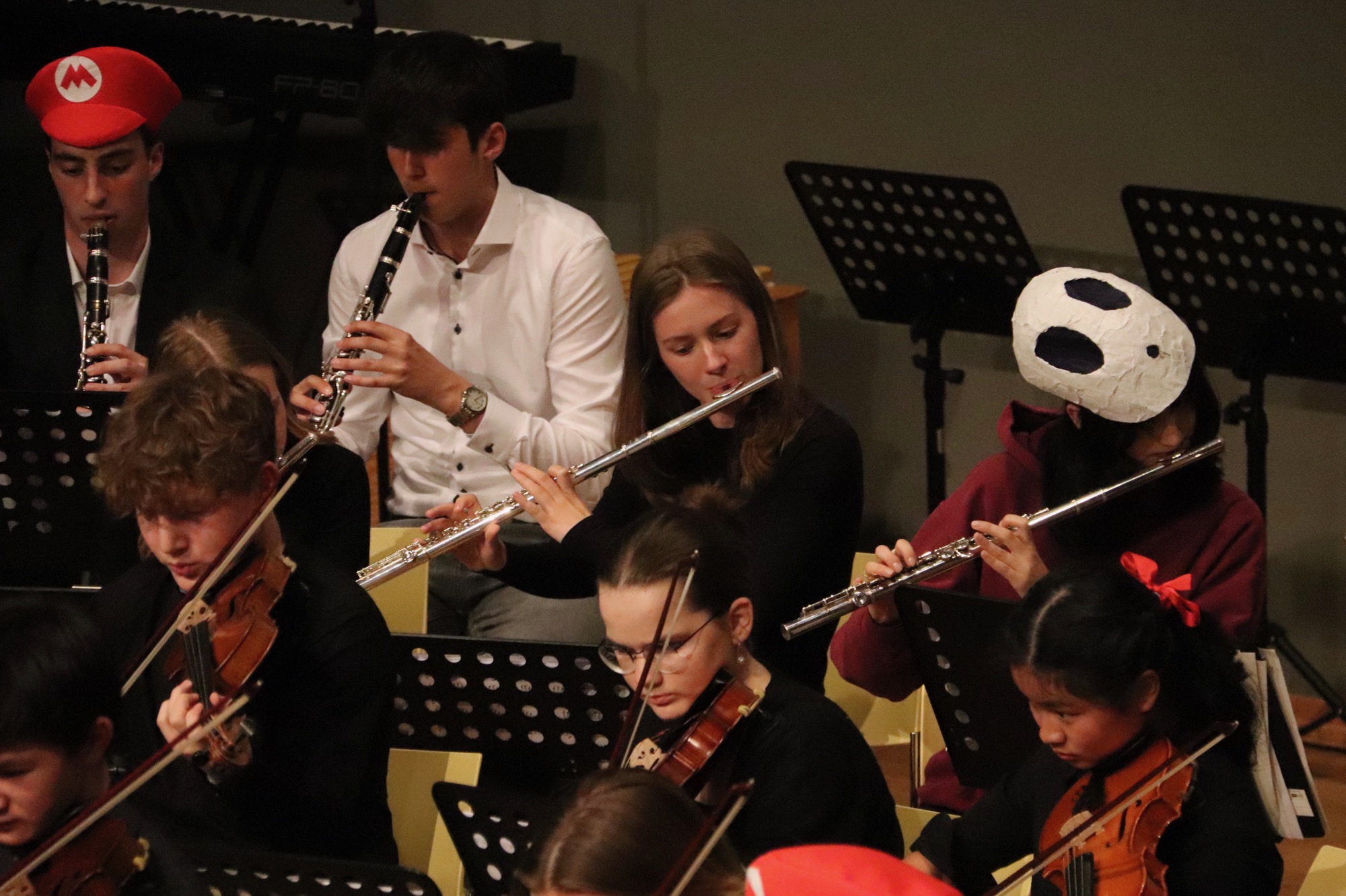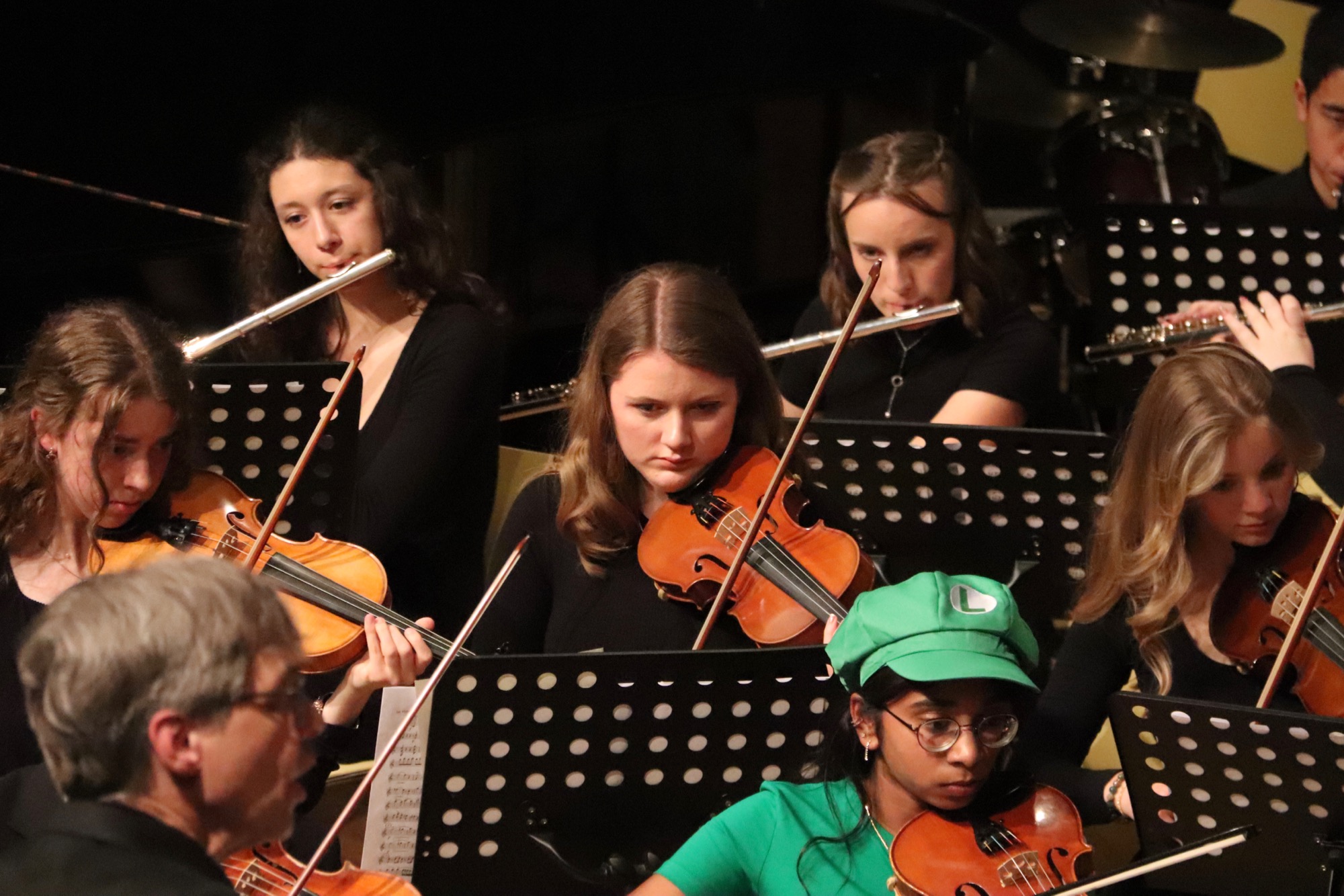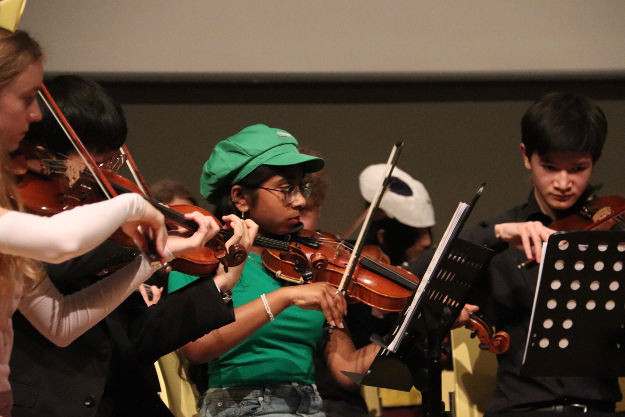 Der zweite Abend wurde von den Orchestern und Chören der höheren Jahrgangsstufen gestaltet. Den Anfang machte das Kleine Orchester unter Leitung von Frau Unterlerchner, das drei Stücke aus „Le Petit Carnaval des Animaux“ von Camille Saint-Saëns und drei Stücke aus „Aladdin“ von Alan Menken spielte und damit das Publikum in seinen Bann zog.