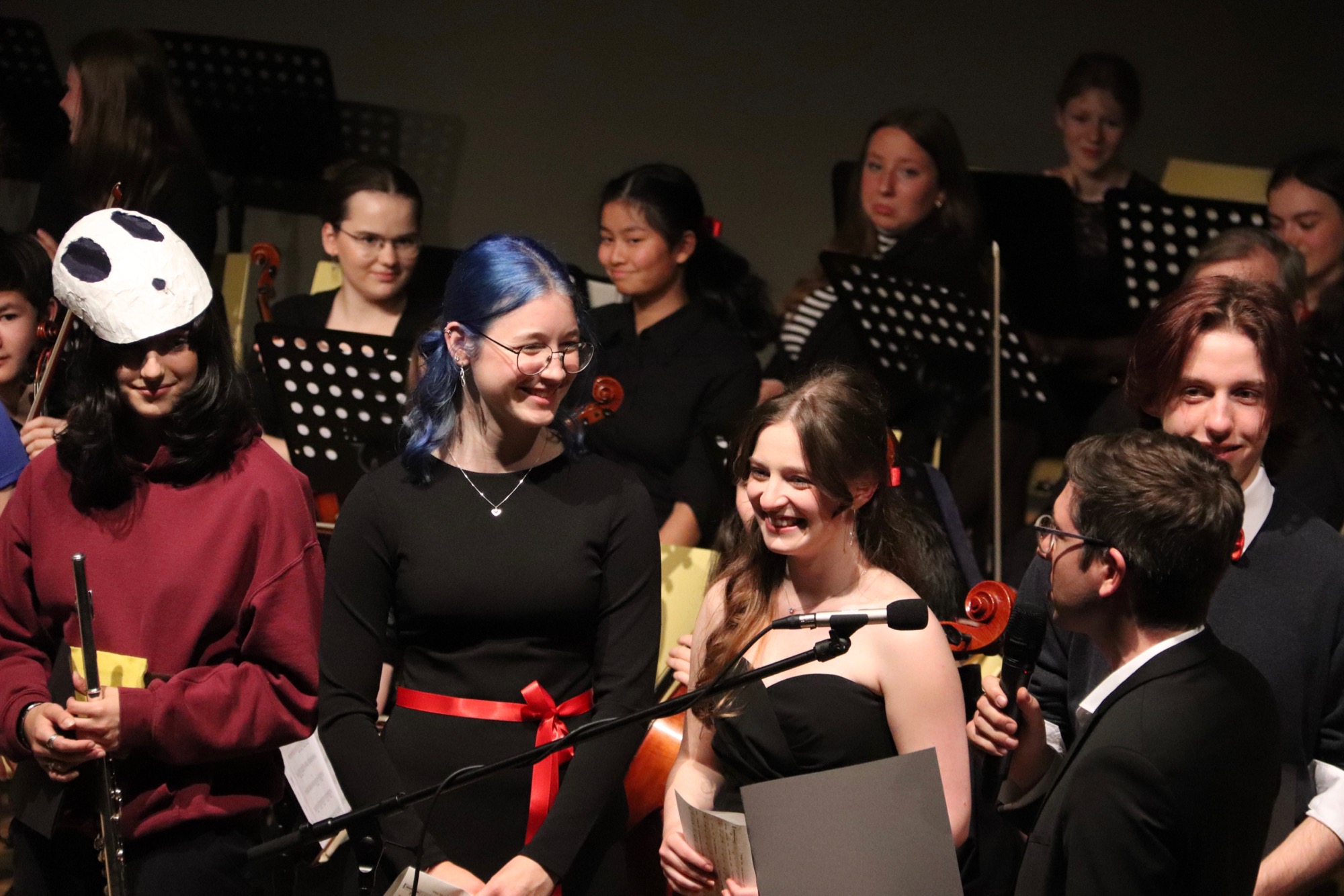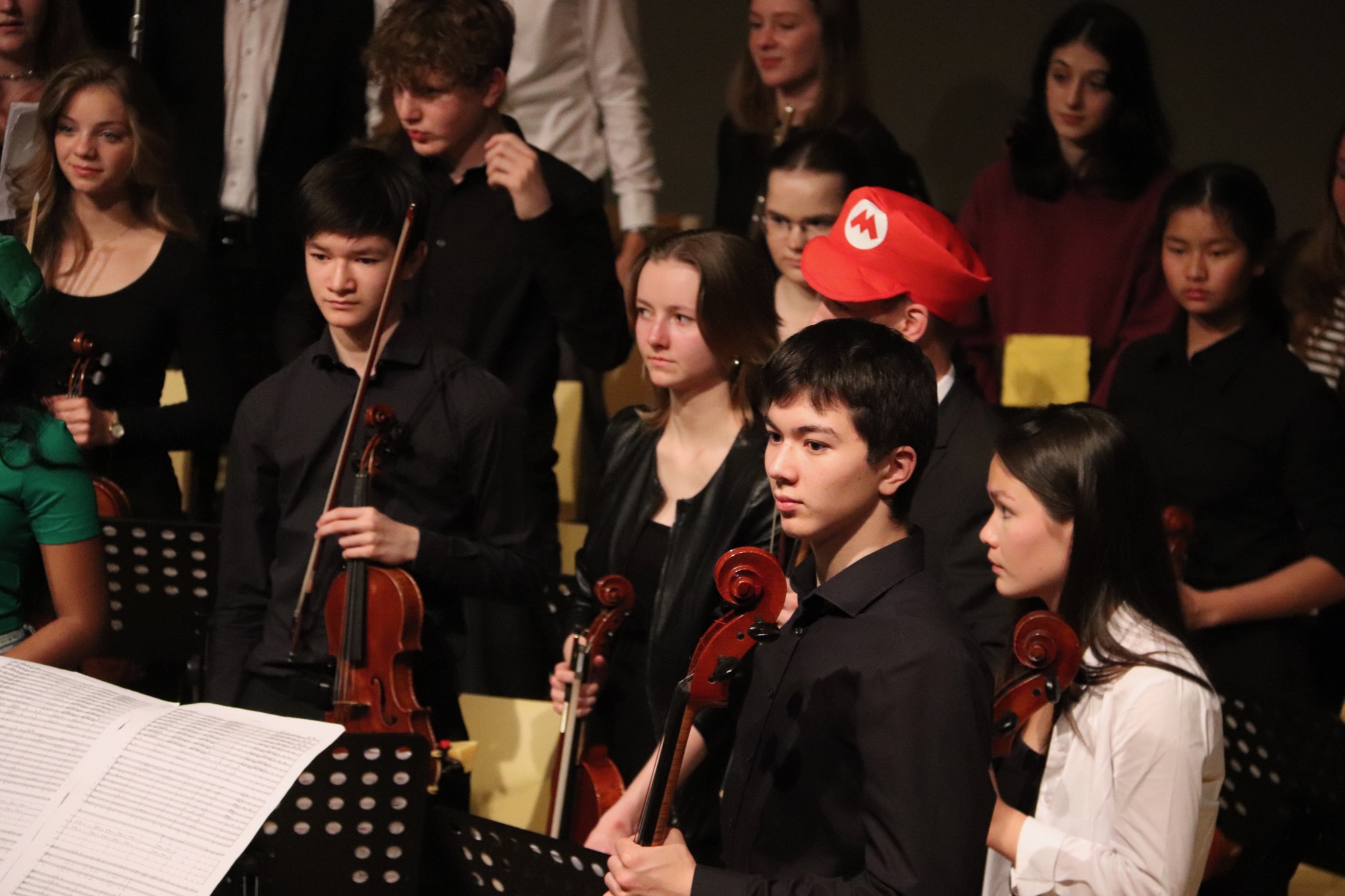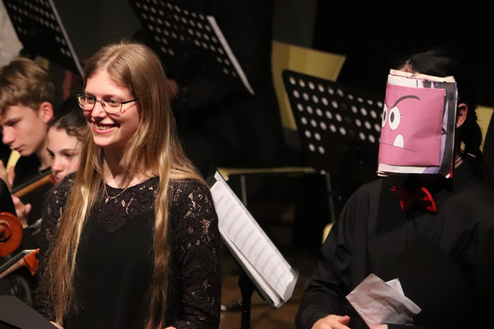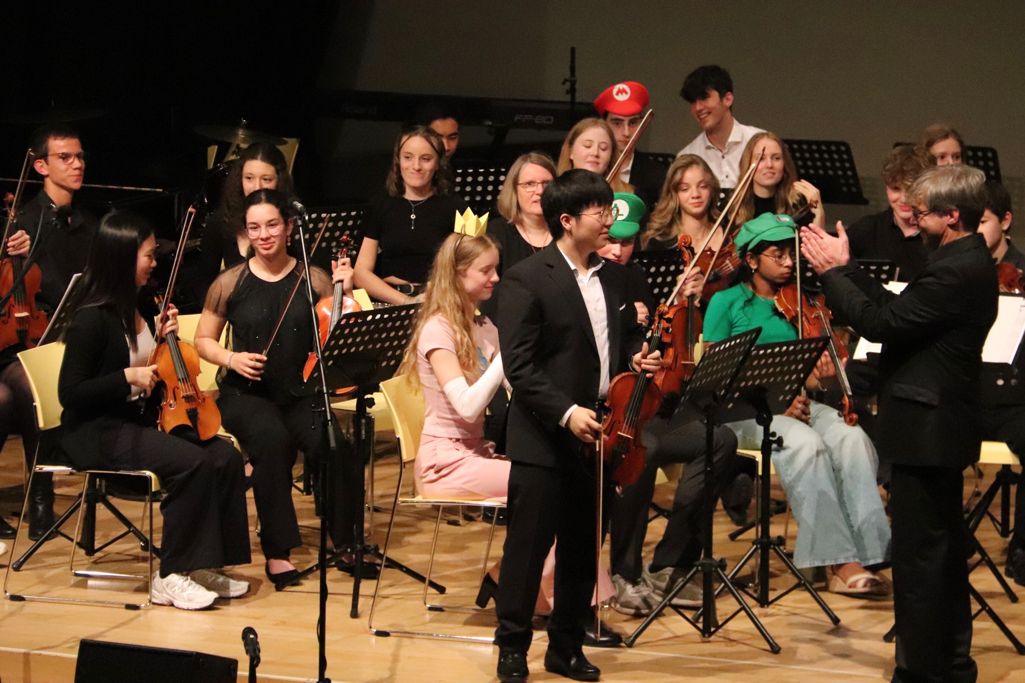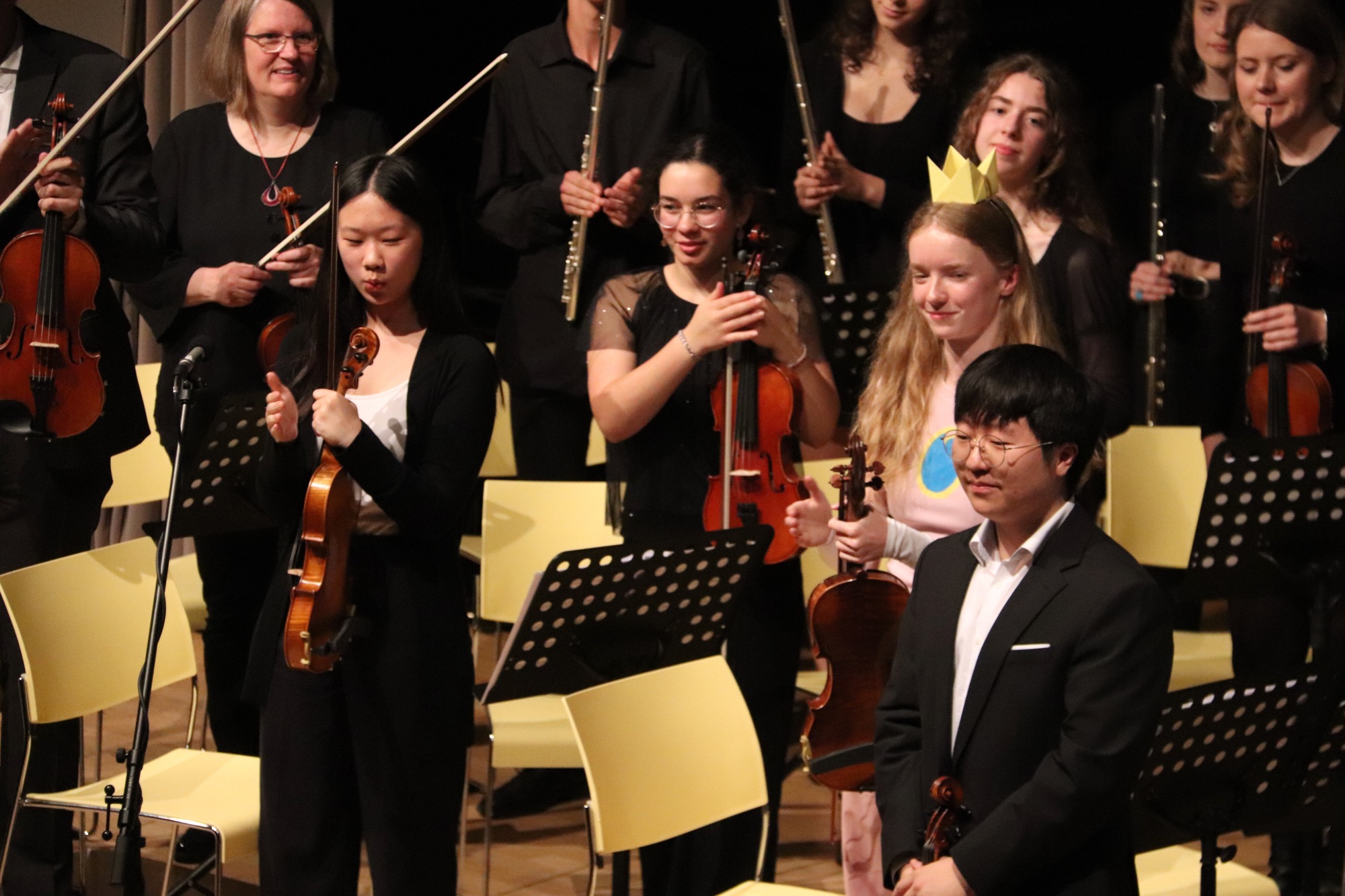 Nach der Pause gehörte dem Großen Orchester unter Leitung von Herrn Neubeck die Bühne, dem mit dem Norwegischen Tanz op. 35 Nr. 3 von Edvard Grieg ein stimmungsvoller Einstieg gelang. Richtig virtuos wurde es dann mit „Csárdás“ von Vittorio Monti, bei dem Yunwoo Koo (Q2) die Solo-Violine übernahm und das Publikum nachhaltig beeindruckte.