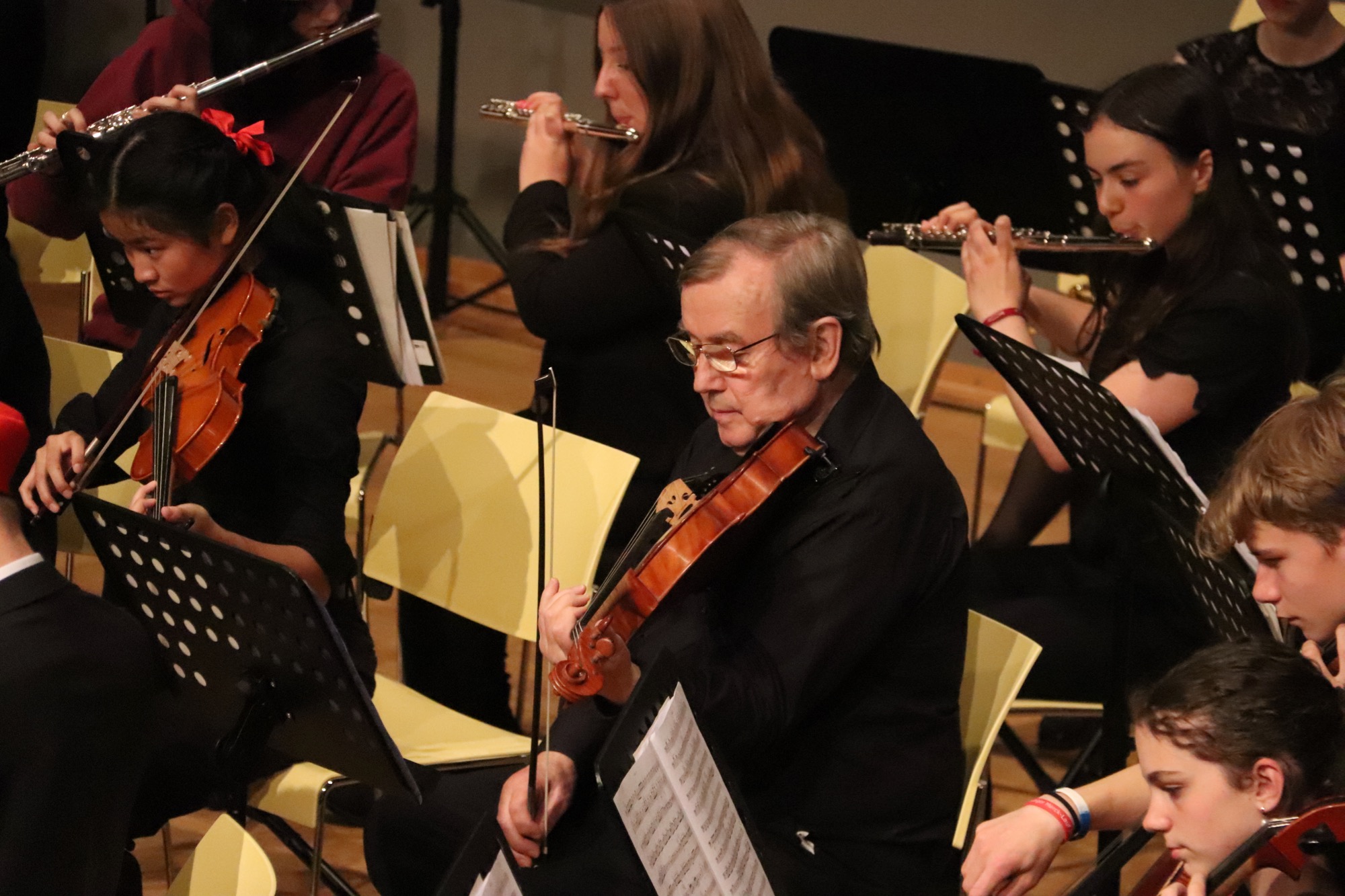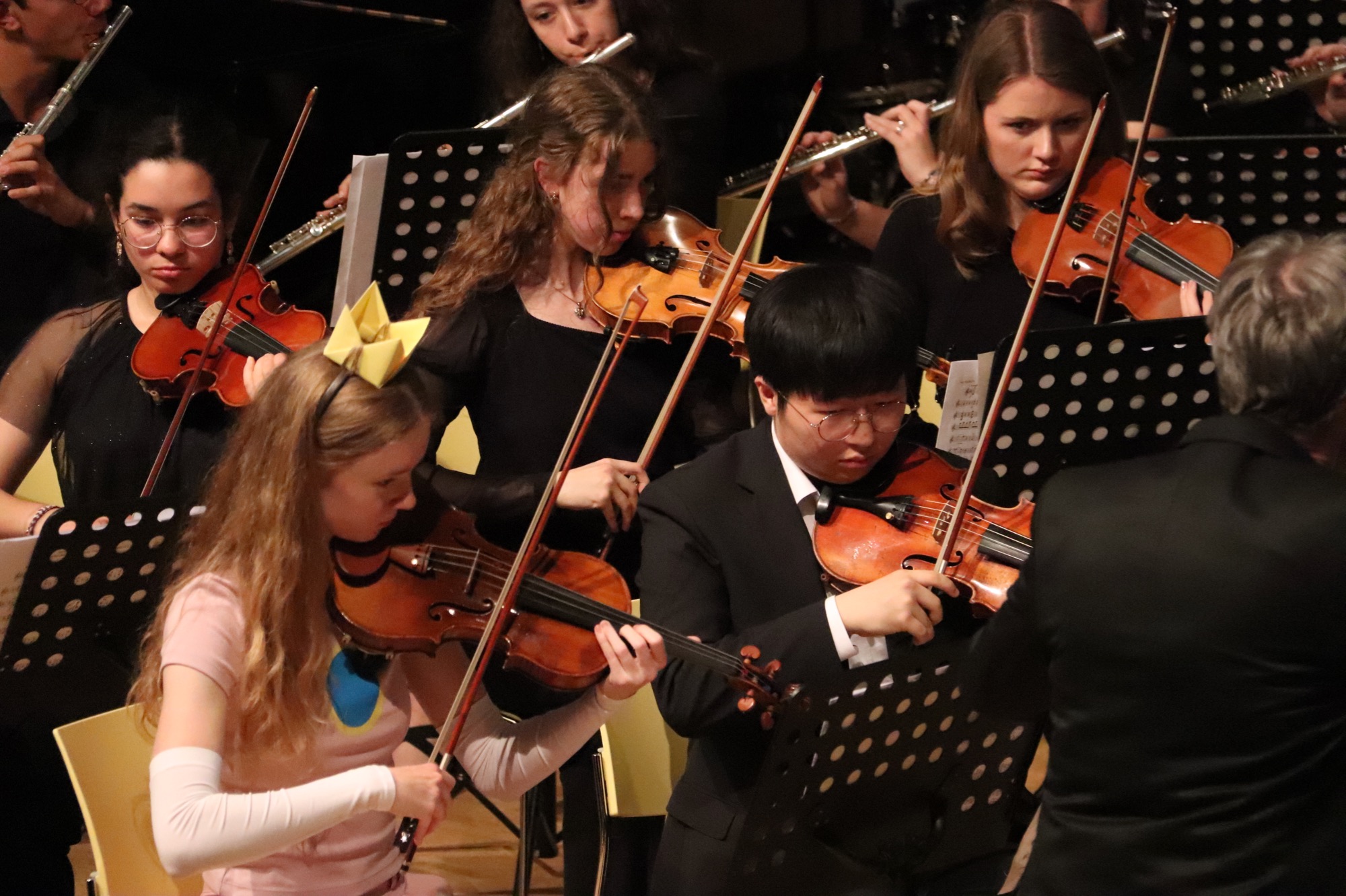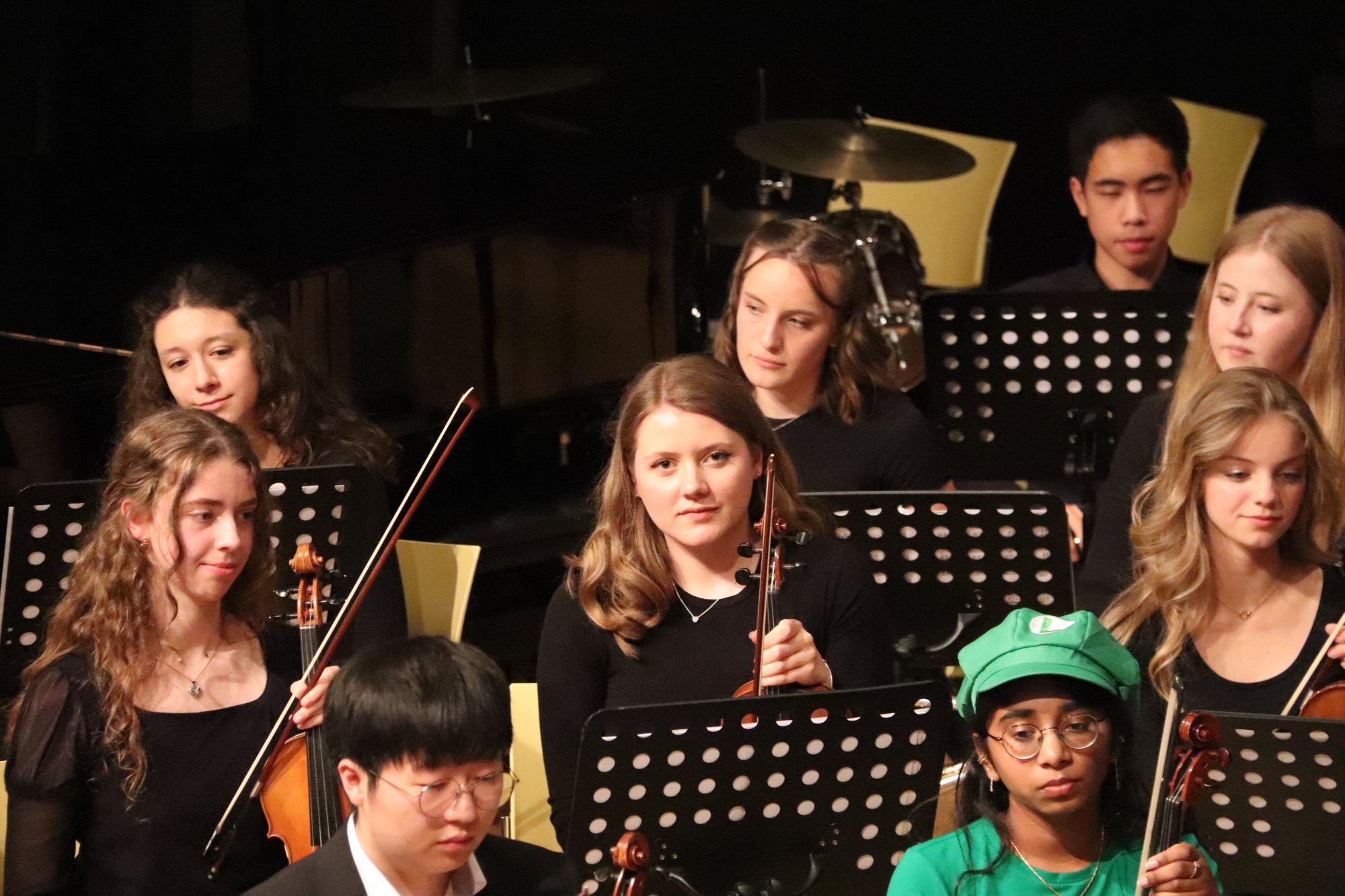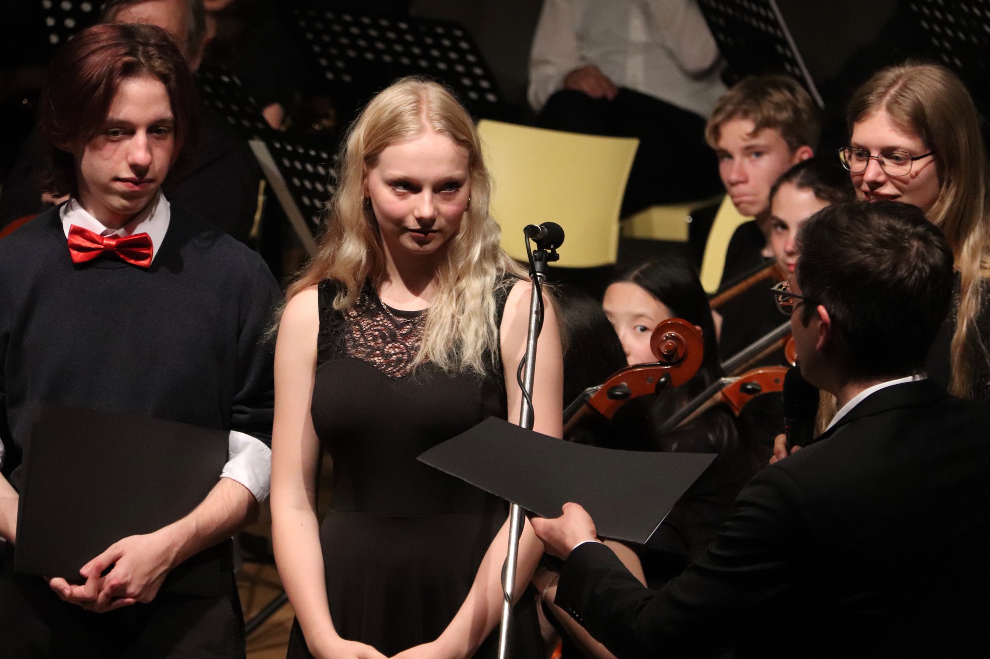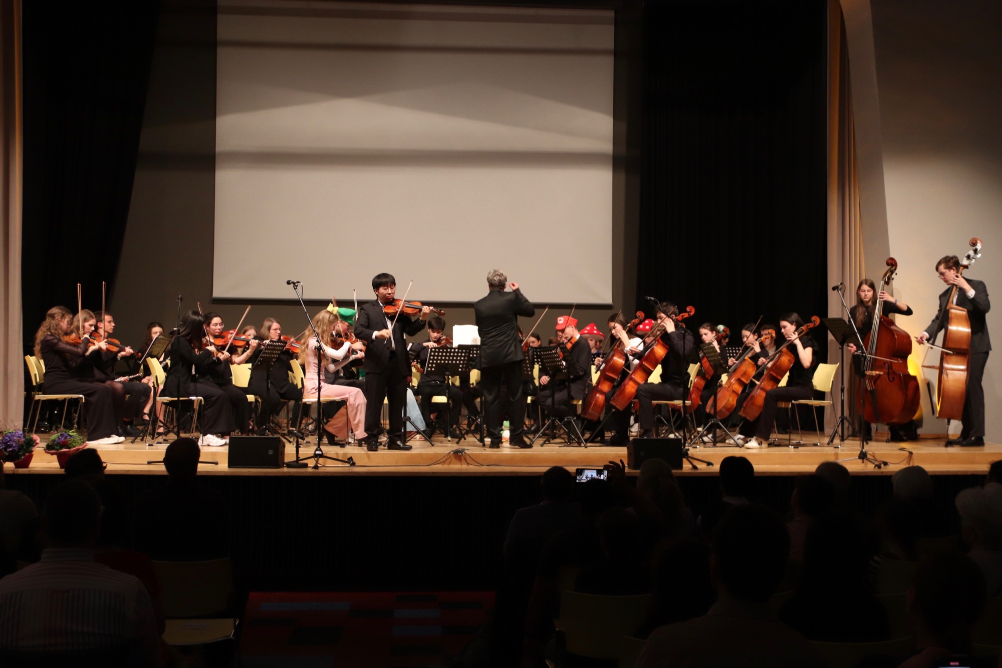 Nach der Pause gehörte dem Großen Orchester unter Leitung von Herrn Neubeck die Bühne, dem mit dem Norwegischen Tanz op. 35 Nr. 3 von Edvard Grieg ein stimmungsvoller Einstieg gelang. Richtig virtuos wurde es dann mit „Csárdás“ von Vittorio Monti, bei dem Yunwoo Koo (Q2) die Solo-Violine übernahm und das Publikum nachhaltig beeindruckte.