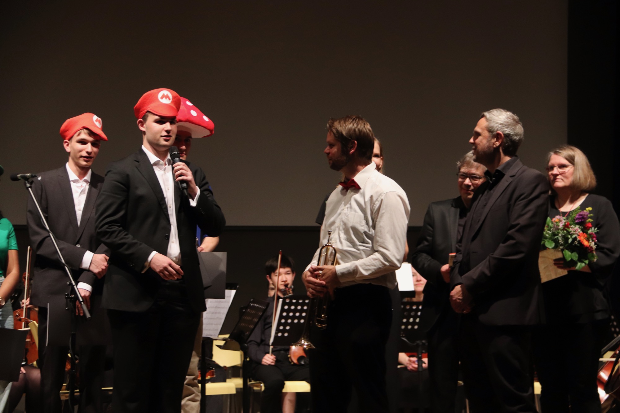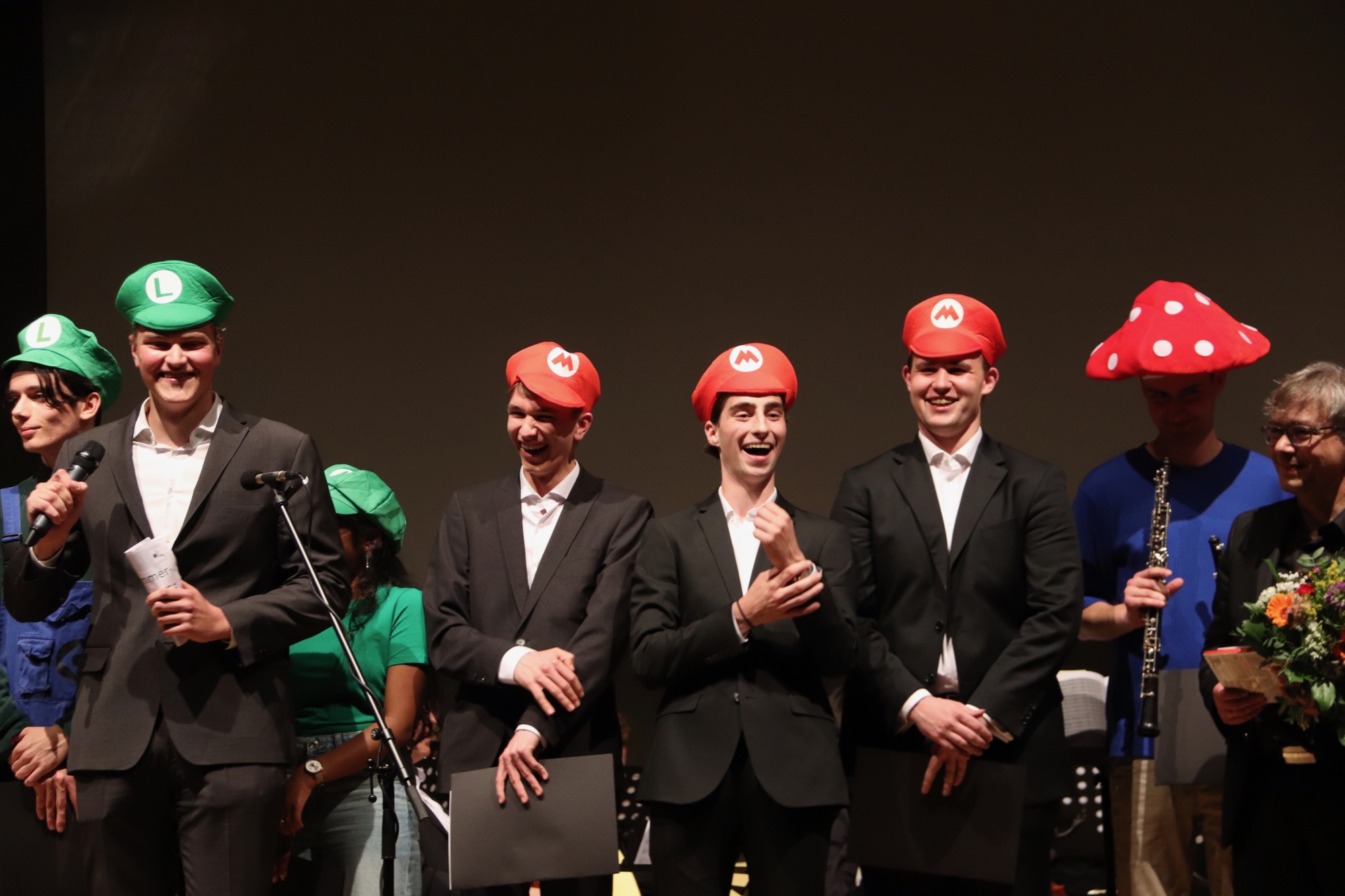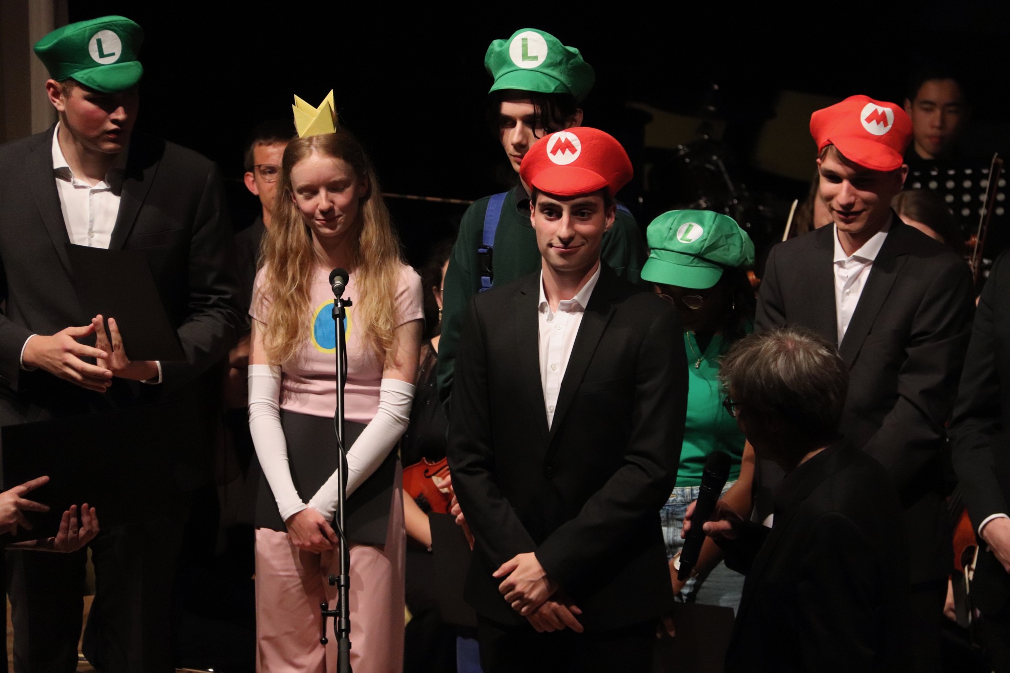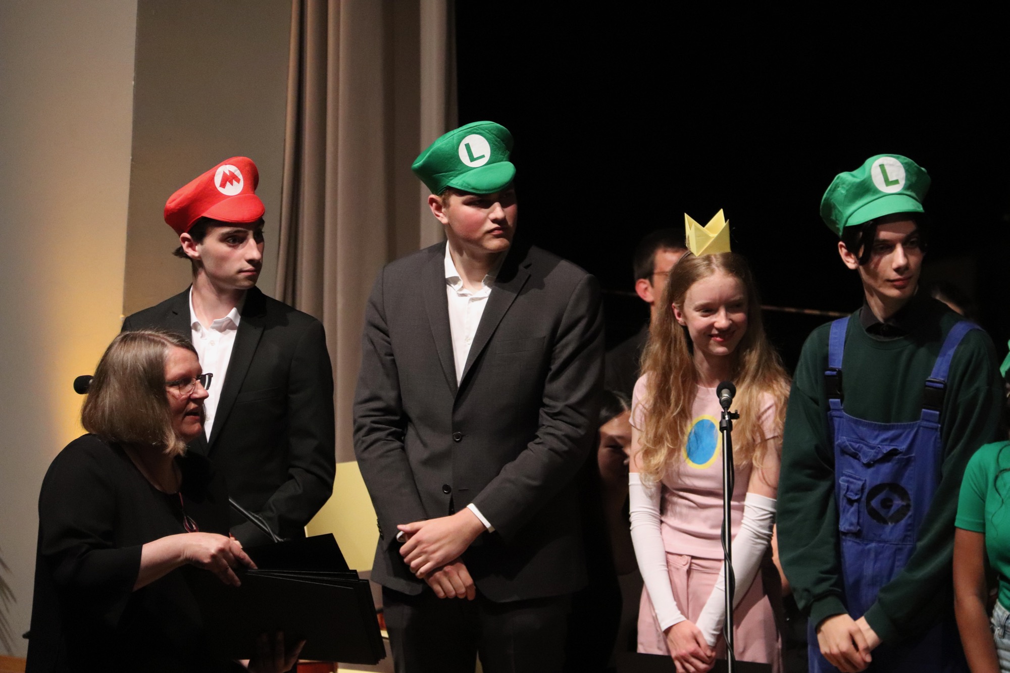 Wie es die Tradition vorsieht, wurden nun wieder die Abiturientinnen und Abiturienten feierlich verabschiedet, die mitunter während ihrer gesamten Gymnasialzeit in den Ensembles des TGK aktiv waren. Die Abiturientinnen und Abiturienten ließen es sich ihrerseits nicht nehmen, den Musik-Lehrkräften für die wunderbaren gemeinsamen Momente zu danken und ihnen dafür auch Blumen zu überreichen. Als kleine Überraschung hatten sie sogar ein Musikstück einstudiert: Sie brachten die „Super Mario“-Musik zu Gehör, untermalt von passenden Mitschnitten der bekannten Videospiele.