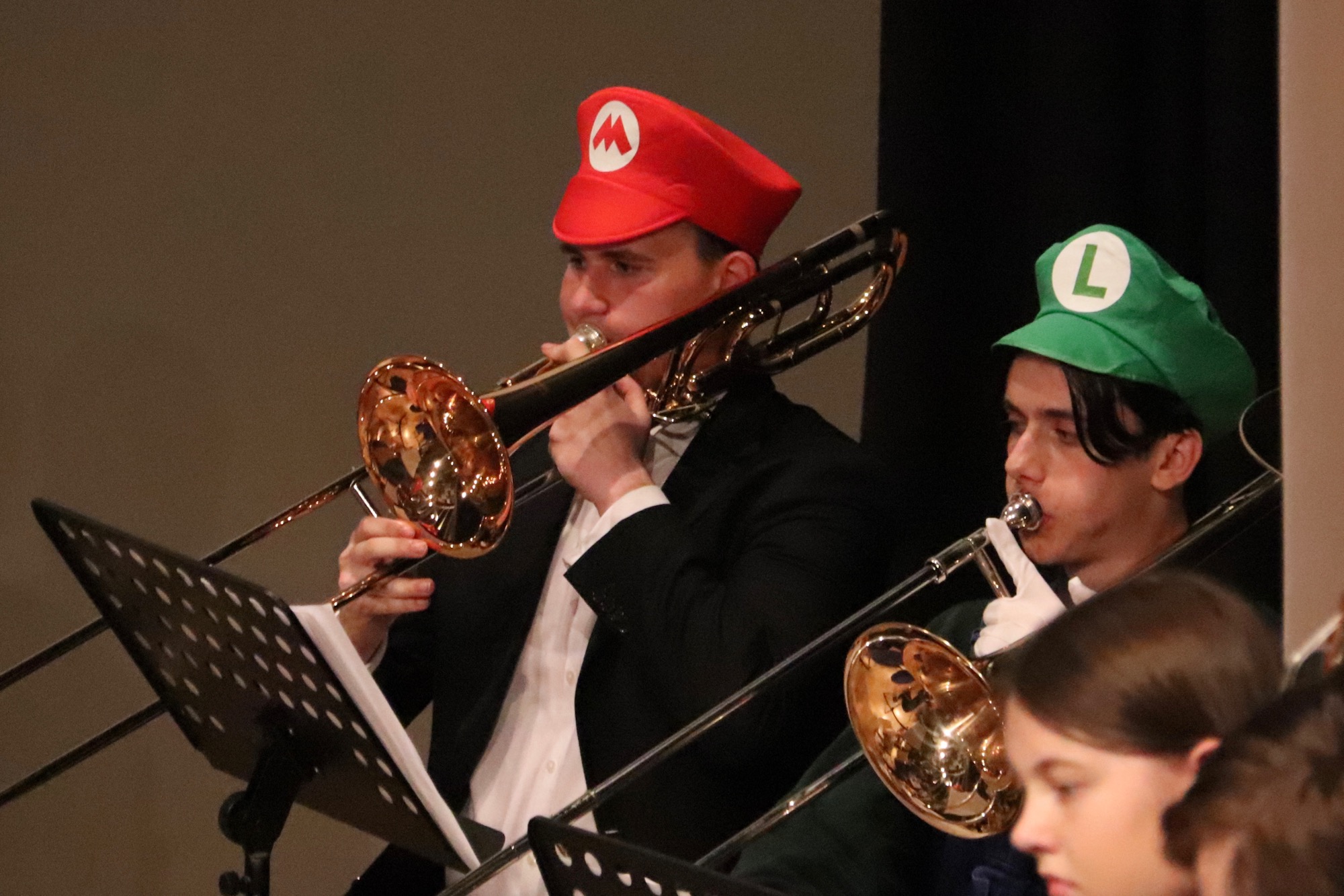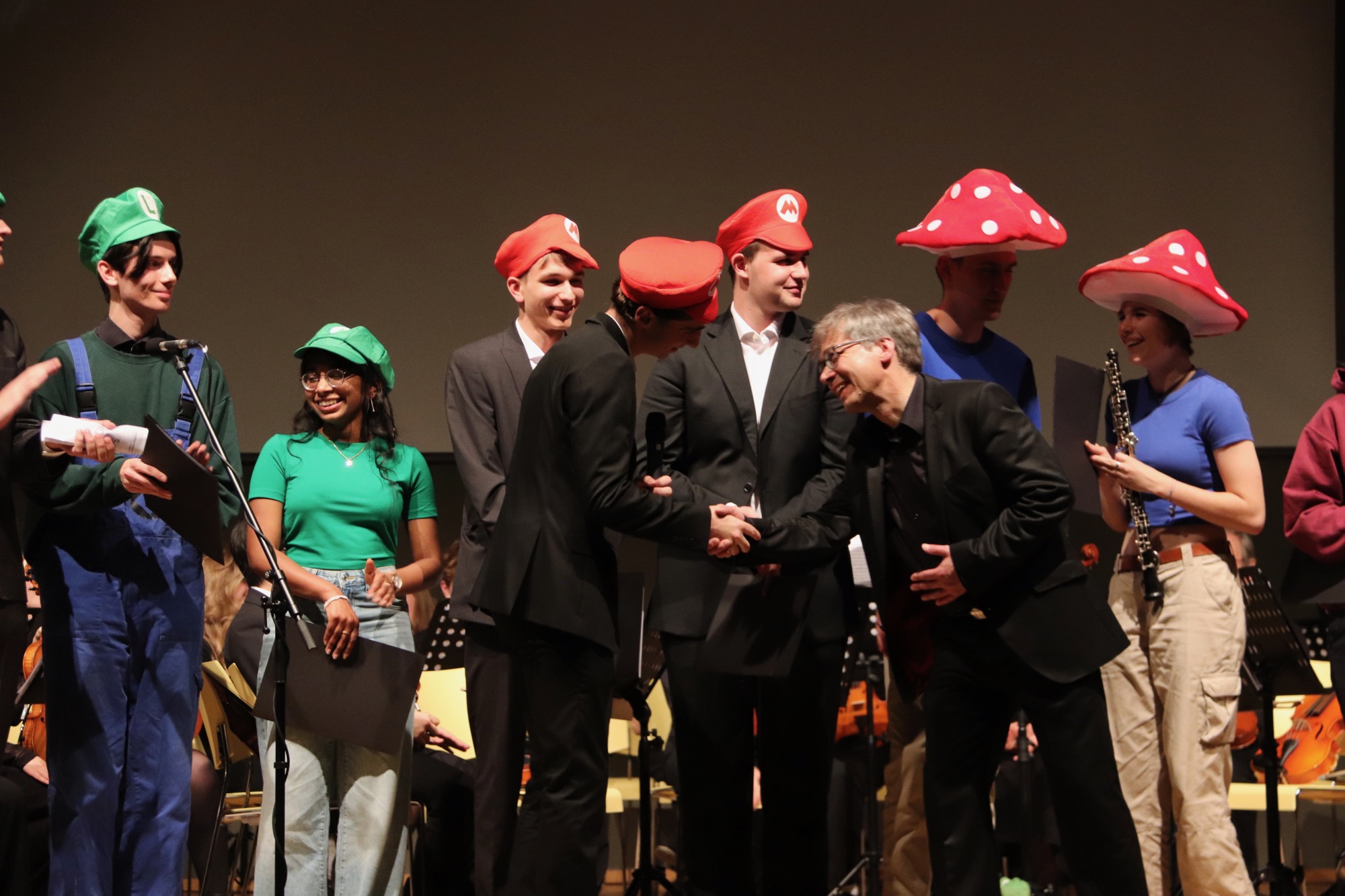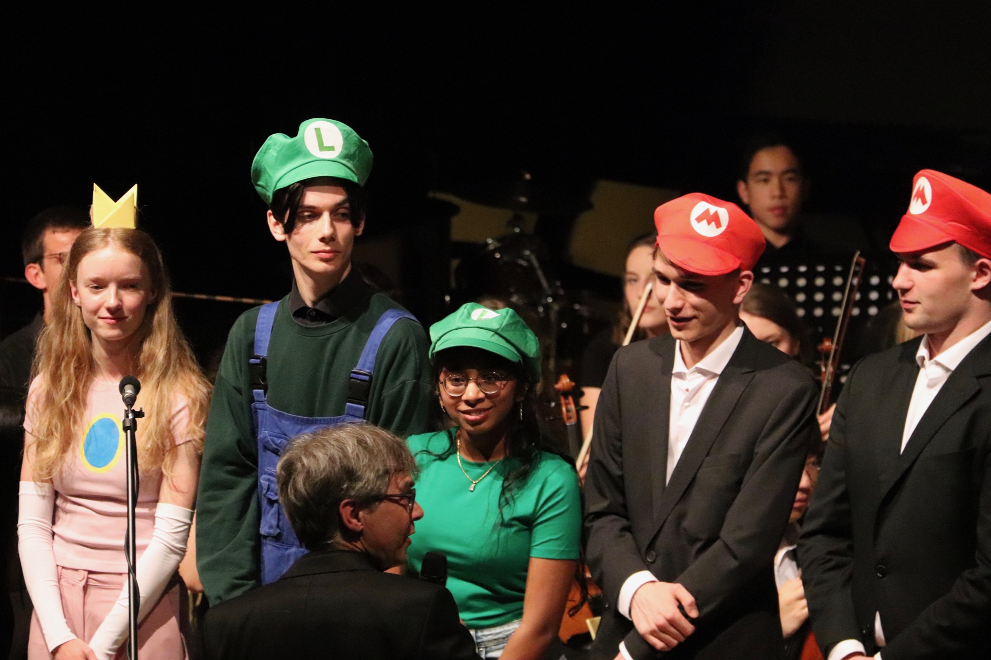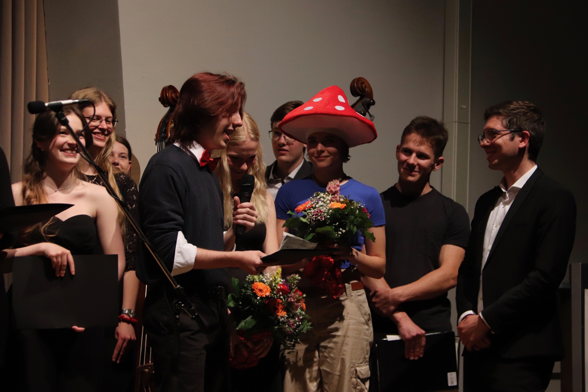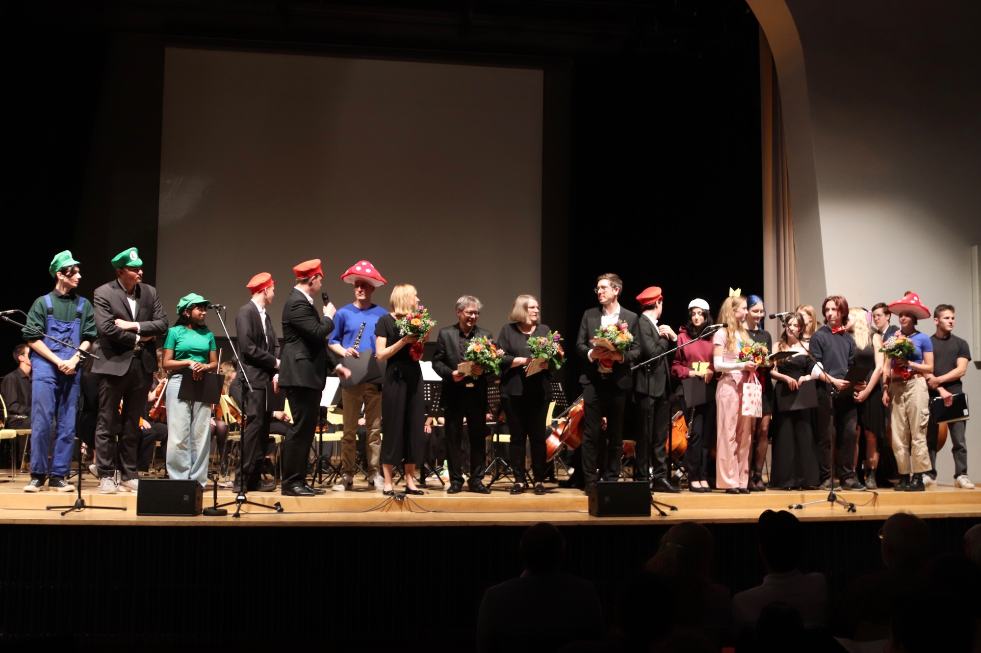 Wie es die Tradition vorsieht, wurden nun wieder die Abiturientinnen und Abiturienten feierlich verabschiedet, die mitunter während ihrer gesamten Gymnasialzeit in den Ensembles des TGK aktiv waren. Die Abiturientinnen und Abiturienten ließen es sich ihrerseits nicht nehmen, den Musik-Lehrkräften für die wunderbaren gemeinsamen Momente zu danken und ihnen dafür auch Blumen zu überreichen. Als kleine Überraschung hatten sie sogar ein Musikstück einstudiert: Sie brachten die „Super Mario“-Musik zu Gehör, untermalt von passenden Mitschnitten der bekannten Videospiele.