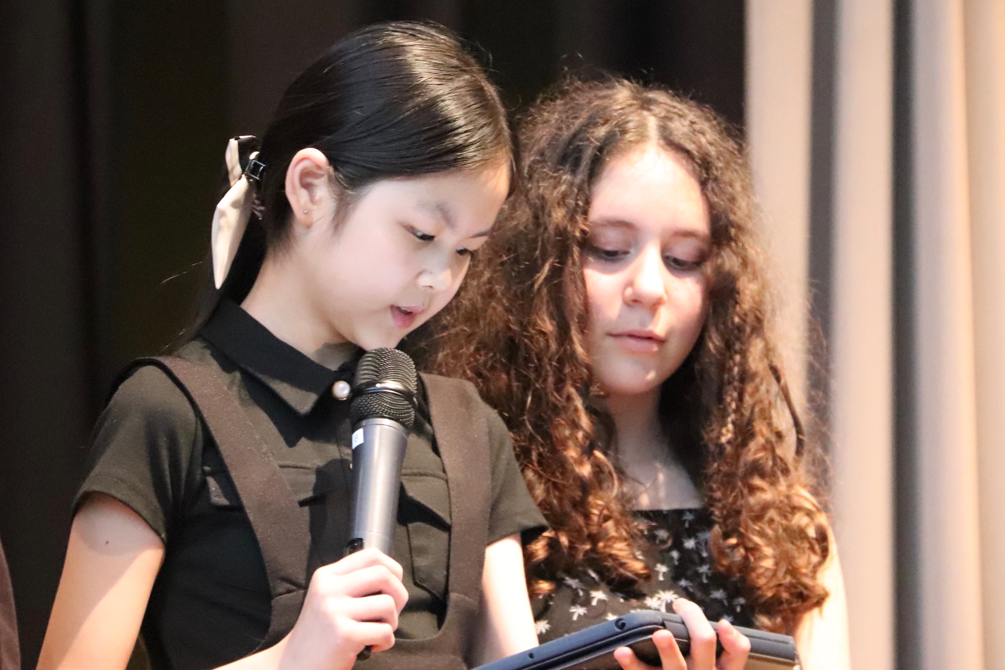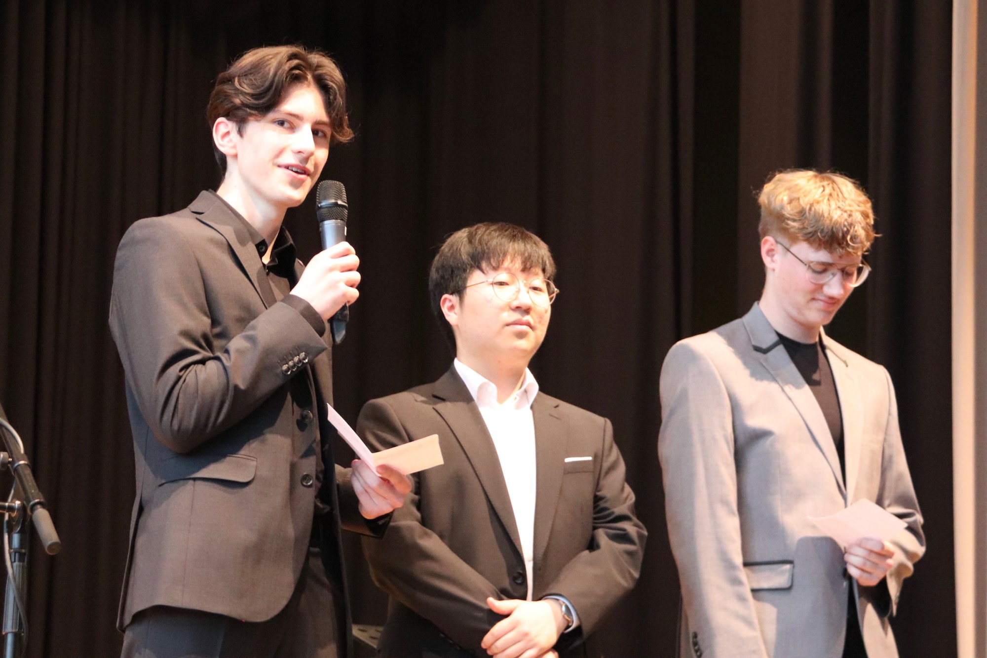 Der neue TGK-Schulsong, der unter Leitung von Frau Unterlerchner entstand, wurde nun zum ersten Mal live aufgeführt. Die drei Mitglieder des Musik-LKs der Q2, Michael Berenbaum, Yunwoo Koo und Lukas Reuter, hatten per Instagram gefragt, was die Schülerschaft mit dem TGK verbindet – und die Antworten waren zahlreich und aussagekräftig. Darauf basierten sie ihren Rap-Text und schrieben einen eingängigen Refrain dazu. Fürs Singen des Refrains wurde Soraya Wingenter (8f) verpflichtet; für den Sprechgesang veranstalteten die drei eigens einen Rap-Contest, aus dem Simon Galetzka (10c) siegreich hervorging. Begleitet wurden die beiden Vokalisten von der Schulband unter Leitung von Frau Strecker. Das Publikum drückte seine Anerkennung für den gelungenen Song mit einem riesigen Beifall aus.