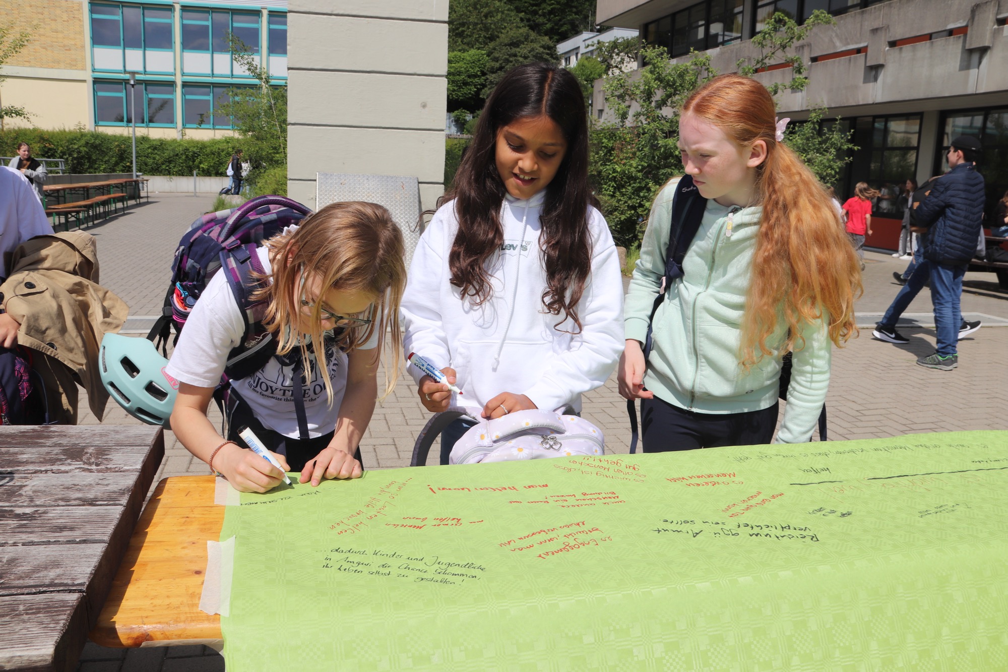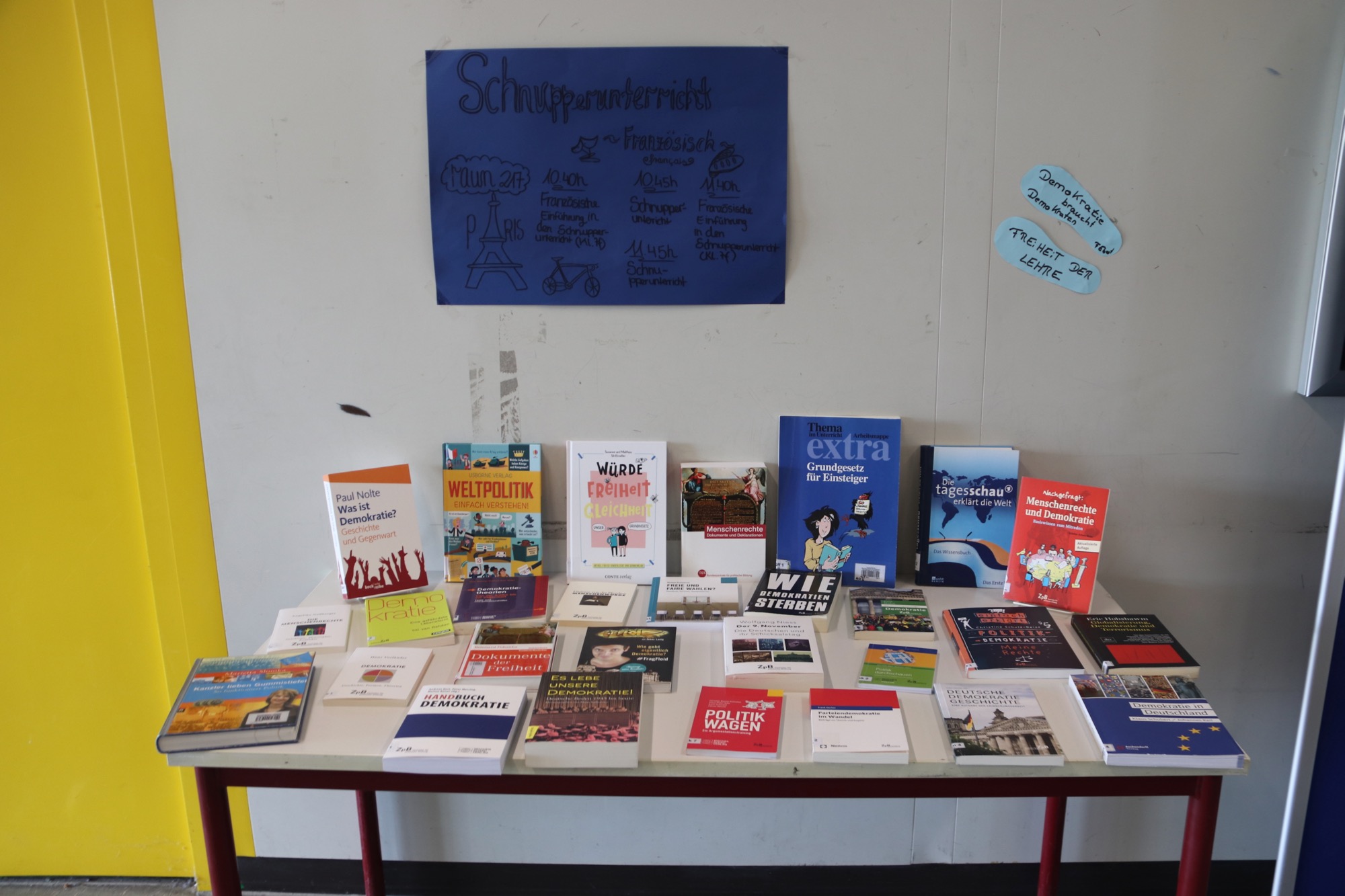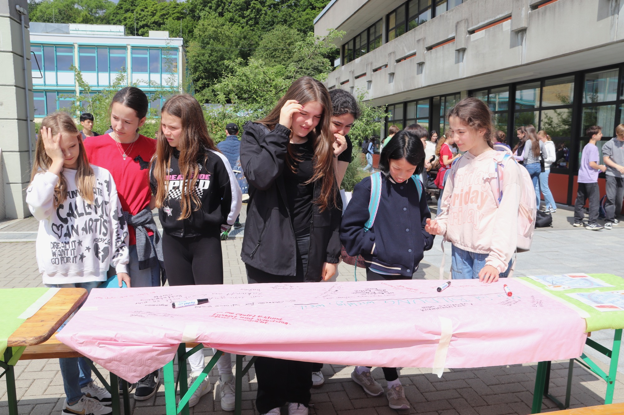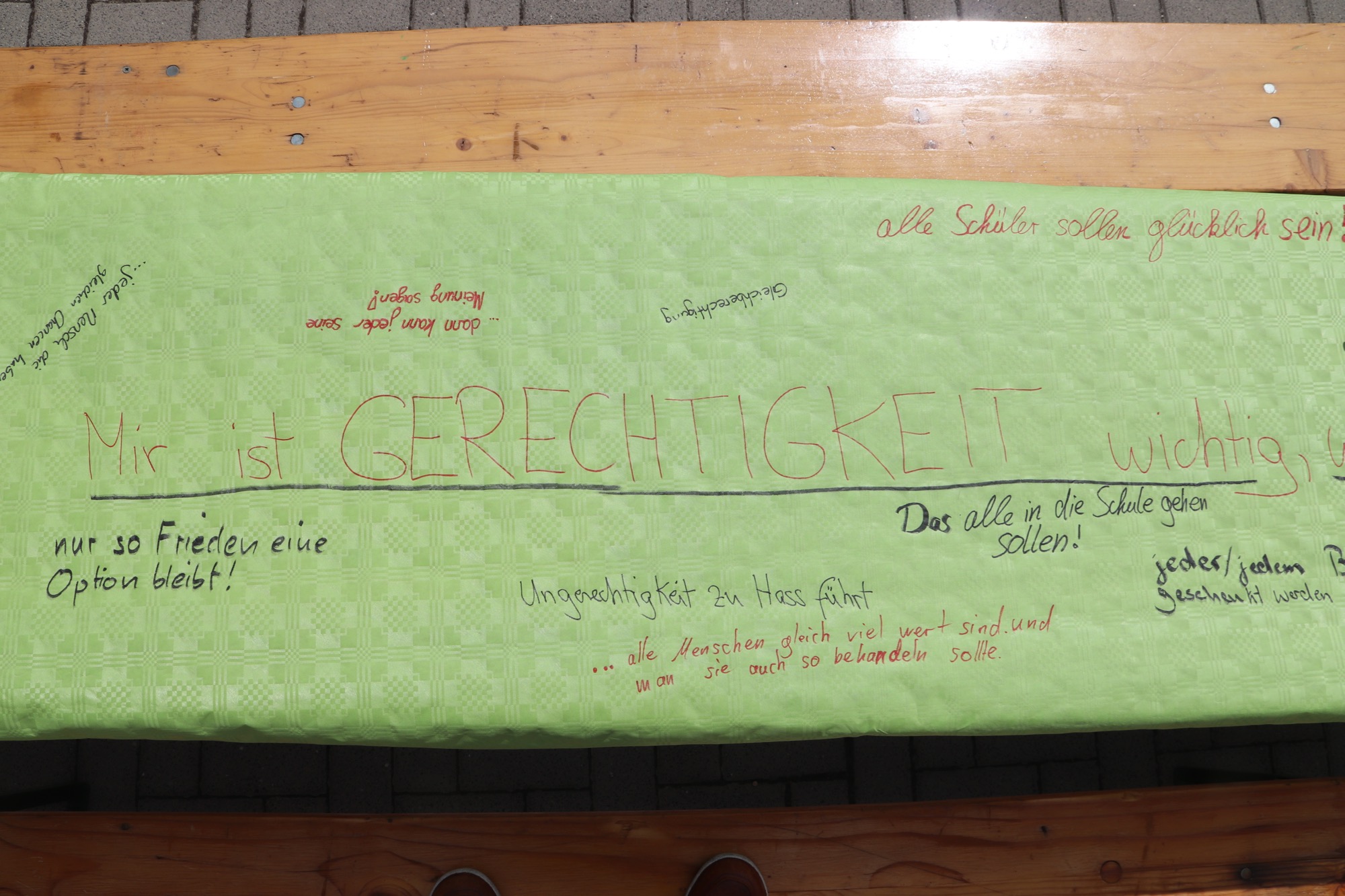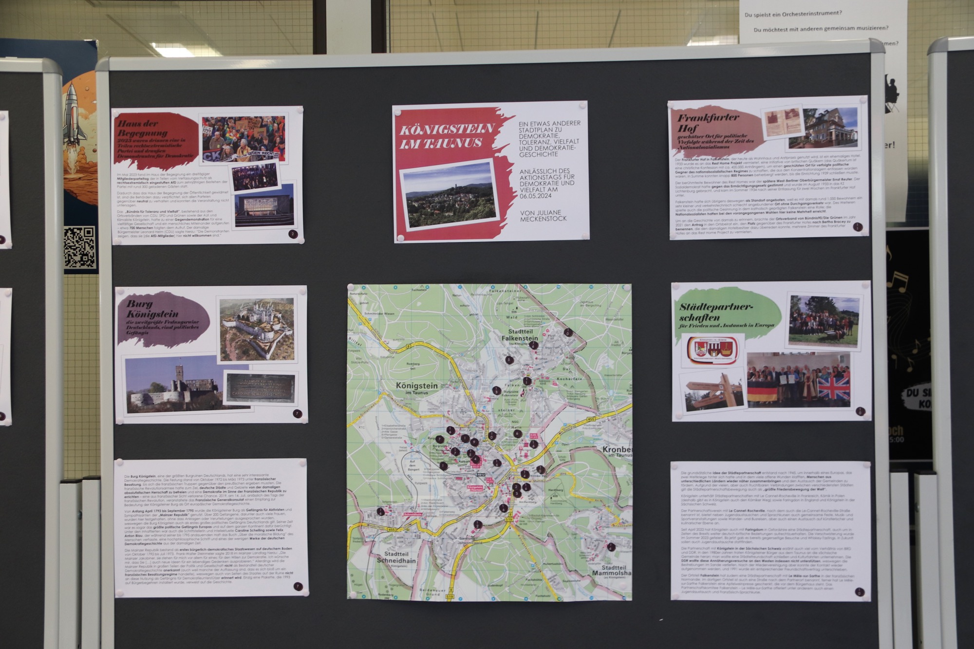 Auf dem Pausenhof gab es noch weitere Angebote, etwa die „Tafel der Vielfalt“ der Amguri-AG, auf der sich die Schülerinnen und Schüler schriftlich zu Themen wie Bildung, Vielfalt und Demokratie äußern konnten. Im Schulgebäude wurden Ausstellungen zum Thema EU, Grundgesetz sowie eine besondere Stadtkarte Königsteins, eine Weltkarte der Vielfalt, Bücherstände sowie ein Speakers Corner angeboten.