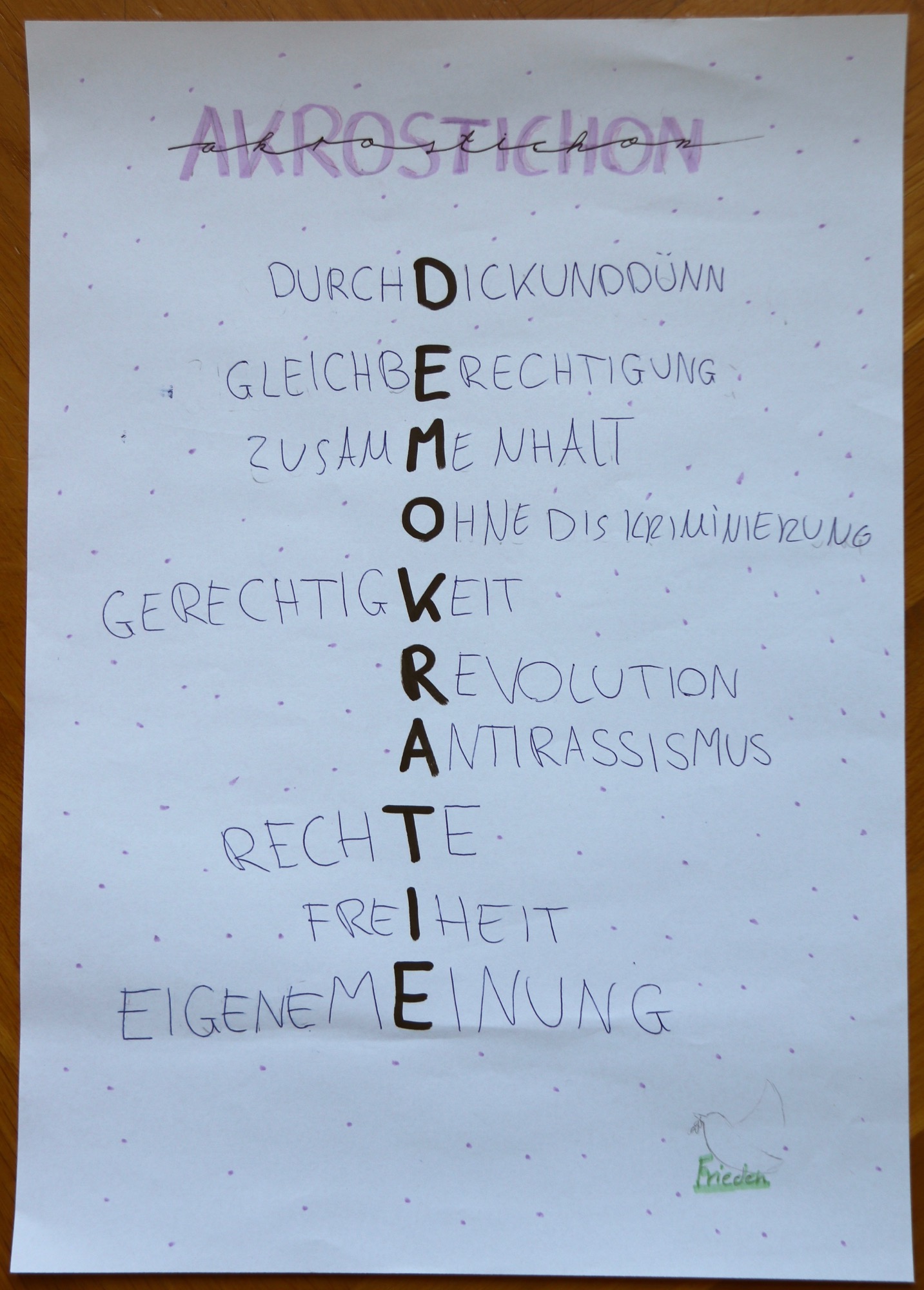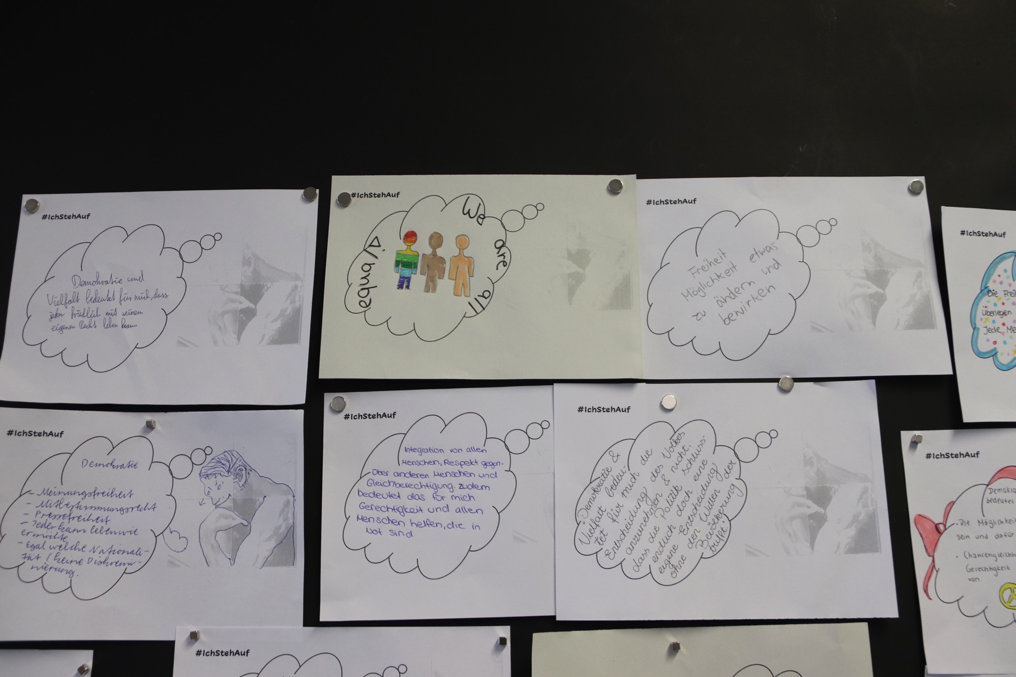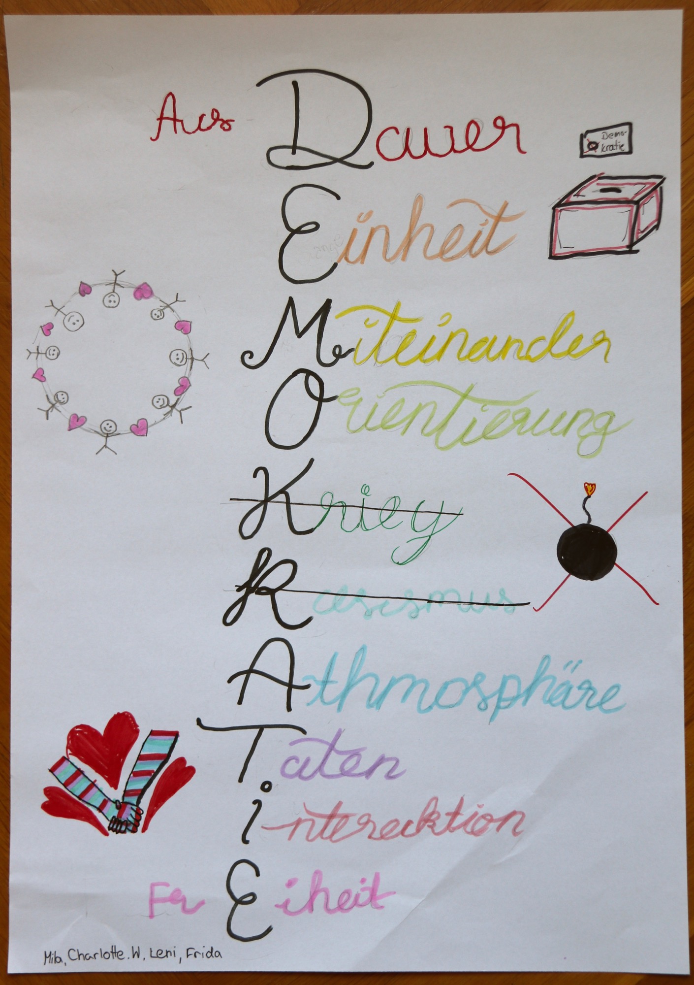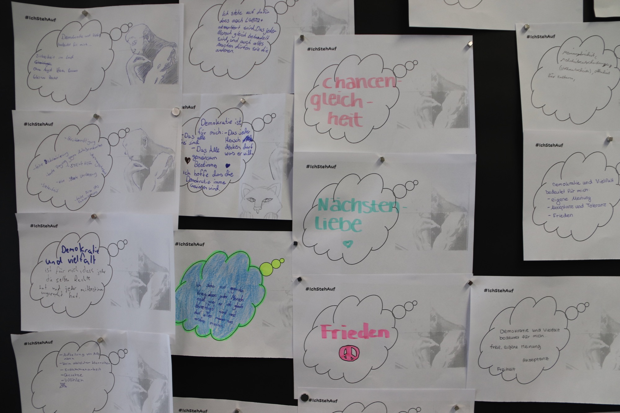 Zusätzlich entstand als bleibendes Symbol eine Wand im Schulgebäude mit den Assoziationen der Schülerinnen und Schüler zum Thema „Demokratie und Vielfalt bedeutet für mich…“. Auf Arbeitsblättern, die von den Lerndenden oft liebevoll ausgestaltet wurden, kam zum Ausdruck, was für jede Einzelne und jeden Einzelnen Demokratie und Vielfalt bedeutet.