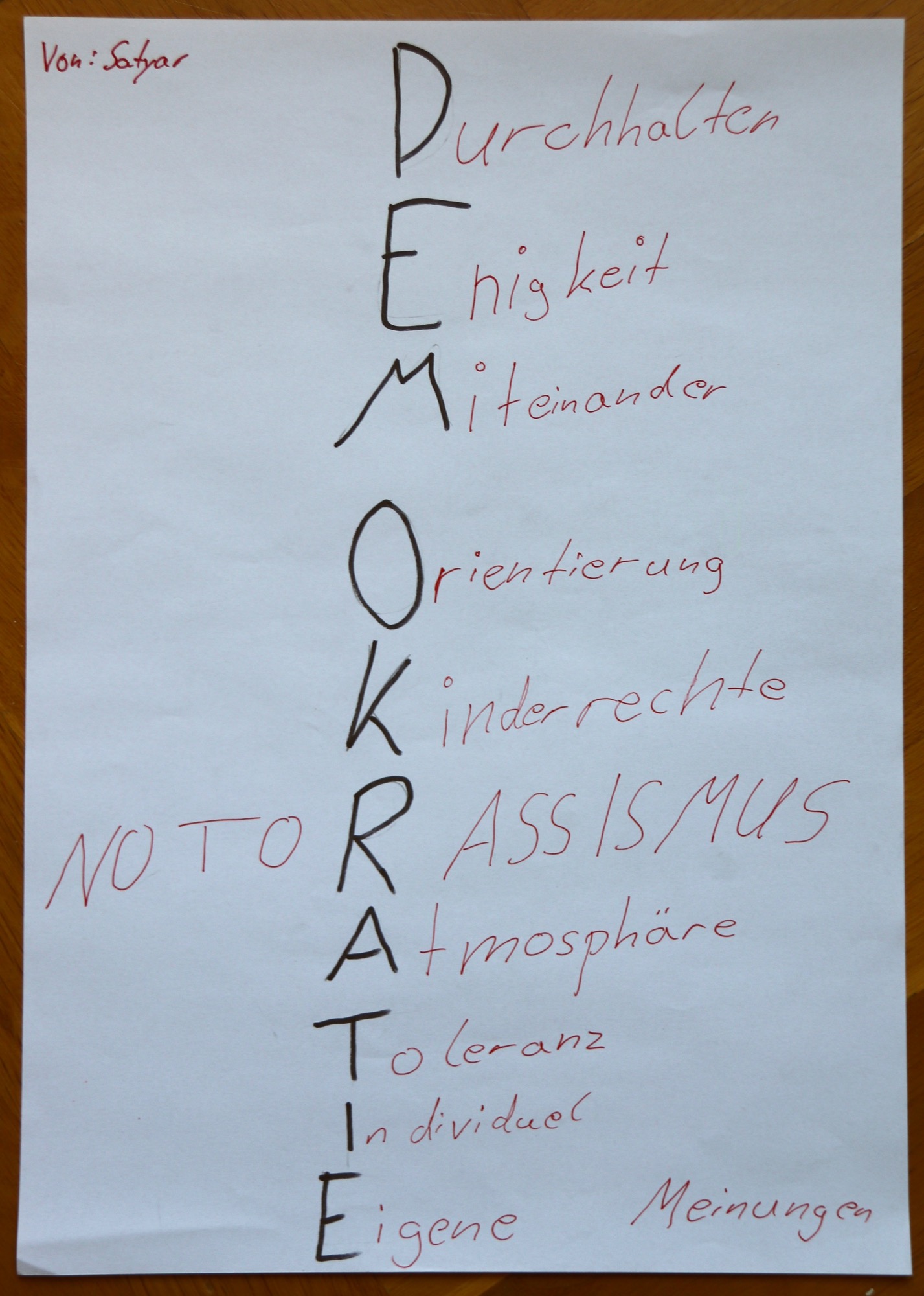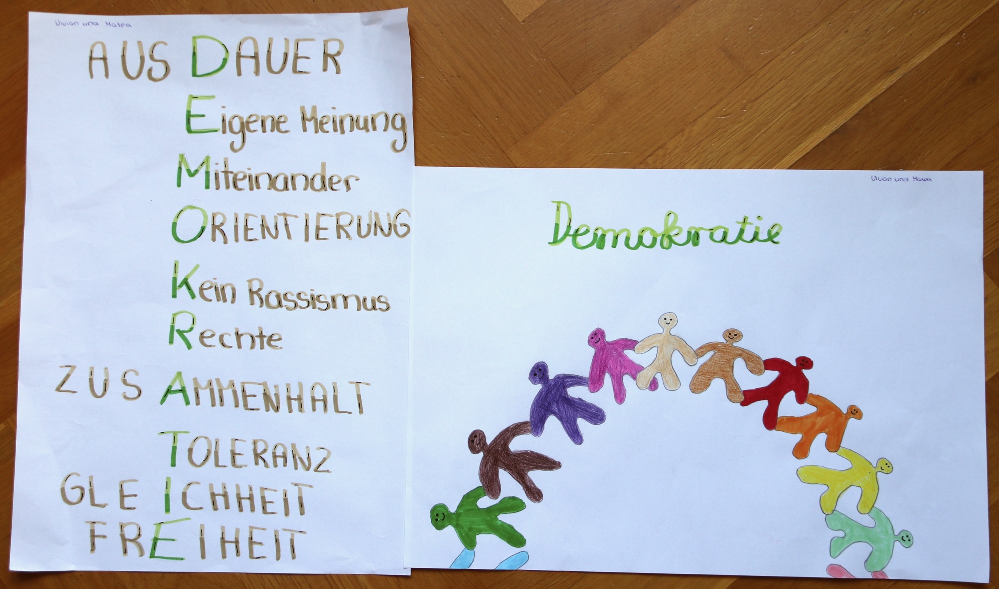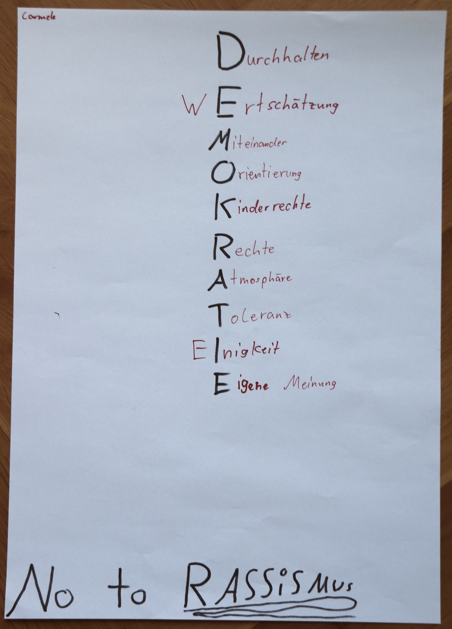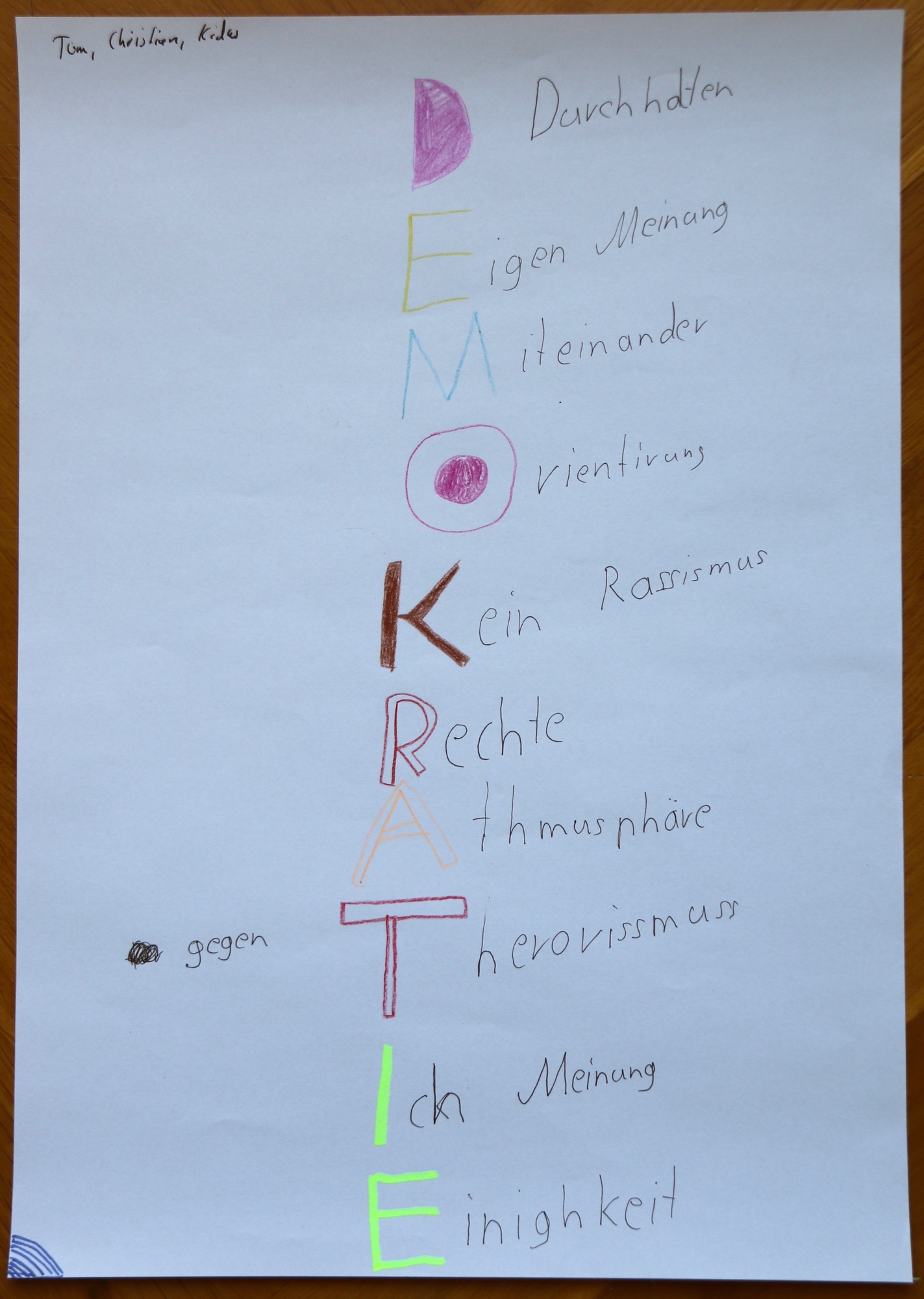 Zusätzlich entstand als bleibendes Symbol eine Wand im Schulgebäude mit den Assoziationen der Schülerinnen und Schüler zum Thema „Demokratie und Vielfalt bedeutet für mich…“. Auf Arbeitsblättern, die von den Lerndenden oft liebevoll ausgestaltet wurden, kam zum Ausdruck, was für jede Einzelne und jeden Einzelnen Demokratie und Vielfalt bedeutet.