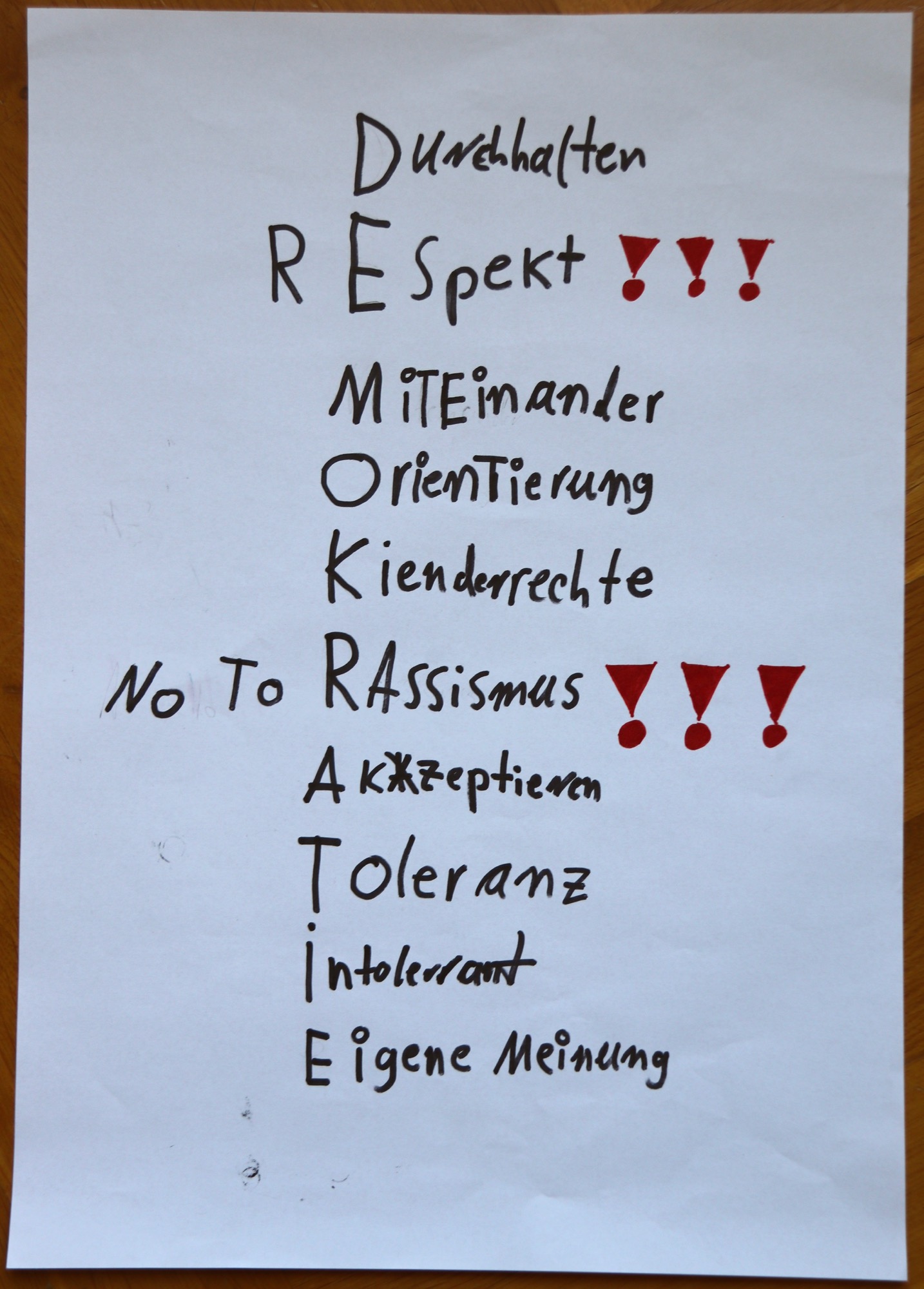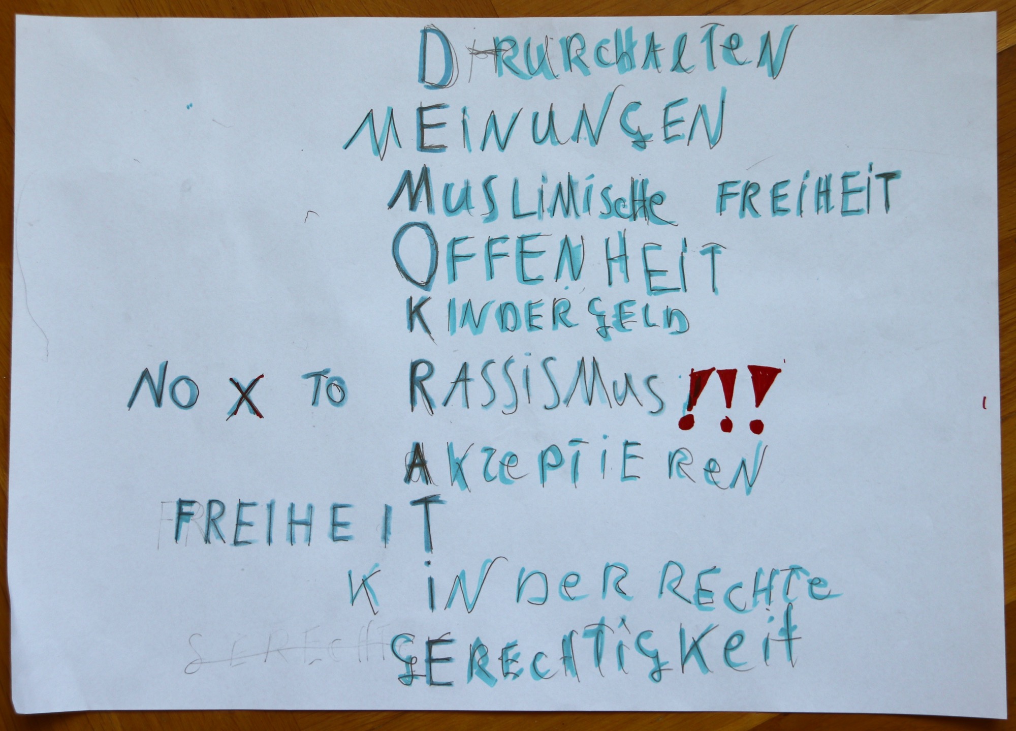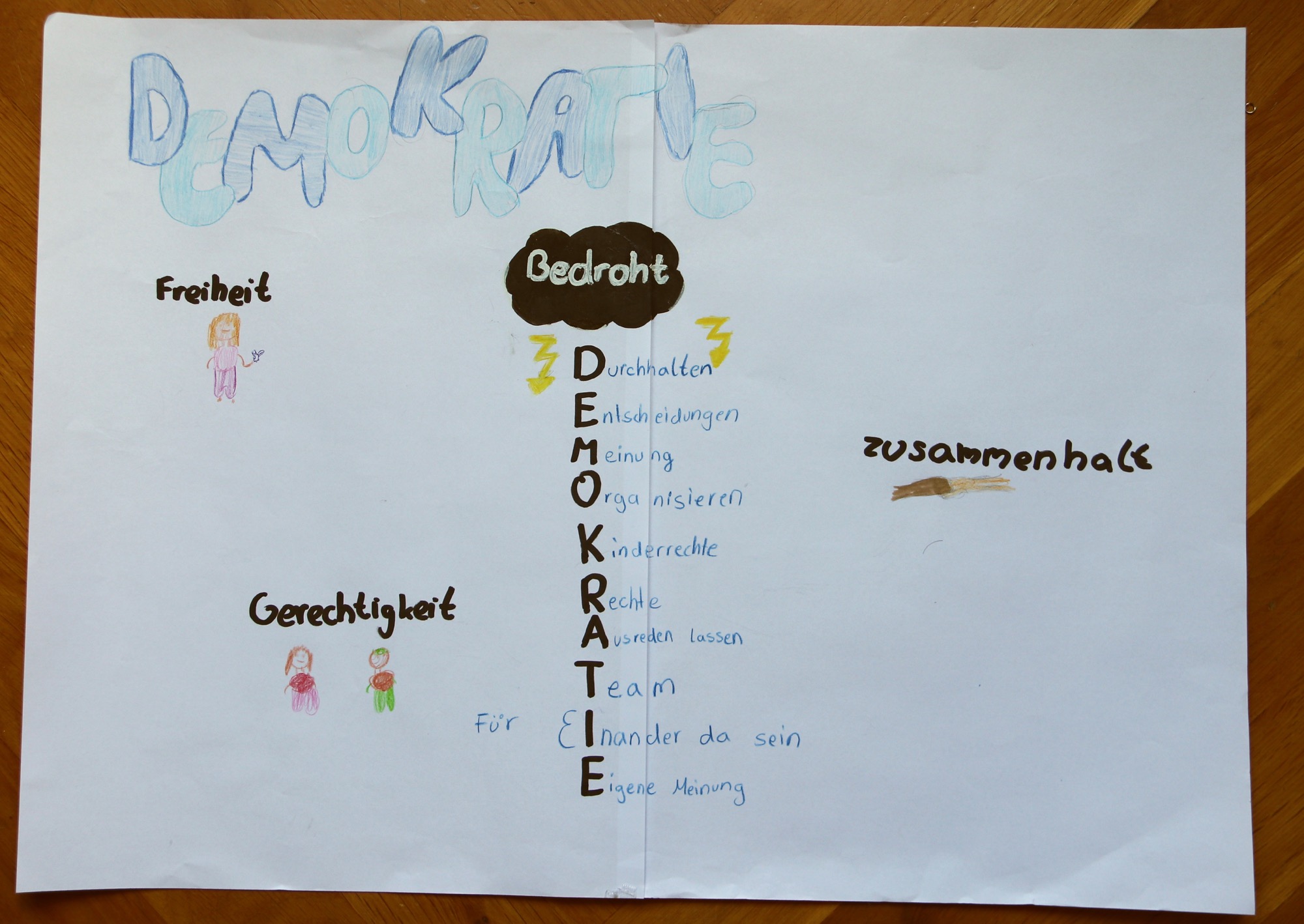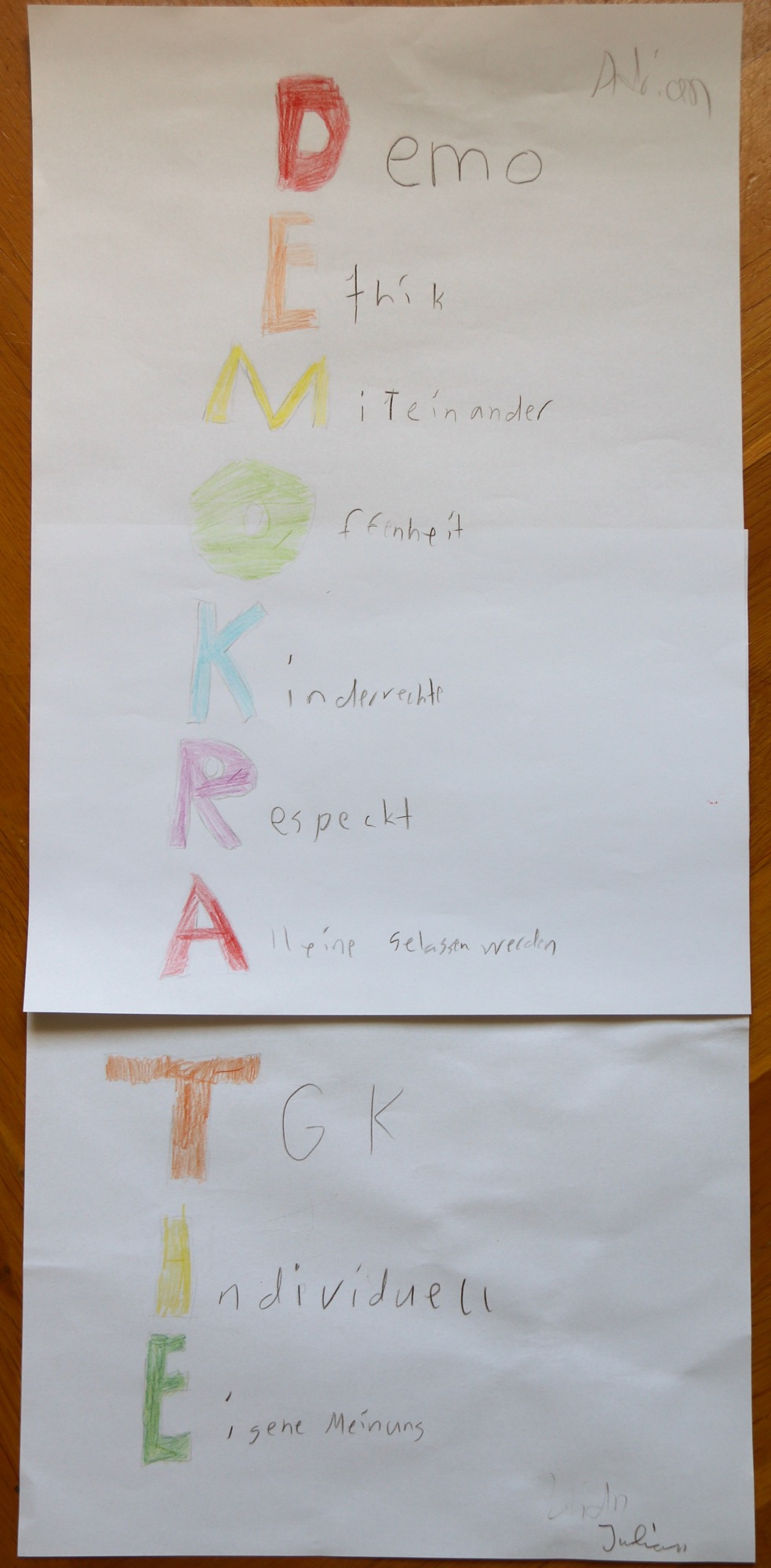 Zusätzlich entstand als bleibendes Symbol eine Wand im Schulgebäude mit den Assoziationen der Schülerinnen und Schüler zum Thema „Demokratie und Vielfalt bedeutet für mich…“. Auf Arbeitsblättern, die von den Lerndenden oft liebevoll ausgestaltet wurden, kam zum Ausdruck, was für jede Einzelne und jeden Einzelnen Demokratie und Vielfalt bedeutet.