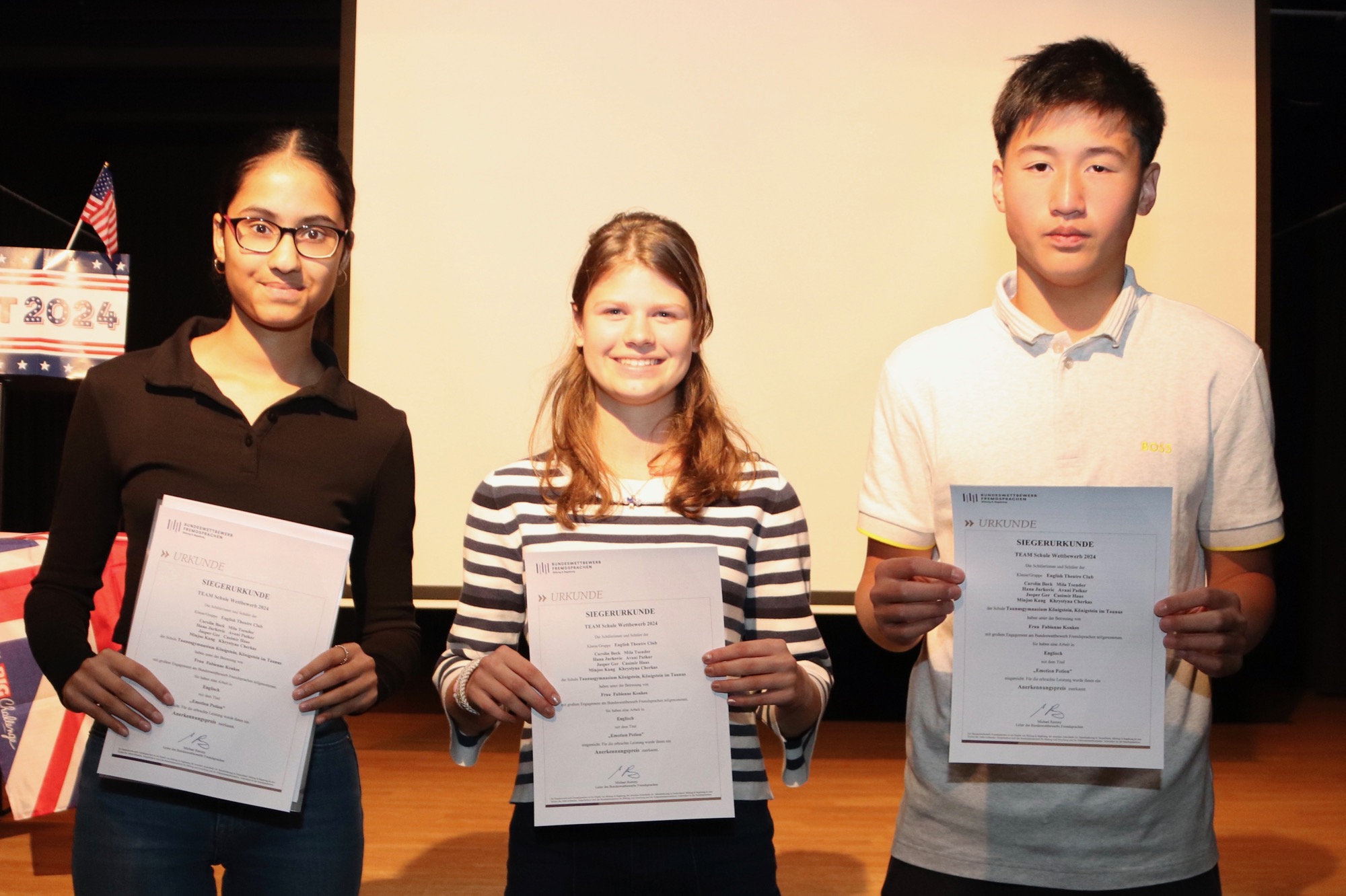 Bei dieser Gelegenheit wurden auch noch Urkunden für die erfolgreiche Teilnahme am Bundeswettbewerb Fremdsprachen überreicht: Der English Theatre Club des Taunusgymnasiums bekam mit seinem Beitrag „Emotion Potion“ unter Leitung von Frau Koukes einen Anerkennungspreis zuerkannt. Great!