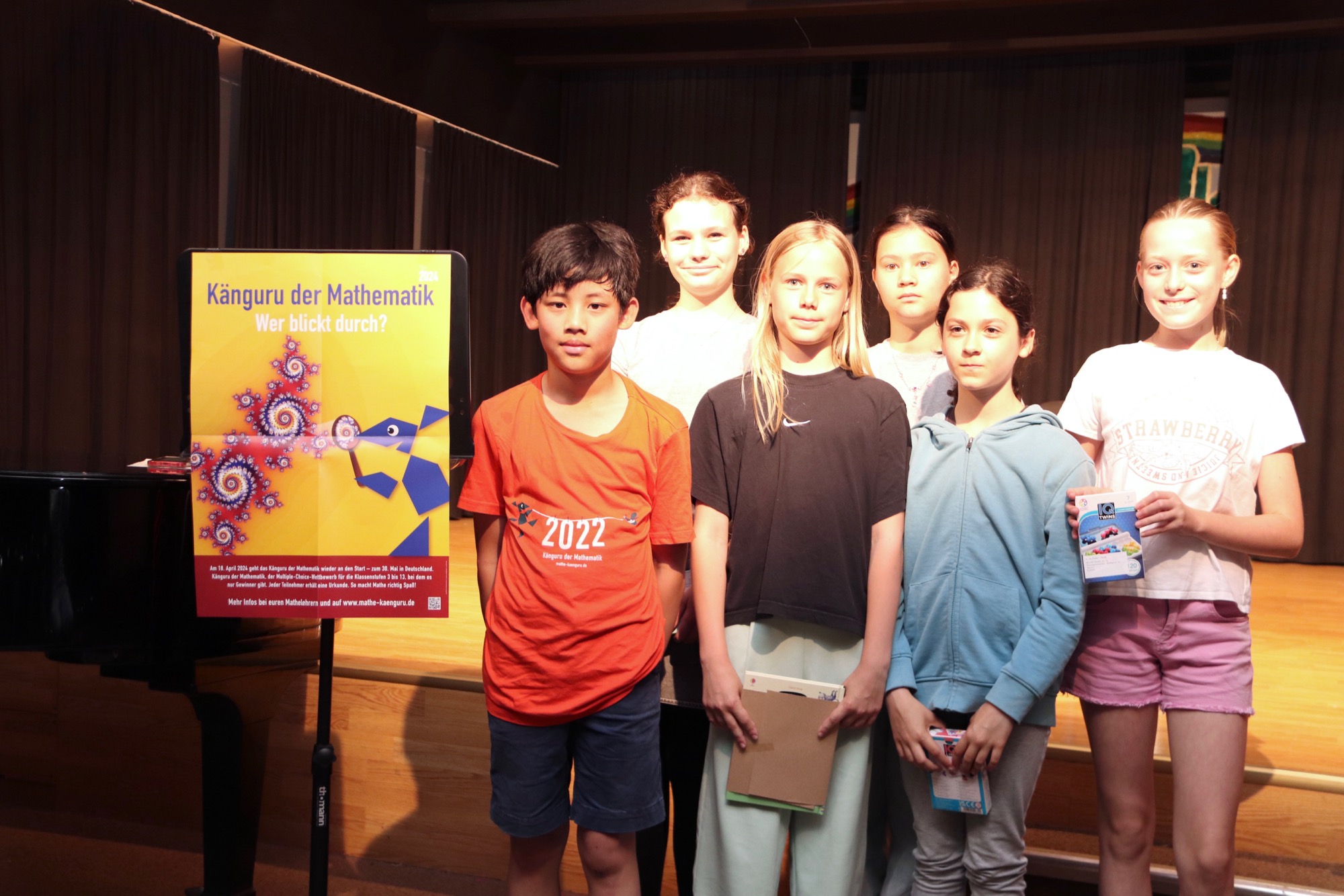 Ebenfalls ausgezeichnet wurden die erfolgreichen Teilnehmer der Mathematik-Olympiade. Sie hatten von Herrn Eichberger ihre prestigeträchtigen Urkunden bereits zuvor erhalten. Zu den Preisträgern zählten Alexander Shevchuk (5f), Hannah Schwarze (6e), Alexander Wang (7f), Simon Gaulke (8g) und Kira Hollstegge (E2). Alle fünf kamen unter die besten 20 ihres Jahrgangs in ganz Hessen. Kira Hollstegge gelang es sogar, hessenweit in ihrem Jahrgang den 1. Platz zu belegen.