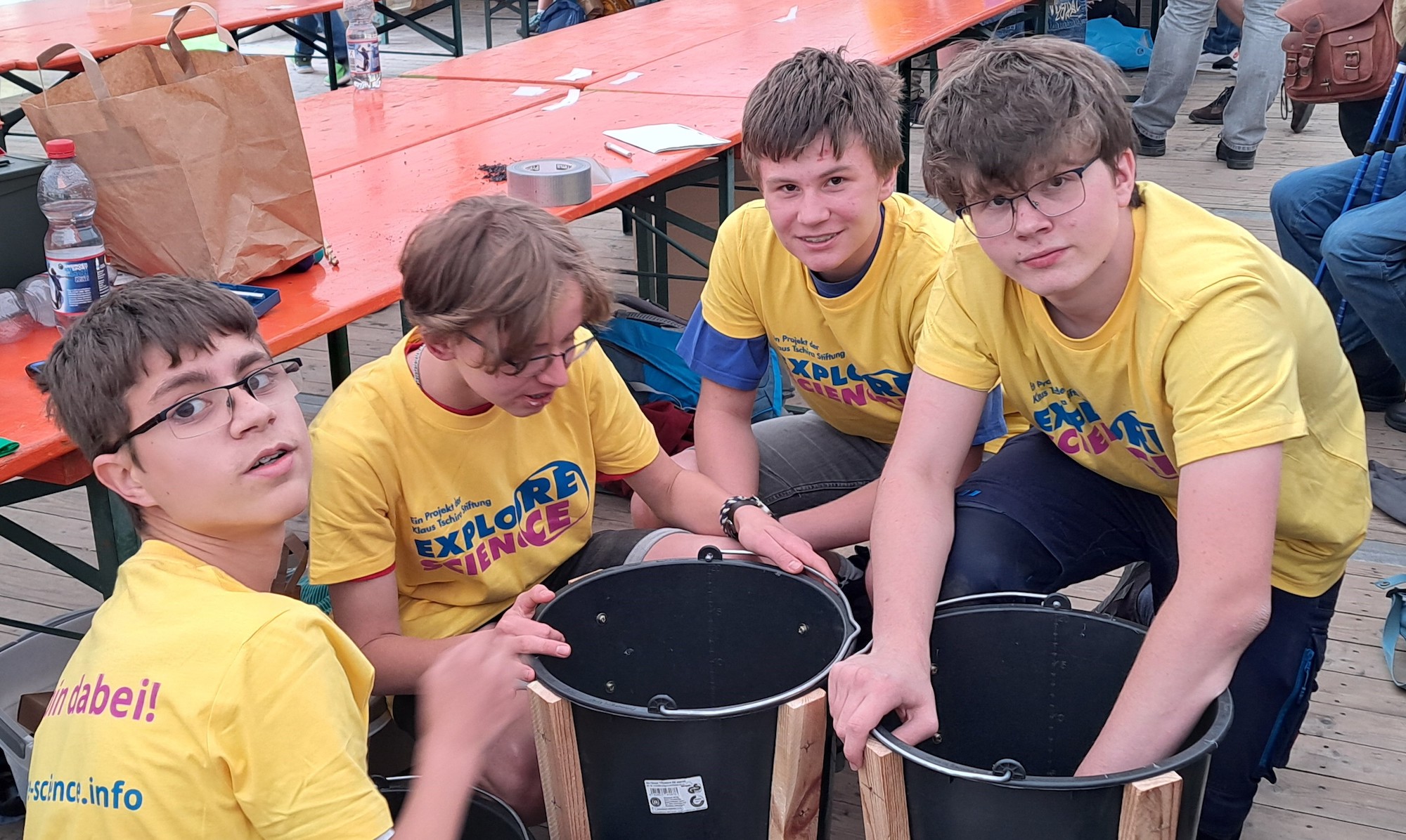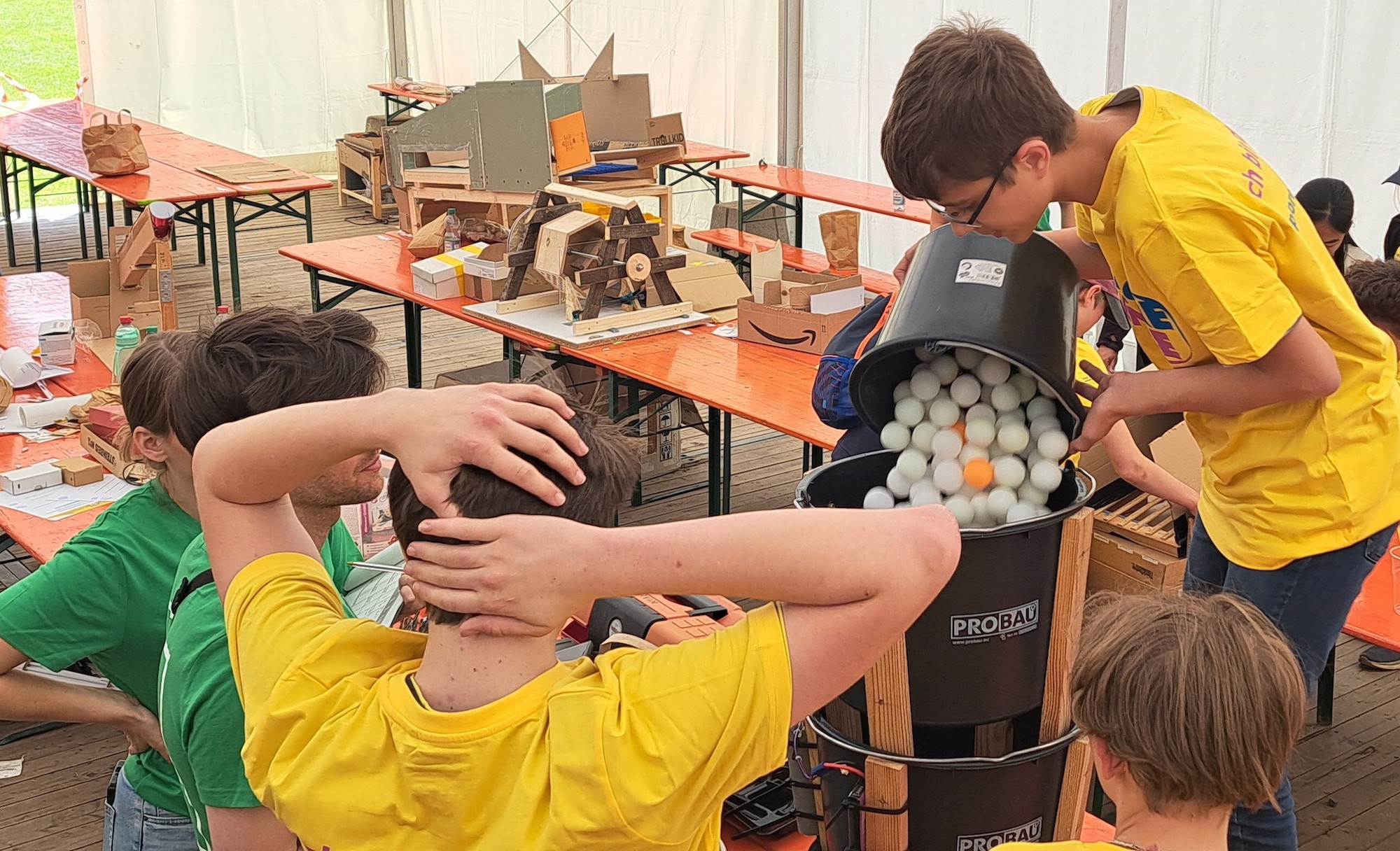 Aufgabe war es, ein 3-komponentiges Gemisch von je 100 Teilchen möglichst schnell, genau und ohne Fremdeinwirkung zu trennen. Unser Team hat sich für Tischtennisbälle, Murmeln und Stahlkugeln entschieden – alles Kugeln, um eine schnelle Bewegung zu ermöglichen. Als Siebe fungierten gelochte Eimer, getrennt durch „Holzbeine“ und gerüttelt durch einen Unwucht-Motor.