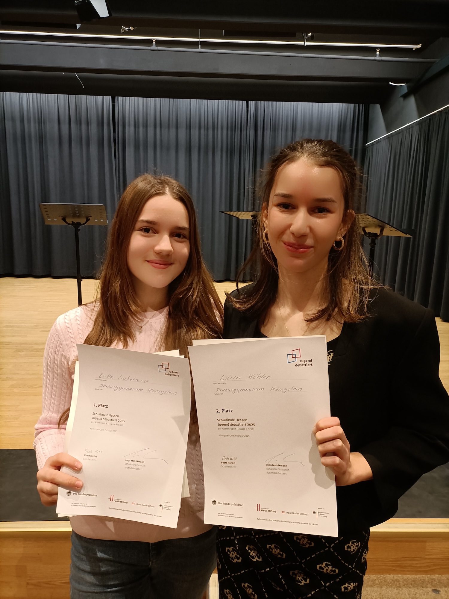 Erika Ciubotaru (9g) hat den Schulwettbewerb der Altersstufe 1 des Taunusgymnasiums gewonnen. Sie konnte die Jury durch ihre Leistung bei der Finaldebatte am meisten überzeugen und sich damit vor Lilien Köhler (10e), Alexander B. (10d) und Maya Prskawetz (10c) platzieren.