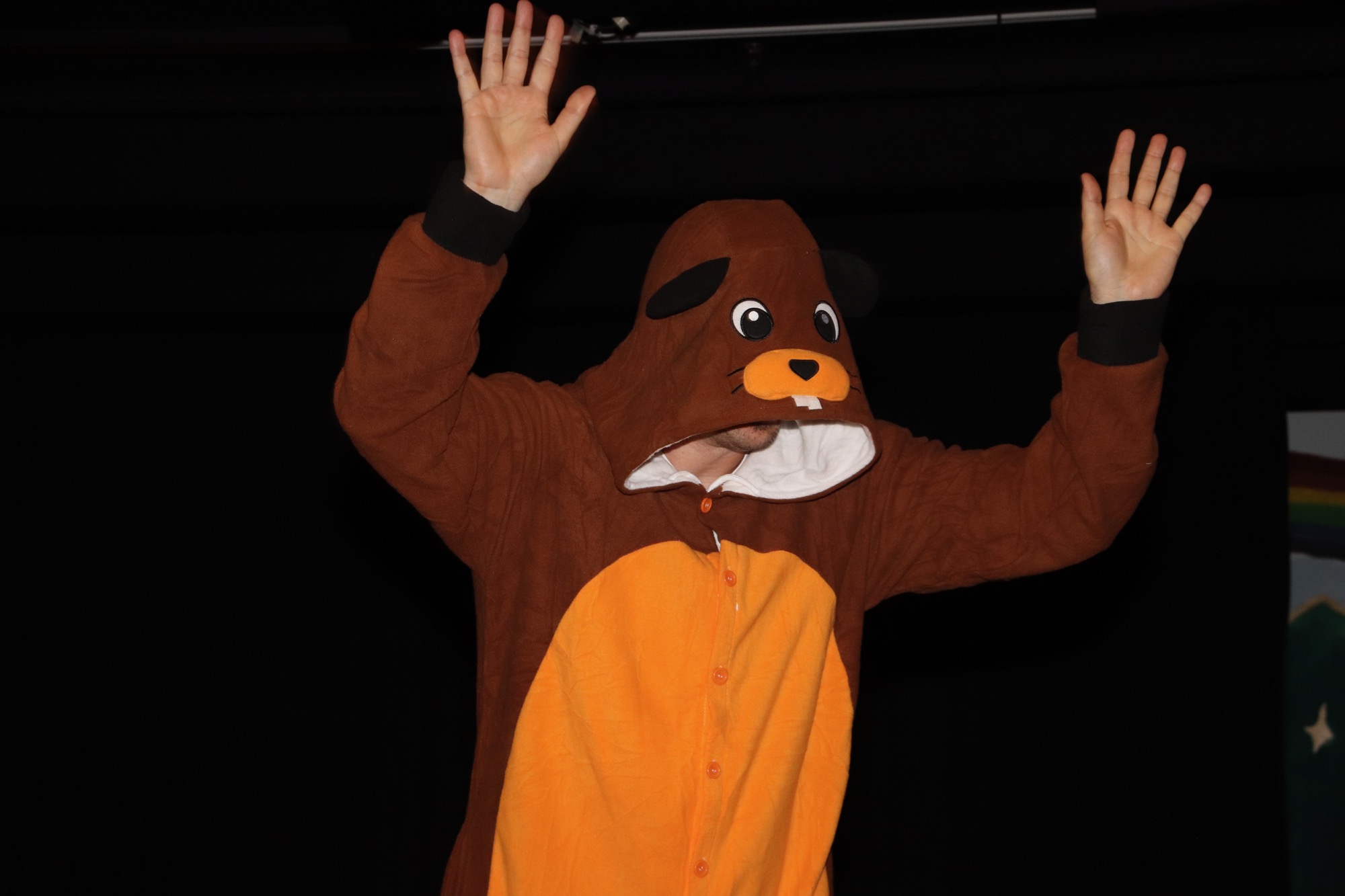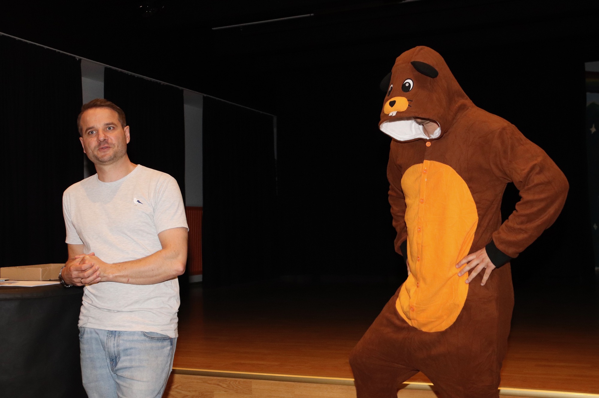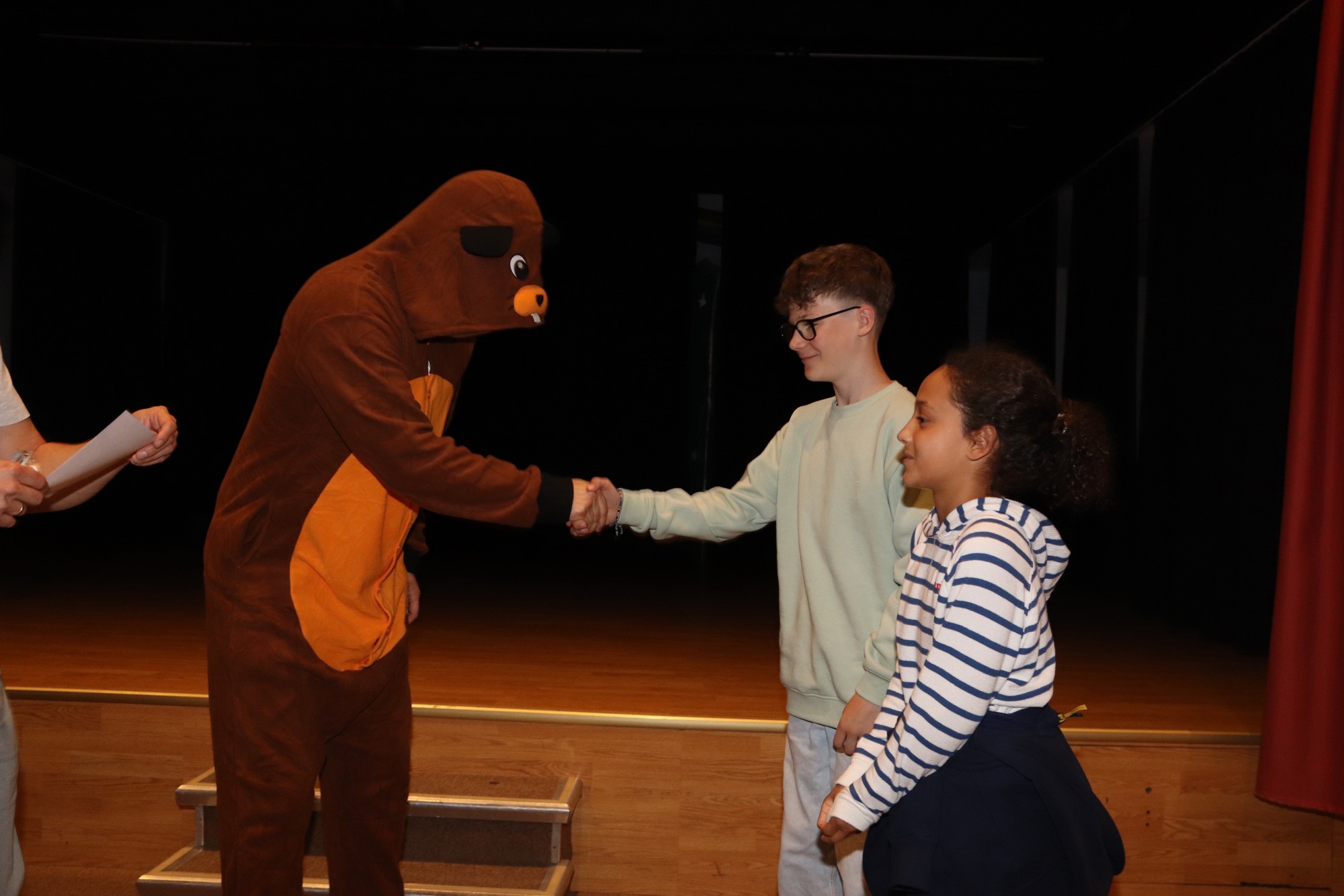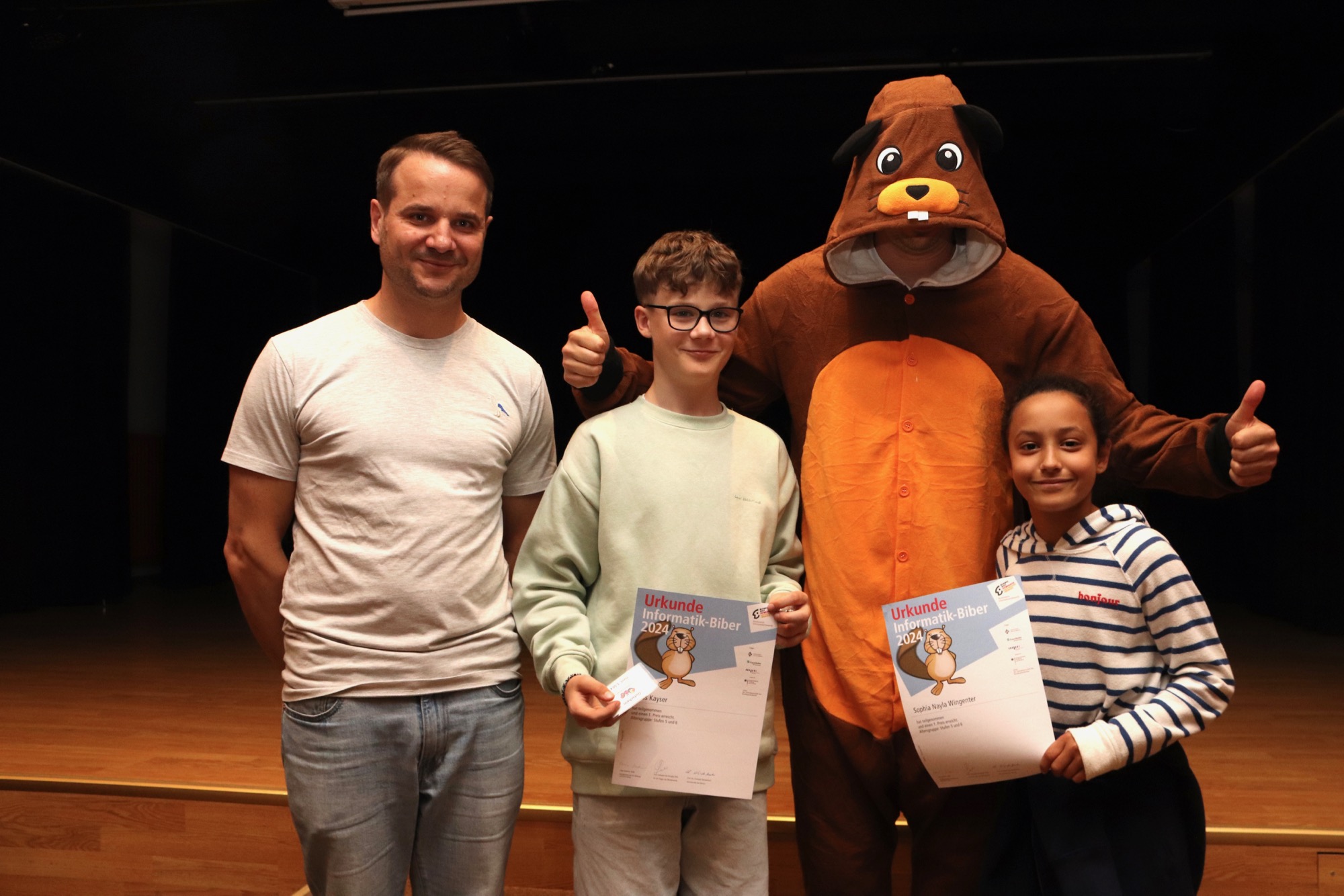 Die Preisverleihung fand nun im Theaterraum statt: Herr Langner und als Überraschungs-Stargast der Informatik-Biber höchstpersönlich ehrten die erfolgreichsten Teilnehmenden; dabei wurden neben Urkunden auch Sachpreise vergeben. So erhielten die 2. Plätze einen Informatik-Biber-Schlauchschal; die 1. Plätze nahmen eine hochwertigen USB-Stick in Empfang. Weitere Preise stiftete das WoB – die Sieger erhielten jeweils Gutscheine für Leckereien des World of Breakfast.