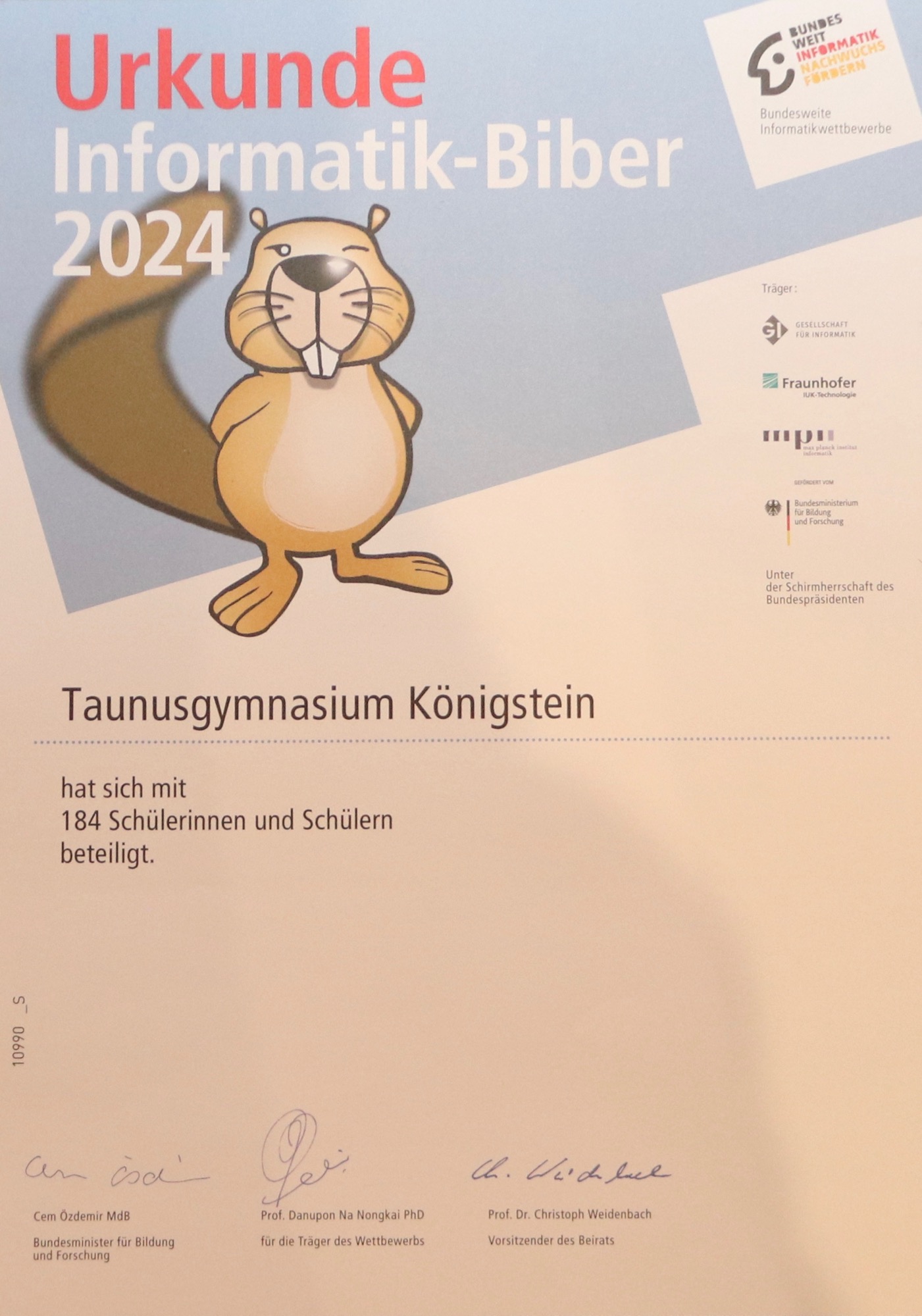 Mit insgesamt 184 Teilnehmerinnen und Teilnehmern aus allen Jahrgangsstufen des Taunusgymnasiums erfuhr der bundesweite Wettbewerb „Informatik-Biber“ in diesem Schuljahr wieder regen Zuspruch. Vor allem in den Jahrgangsstufen 5 bis 8 entstand eine regelrechte Welle die Begeisterung, die die Durchführung des Wettbewerbs zu einem „Klassenevent“ werden ließ. Hier erreichte die Klasse 5f ein besonders gutes Ergebnis und stellte viele der neuen Siegerinnen und Sieger.