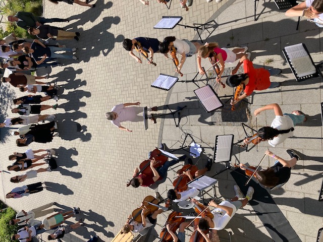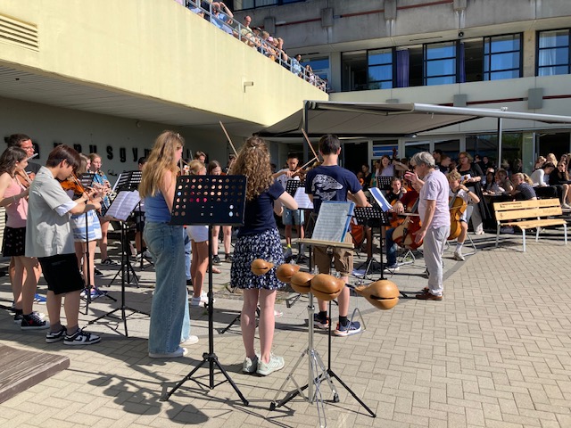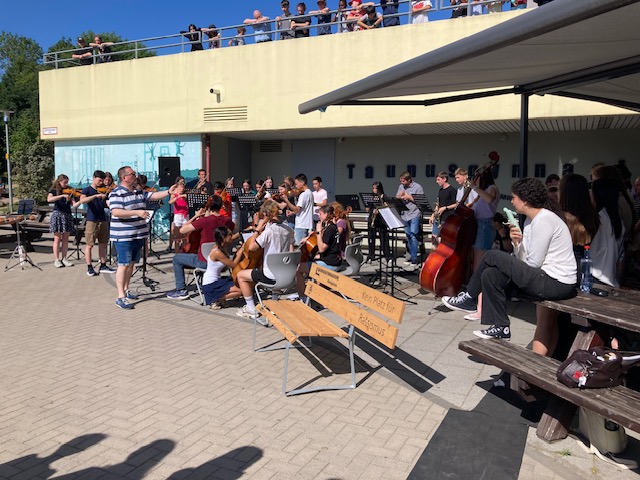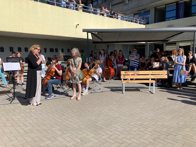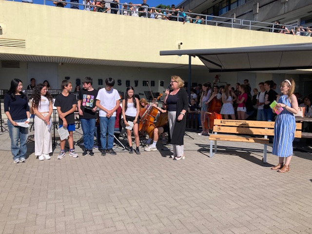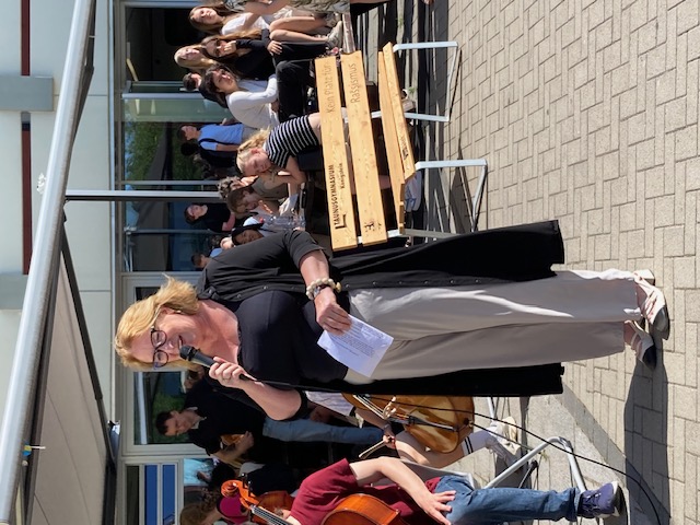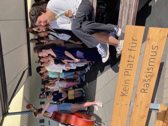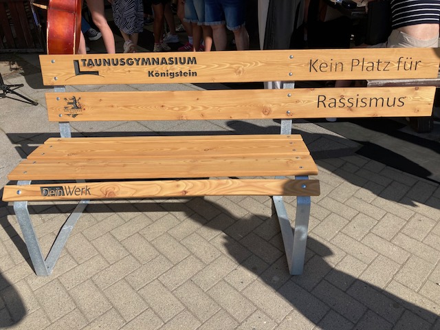 Ein besonders beeindruckender Programmpunkt waren Aufstellung und Einweihung einer Bank gegen Ausgrenzung, gestiftet vom Hochtaunuskreis. Dieser Bank fehlt ein Teil der Sitzfläche, es gibt dort „keinen Platz für Rassismus“, wie Sabine Schleiermacher von der Leitstelle Integration des Hochtaunuskreises betonte. Wie wichtig Integration ist und wie bedrückend die Erfahrung der Ausgrenzung, machten die Erfahrungsberichte von Schülerinnen und Schülern deutlich, die sie während der Pause auf dem Schulhof vortrugen. Doch es gab auch kluge Gedanken zu Gerechtigkeit, ebenfalls von Schülern ausgesprochen. Musikalisch umrahmt wurde die Einweihungsfeier vom Orchester und großen Chor des Taunusgymnasiums mit verschiedenen Stücken und abschließend der Ode an die Freude. Dazu schien die Sonne auf Musizierende und Zuschauer, so dass nur ein Rückschluss möglich ist: Petrus ist auch für Vielfalt und Demokratie!