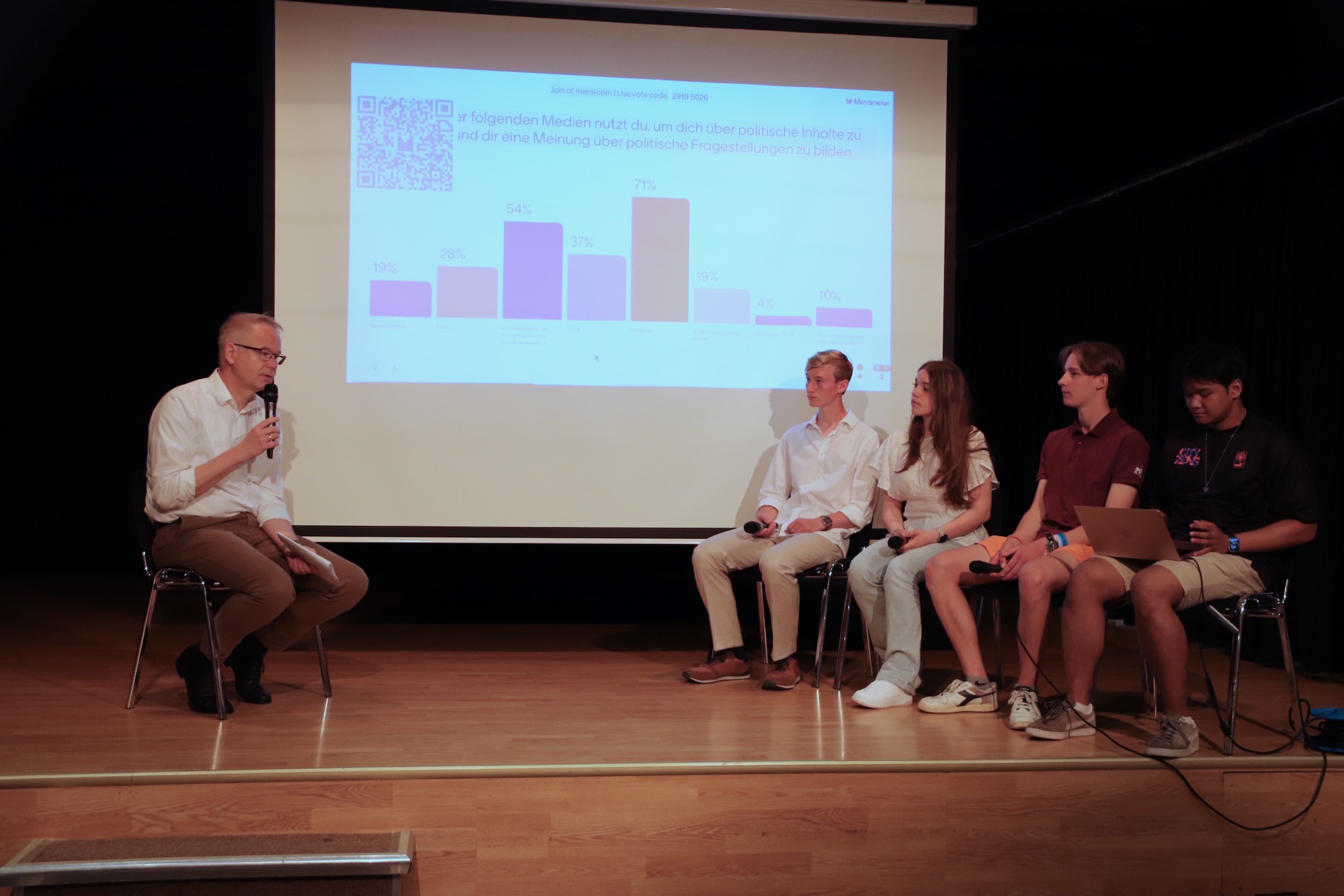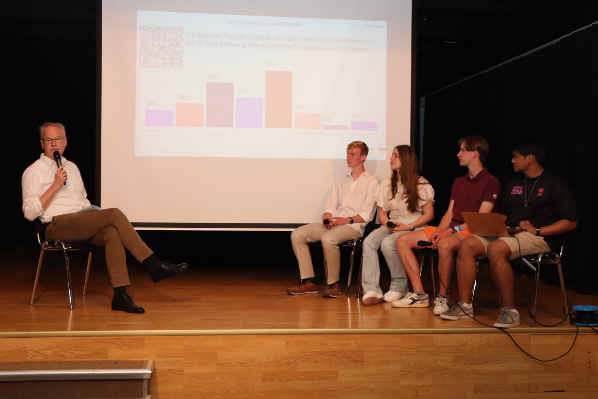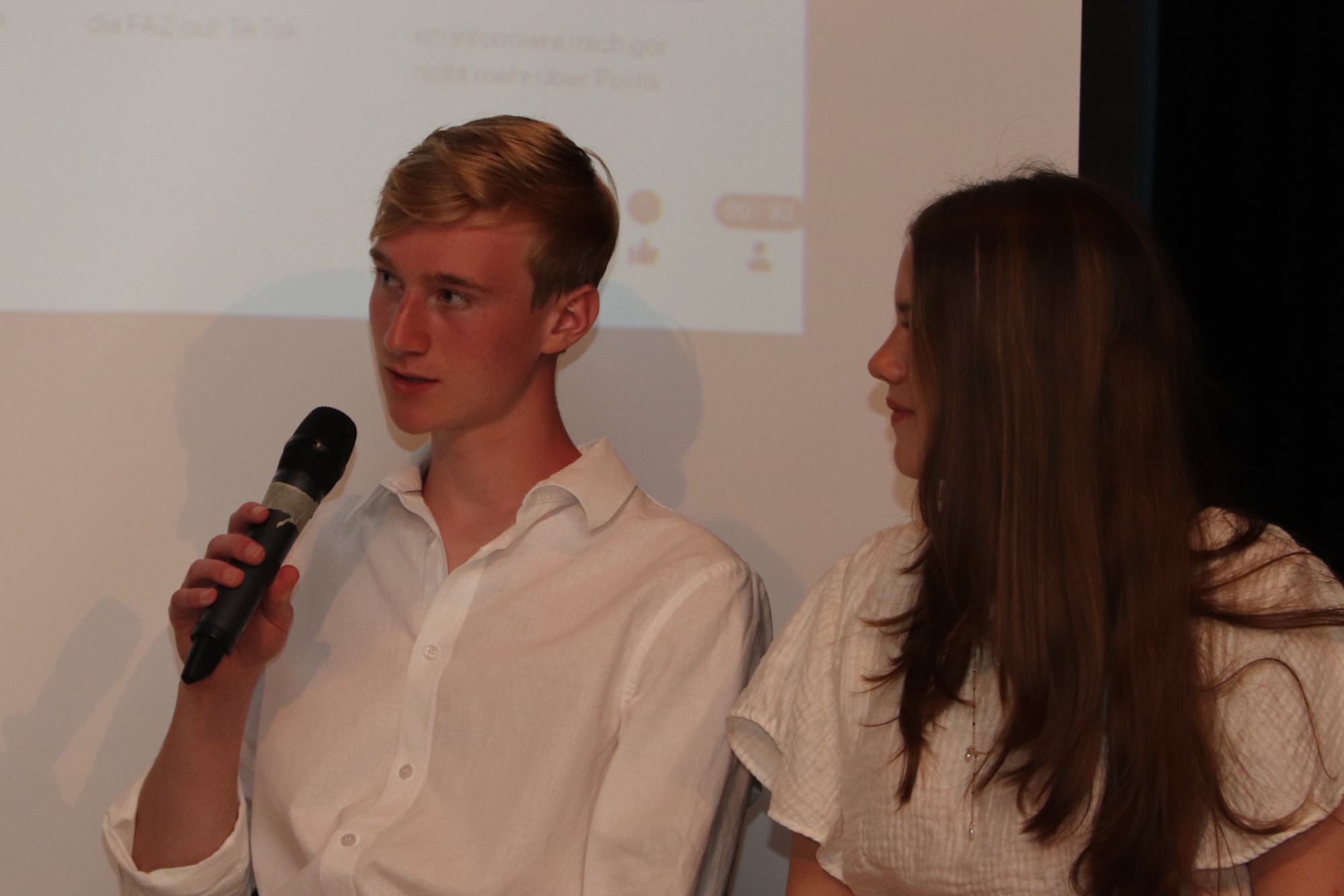 Ein besonderes Highlight: FAZ-Herausgeber Carsten Knop diskutierte mit den Schülerinnen und Schülern der Q-Phase, welche Rolle Medien für die Meinungsbildung und Demokratie spielen, und zeichnete ein alarmierendes Bild des Einflusses von sozialen Netzwerken wie TikTok und Instagram im Vergleich zu traditionellen Qualitätszeitungen. Auch die Bürgermeisterin von Königstein, Beatrice Schenk-Motzko, war anwesend und schilderte den Schülerinnen und Schülern, wie wichtig Demokratie ist – und wieviel Arbeit dahinter steckt.