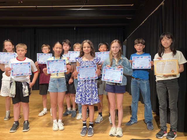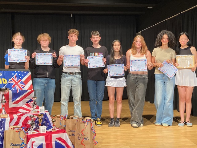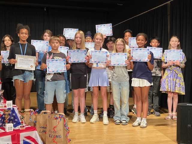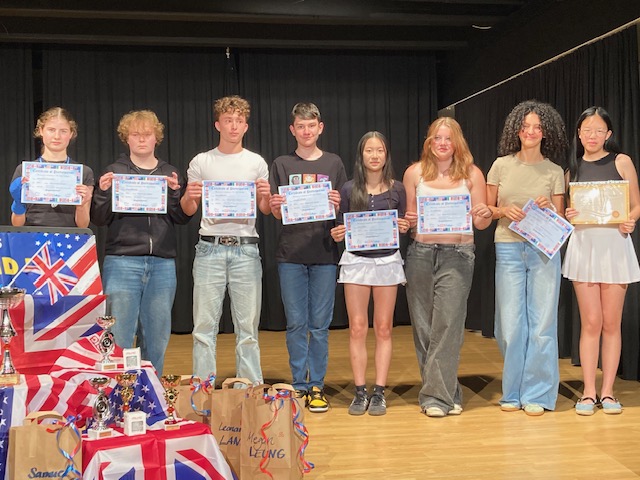 Aus allen teilnehmenden Klassen waren die drei Erstplatzierten in unseren Theaterraum am Mittwoch, 18.06.2025, eingeladen.  Mit viel Einsatz und Sprachkompetenz haben sie schöne Ergebnisse erreicht und nahmen stolz ihre Zertifikate von Frau Pfeifer entgegen. Die Englischlehrkräfte erwarteten sie schon mit einer Auswahl an attraktiven Preisen bei den jeweiligen Klassenpreisverleihungen. Außerdem überreichte Frau Pfeifer Spezialpreise an unsere Stufensieger.