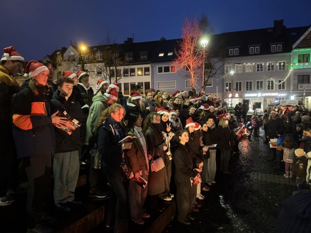 Am ersten Adventssonntag verwandelte sich der Königsteiner Kapuzinerplatz in einen großen Konzertsaal unter freiem Himmel: Mehr als 300 Gäste folgten der Einladung der Chorgemeinschaft 1860 zum „Sing-Along“. Mit dabei waren auch rund 40 Schülerinnen und Schüler der Jahrgangsstufen 9 bis Q1 der „Taunus Tunes“ unter der Leitung von Herrn Franke. Ein besondere Herausforderung war die Generalprobe für das anstehende Weihnachtskonzert des TGKs. Aufgrund des großen Andrangs auf dem Platz mussten Chor und Klavier den Klassiker „Carol of the Bells“ ohne Sichtkontakt miteinander aufführen. Dafür sprang Soraya Wingenter kurzfristig als Dirigentin ein, die den Chor gekonnt zusammenhielt.