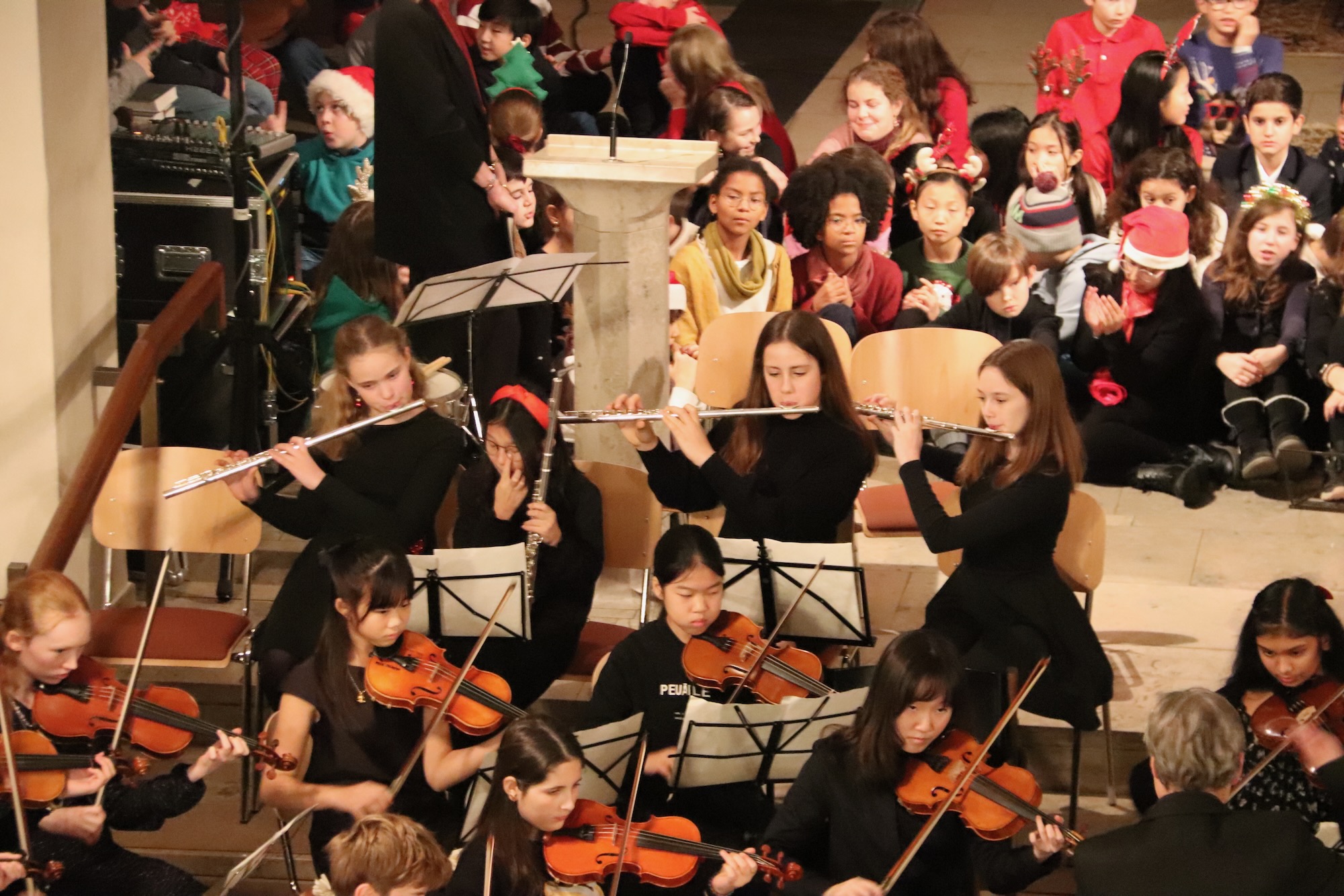 Den krönenden Abschluss bildete das Große Orchester unter der Leitung von Herrn Neubeck und Herrn Leichtfuß. Ein feierlicher Einzugsmarsch leitete das Finale ein, bevor das Orchester mit „Winter Wonderland“ noch einmal die winterliche Atmosphäre beschwor. Das absolute Highlight wartete zum Schluss: Ein Christmas-Sing-A-Long, bei dem die bekannten Melodien von „Joy to the World“, „Herbei, oh ihr Gläub'gen“, „Hark! the Herald Angels Sing!“ und „O du fröhliche!" zu einem mitreißenden Medley verbunden wurden. Hier vereinten sich alle musikalischen Kräfte des Abends mit den Stimmen des Publikums – ein wahrlich stimmungsvoller und harmonischer Moment.