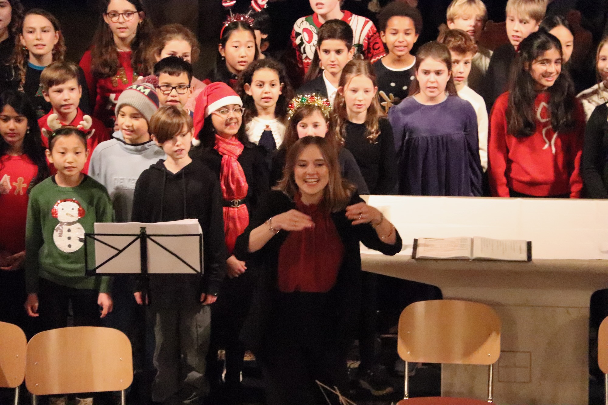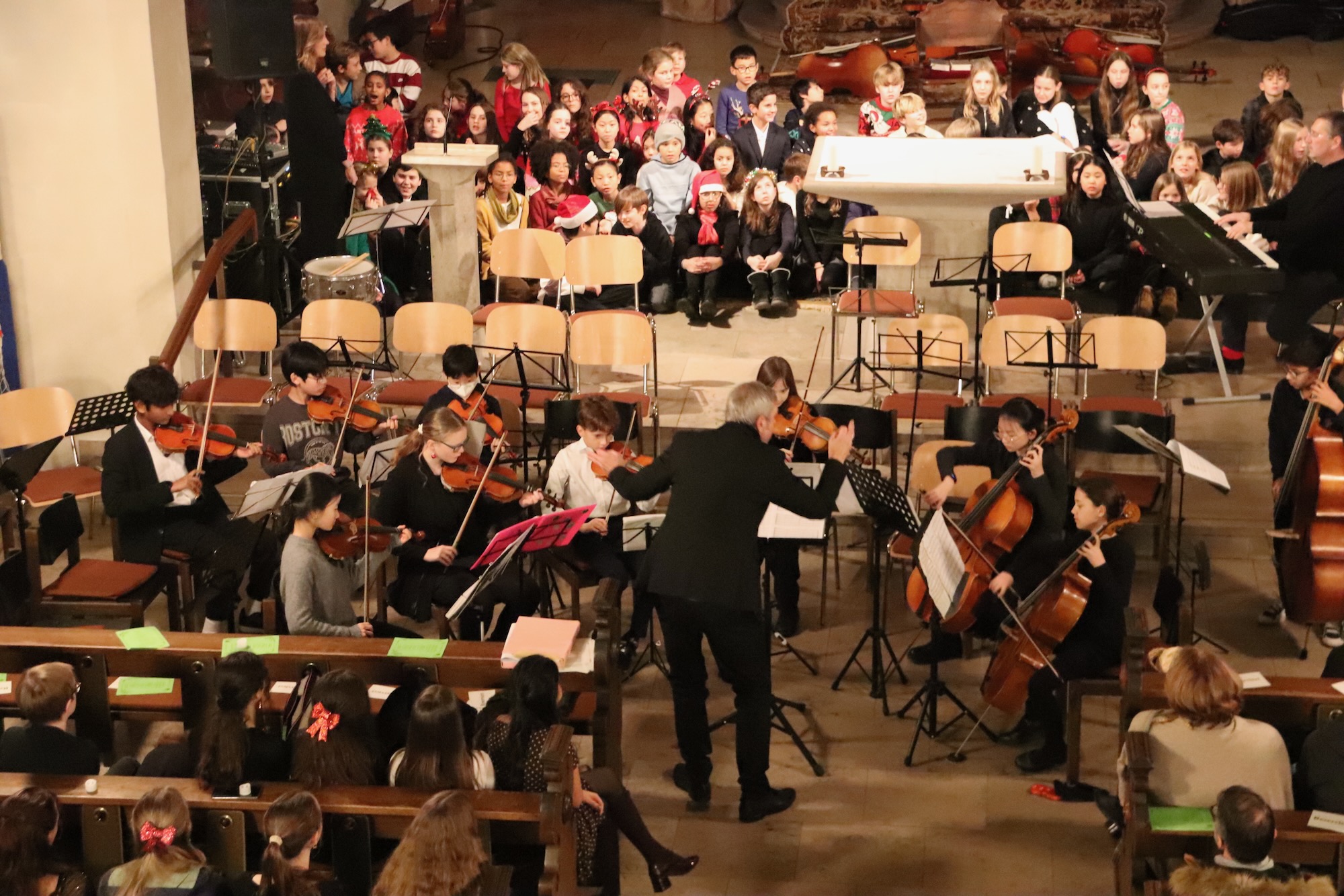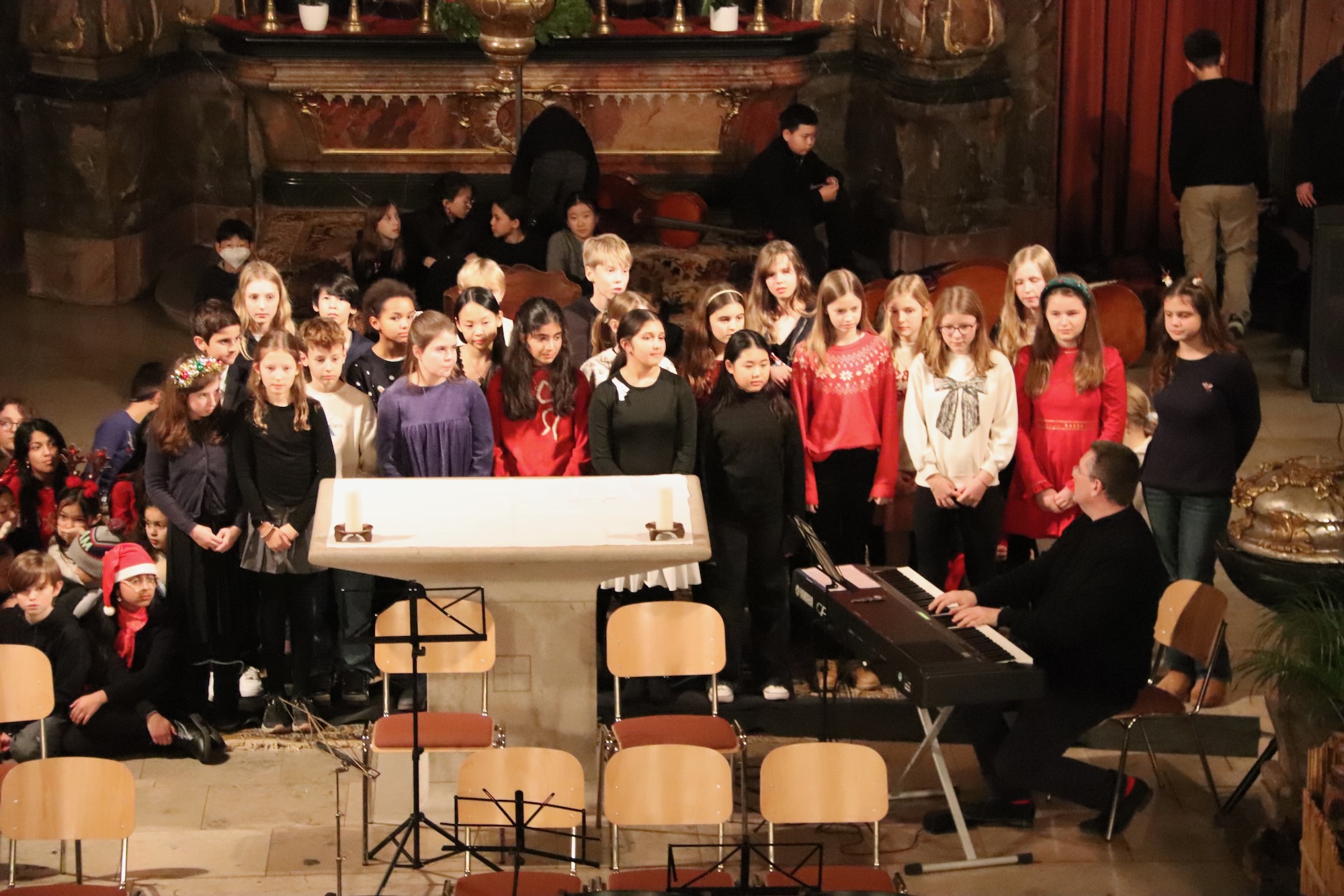 Der Kleine Chor, geleitet von Frau Büttner, eröffnete seinen Auftritt mit „Rudolph, The Red.Nosed Reindeer“ als Einlauflied, gefolgt von „Snow On Snow“. Die Kinder füllten mit ihrer Stimmgewalt den sakralen Raum mühelos aus. Mit „Leise rieselt der Schnee“ und dem temperamentvollen „Feliz Navidad“ spannen sie einen musikalischen Bogen von deutscher Tradition bis zu lateinamerikanischer Lebensfreude – und rissen das Publikum sichtlich mit.