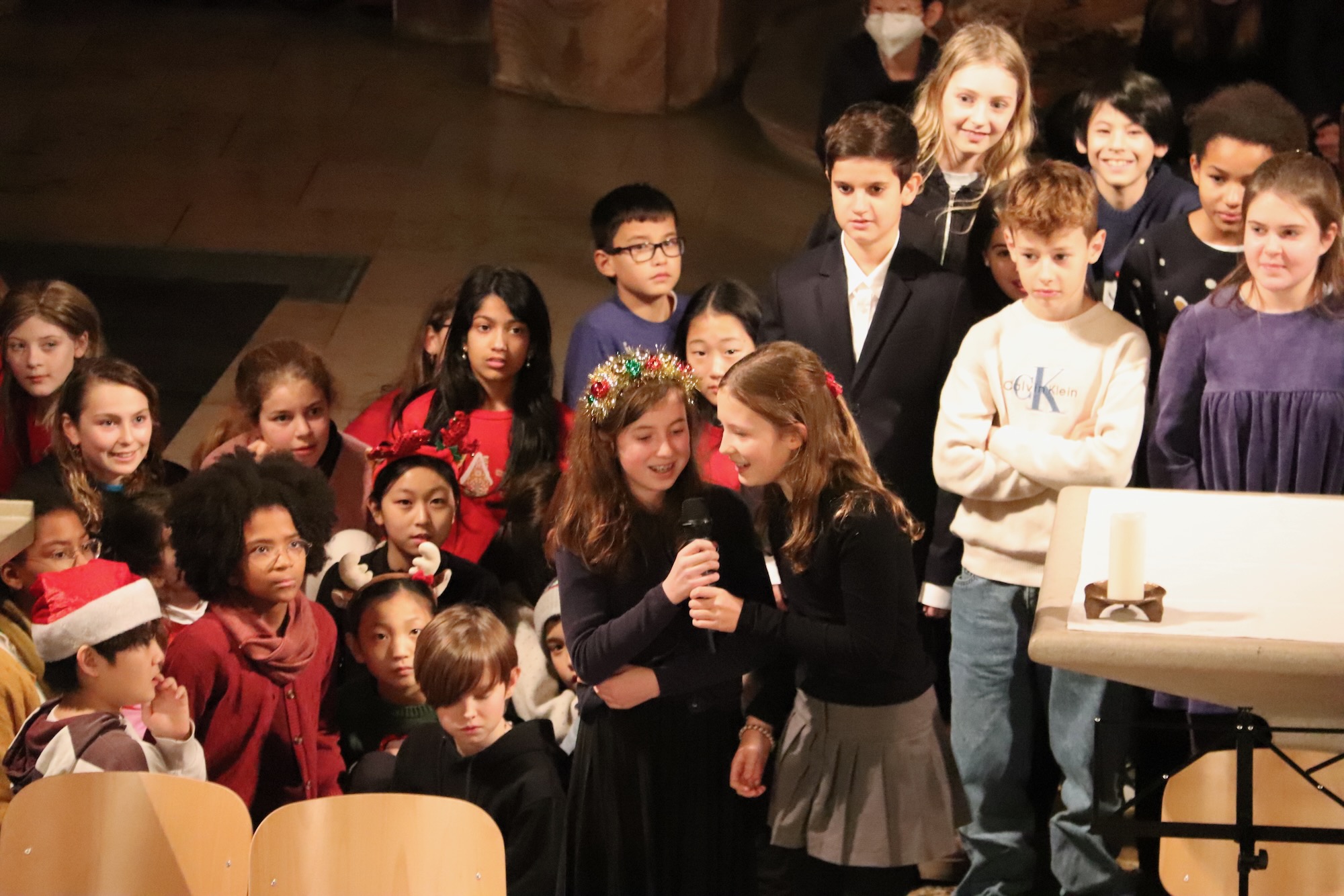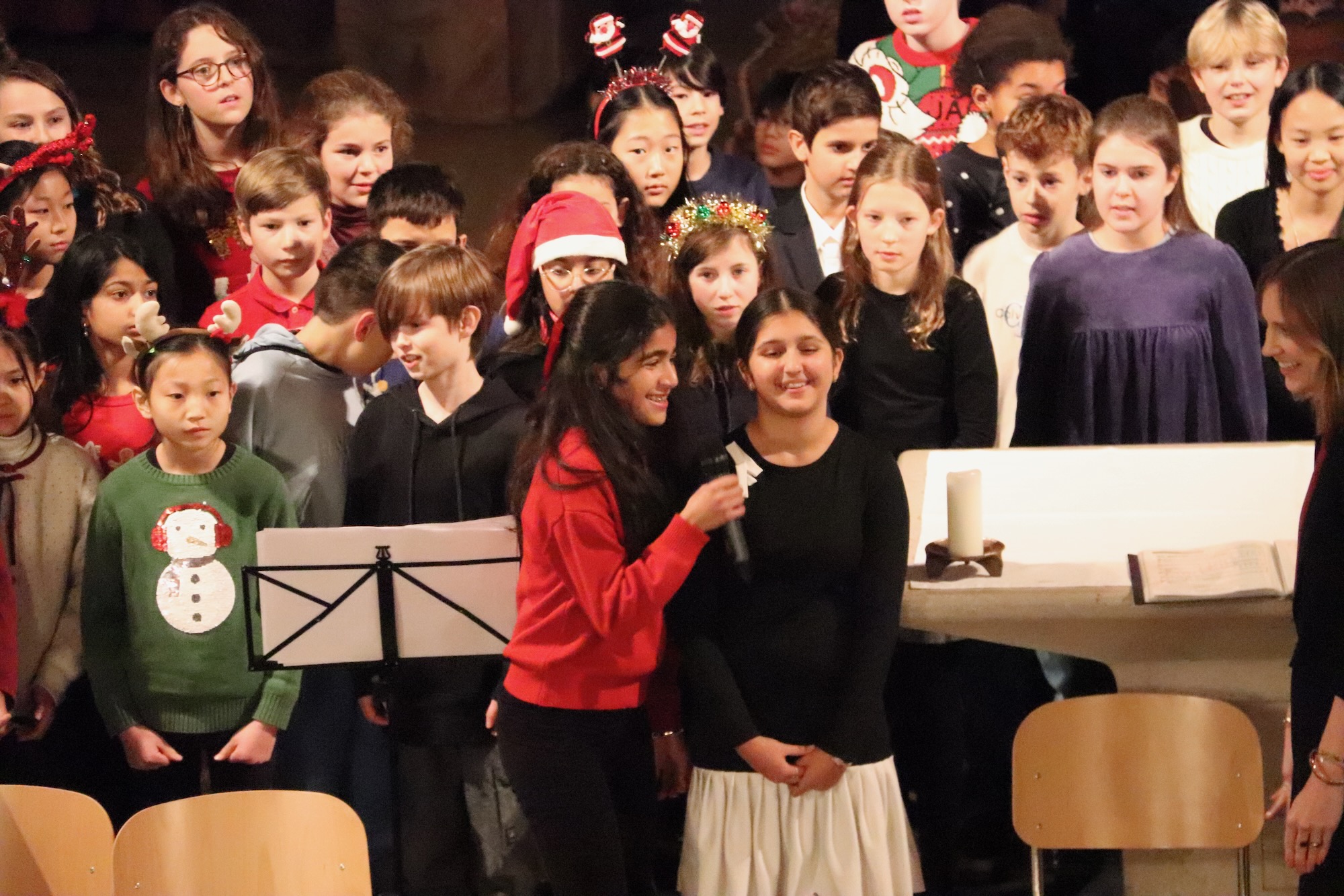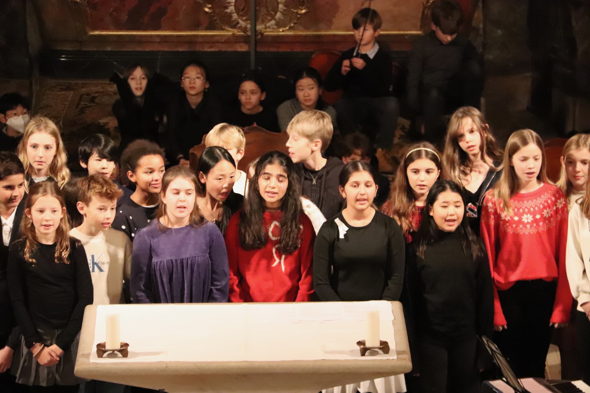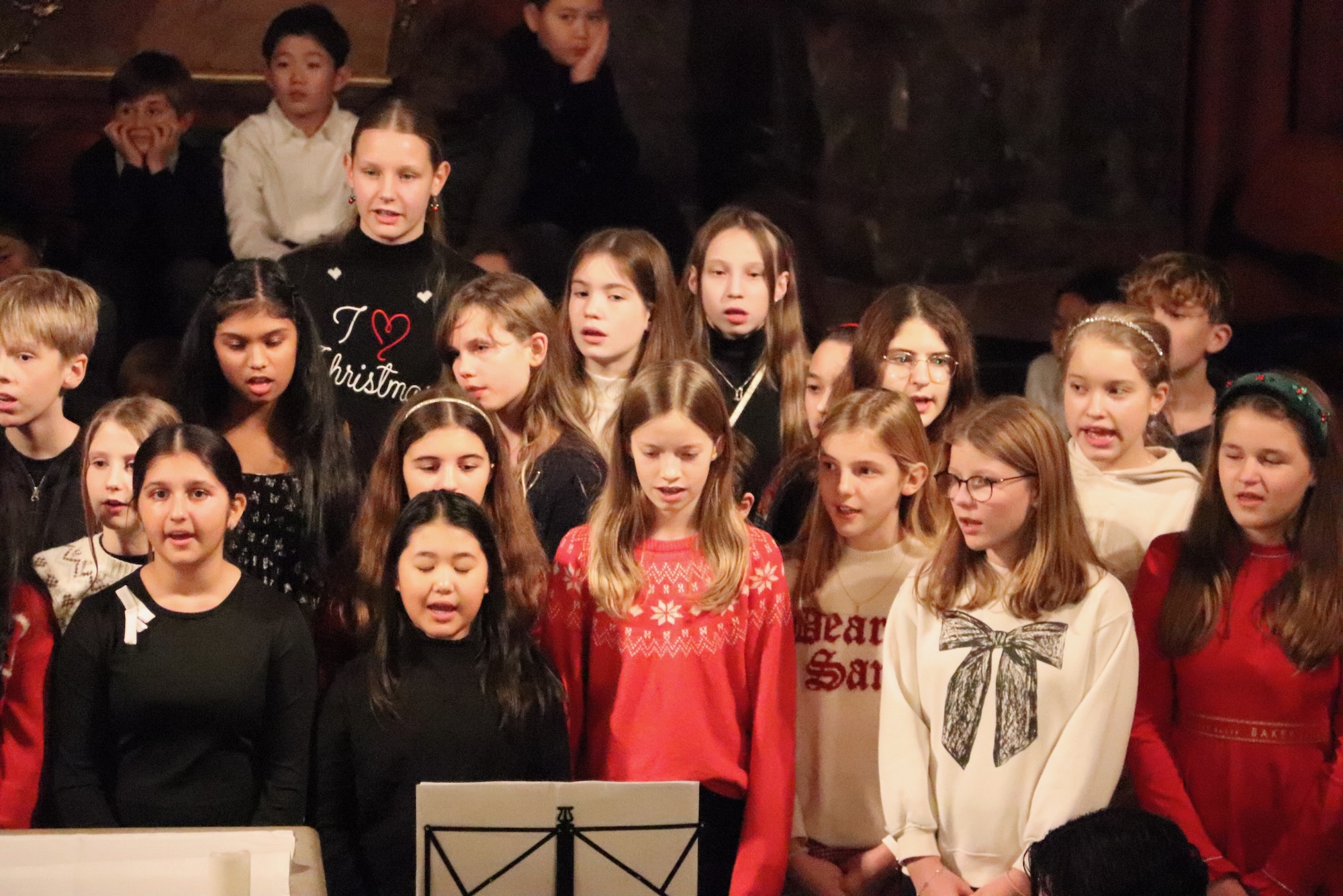 Festliche Chorklänge erfüllten die Kirche, als die Gesangsklasse 6 unter der Leitung von Herrn Leichtfuß auftrat. Mit „Winter Wonderland“ und dem traditionellen Wiegenlied „Still, Still, Still“ demonstrierten die Sechstklässlerinnen und Sechstklässler, wie sicher sie bereits singen können. Die Akustik der Kirche ließ die Stimmen besonders warm und voll erklingen.