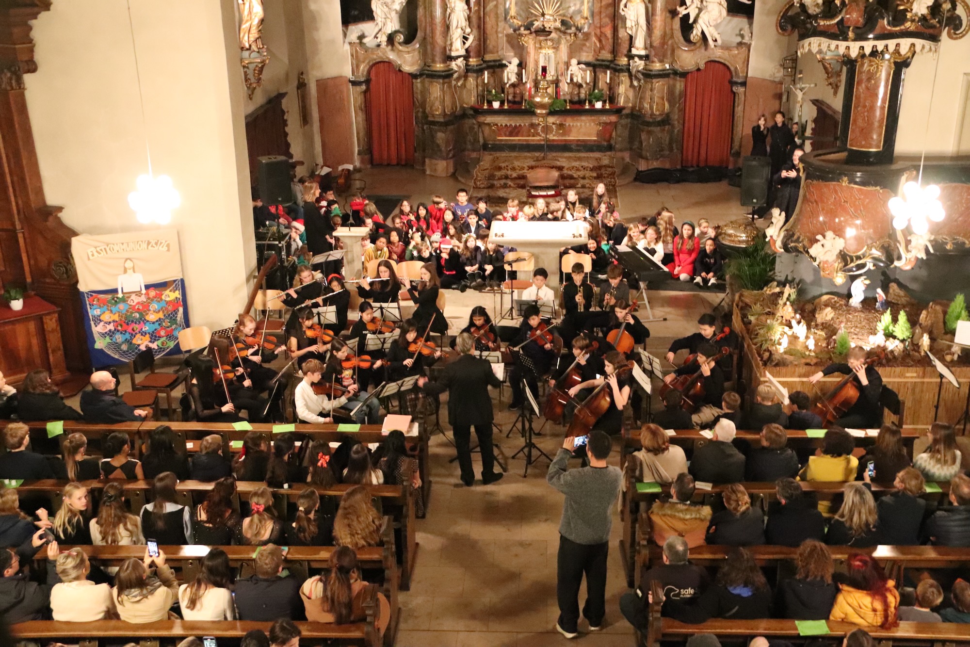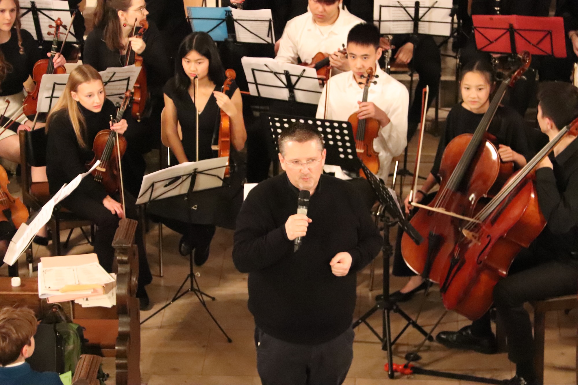 Die Kirche war bis auf den letzten Stehplatz gefüllt, als die Streicherklasse 6 unter der Leitung von Herrn Hublow das Konzert eröffnete. Mit Gasparo Zanettis „Il Ballo di Calle“ und dem Menuett aus der „Feuerwerksmusik“ von Georg Friedrich Händel bewiesen die jungen Streicher eindrucksvoll, wie viel sie in den vergangenen zwei Schuljahren auf ihren Instrumenten gelernt haben.